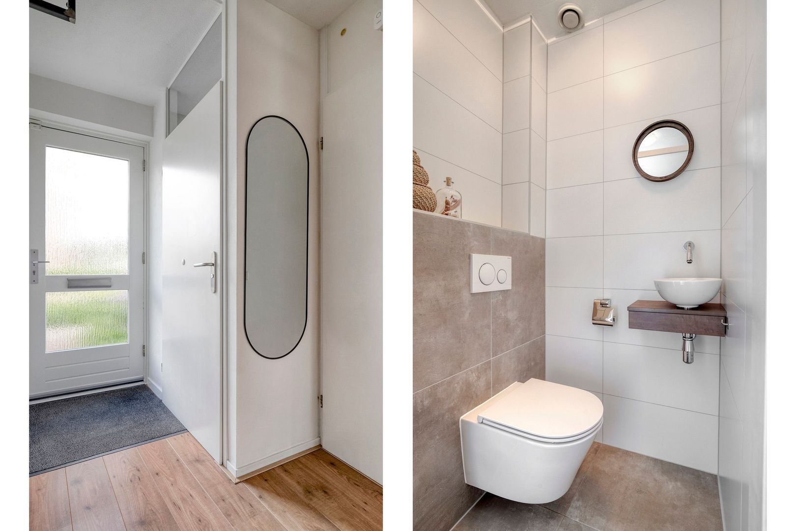 Bij binnenkomst treft u de entree met hal, waar zich de meterkast en het moderne toilet bevinden. Vanuit hier leidt de trapopgang u naar de eerste verdieping, maar eerst loopt u door naar de sfeervolle, royale woonkamer. Dankzij de uitbouw en de grote raampartijen is deze ruimte heerlijk licht, en de laminaatvloer met vloerverwarming zorgt voor extra comfort. Via de woonkamer heeft u direct toegang tot een praktische inpandige berging voor extra opslagruimte.
