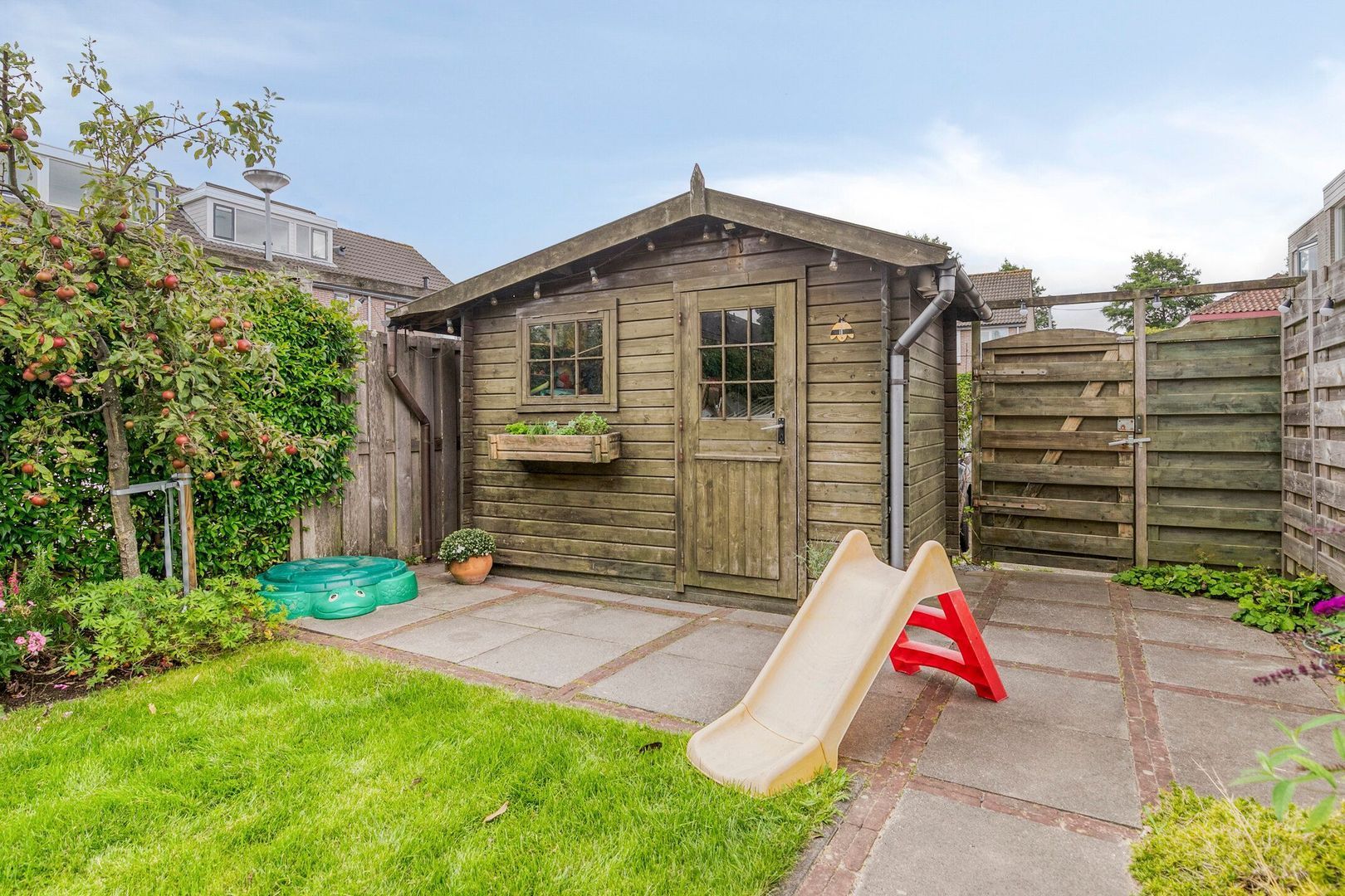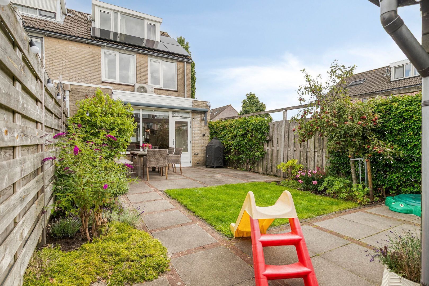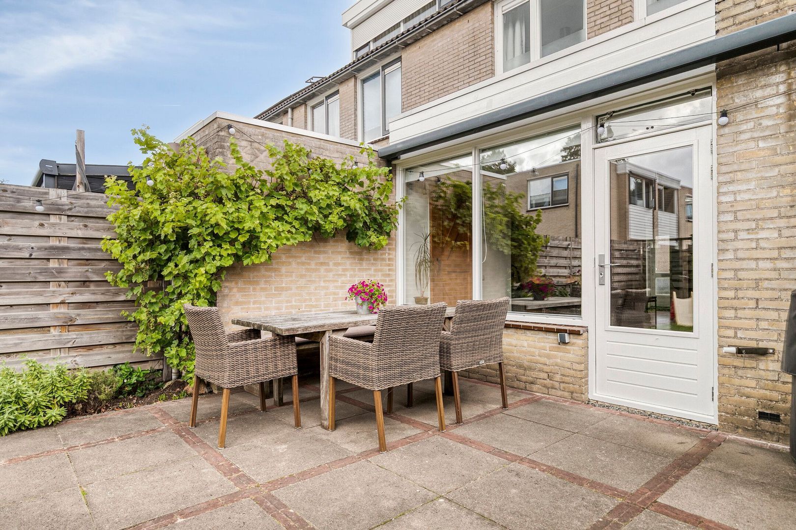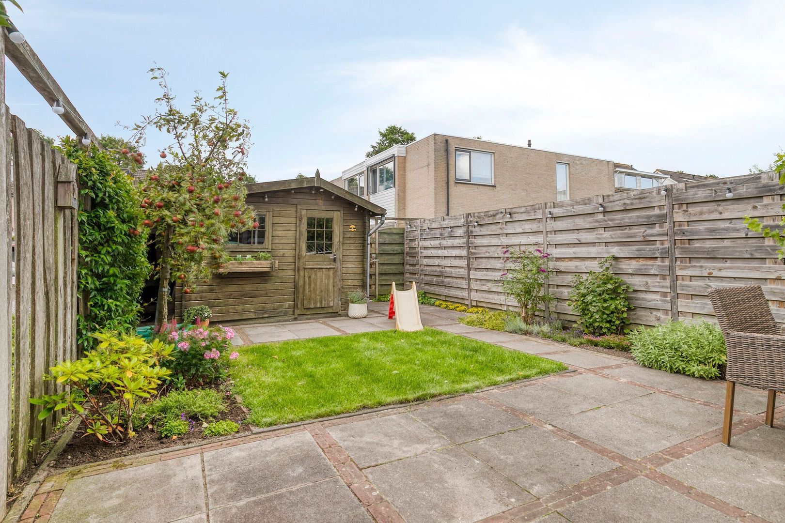 Vanuit de woonkamer loopt u direct de keurig aangelegde en onderhoudsvriendelijke achtertuin in. De tuin biedt een ruim terras om te ontspannen, beschikt over een elektrisch zonnescherm, een praktische houten berging en een handige achterom.