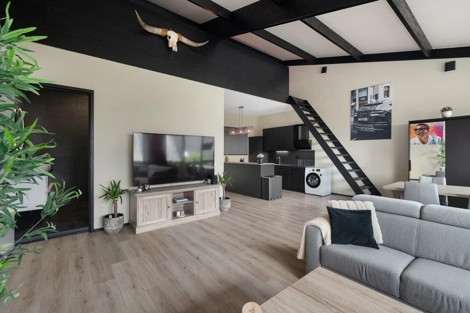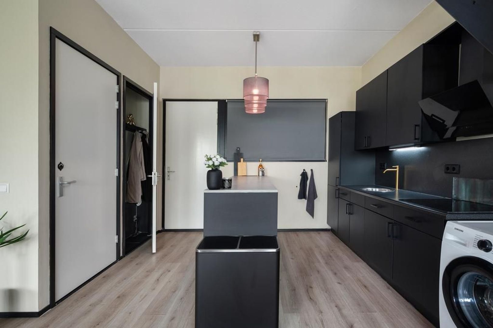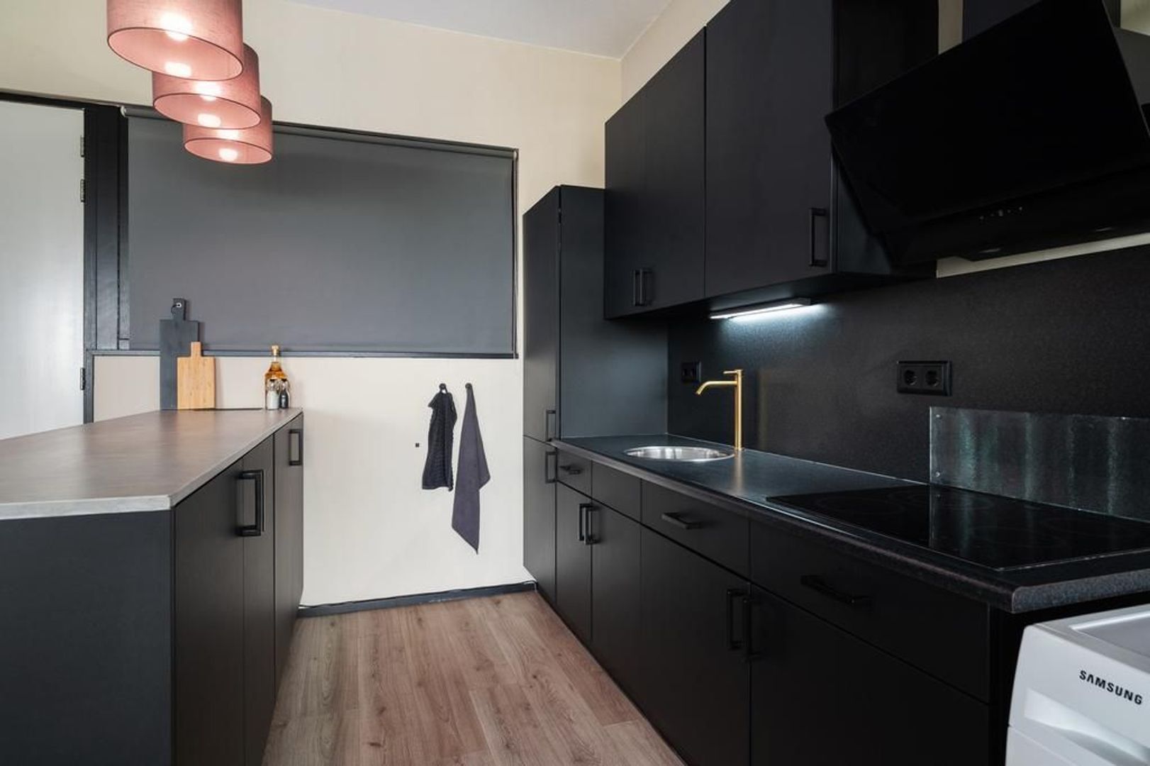Moderne open keuken voorzien van bar (2022), inductiekookplaat met afzuigkap (2023), koel-/vriescombinatie, spoelbak met mengkraan en de wasmachine aansluiting.