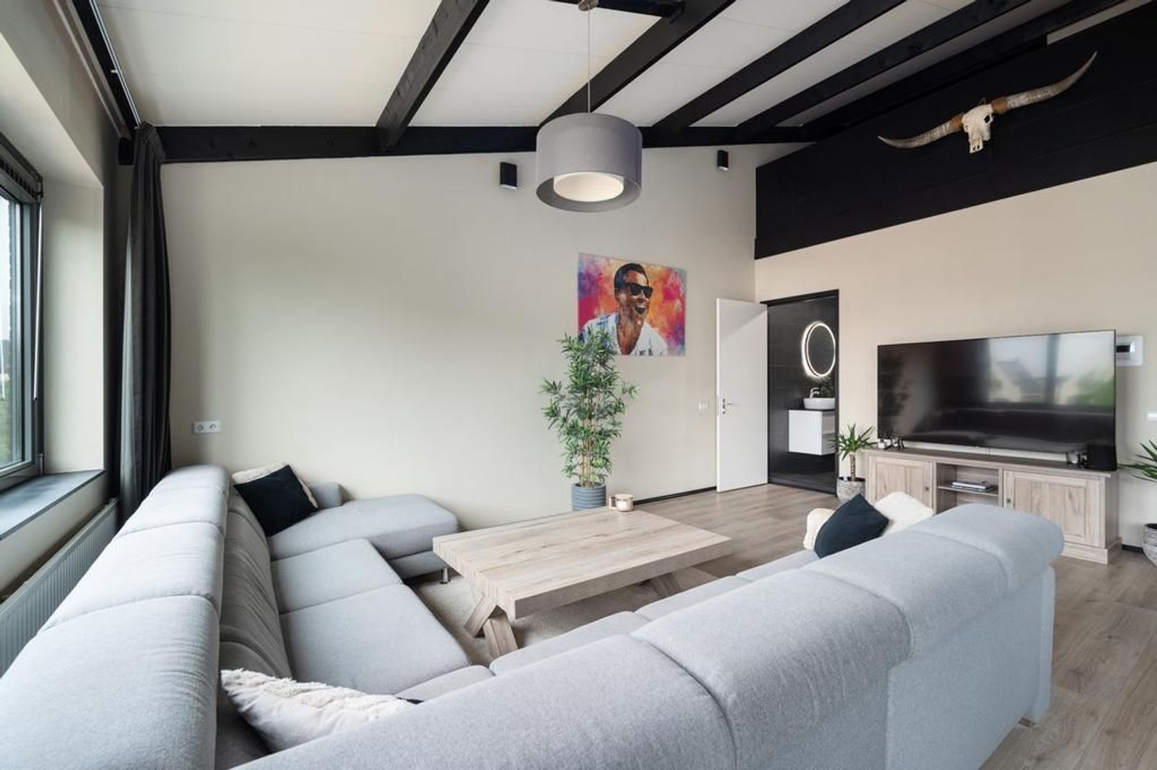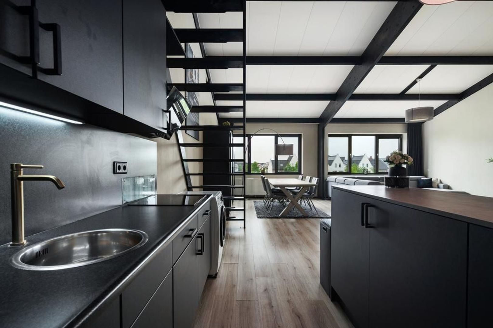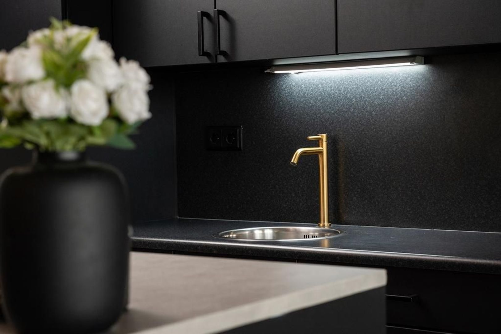 Moderne open keuken voorzien van bar (2022), inductiekookplaat met afzuigkap (2023), koel-/vriescombinatie, spoelbak met mengkraan en de wasmachine aansluiting.