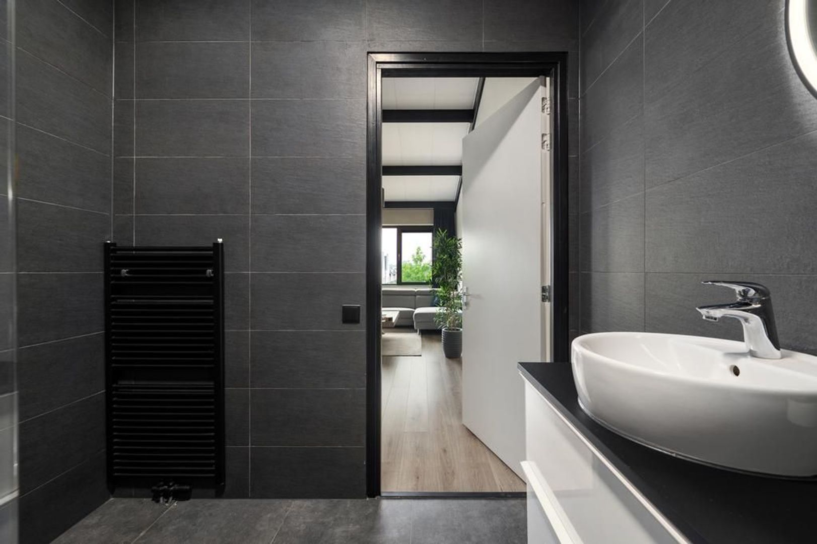 Gezellige woonkamer met veel natuurlijk lichtinval door de grote raampartijen. De woonkamer geeft toegang tot de badkamer die is voorzien van een douchecabine, dubbele wastafel met meubel, spiegel en handdoekradiator.