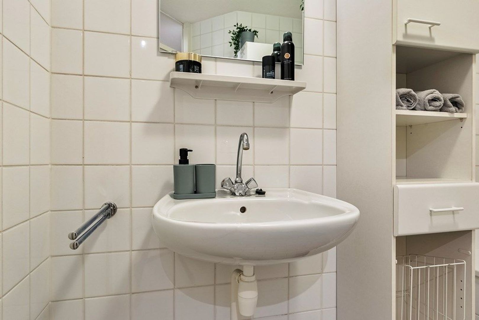 Via de hal heeft u toegang tot de nette toiletruimte voorzien van toilet met fonteintje. De volledig betegelde badkamer is voorzien van een ligbad met douche gelegenheid en wastafel.
