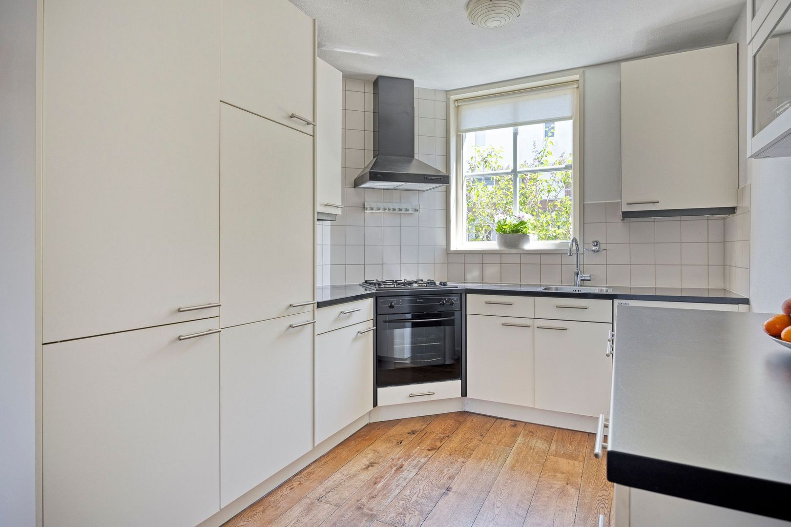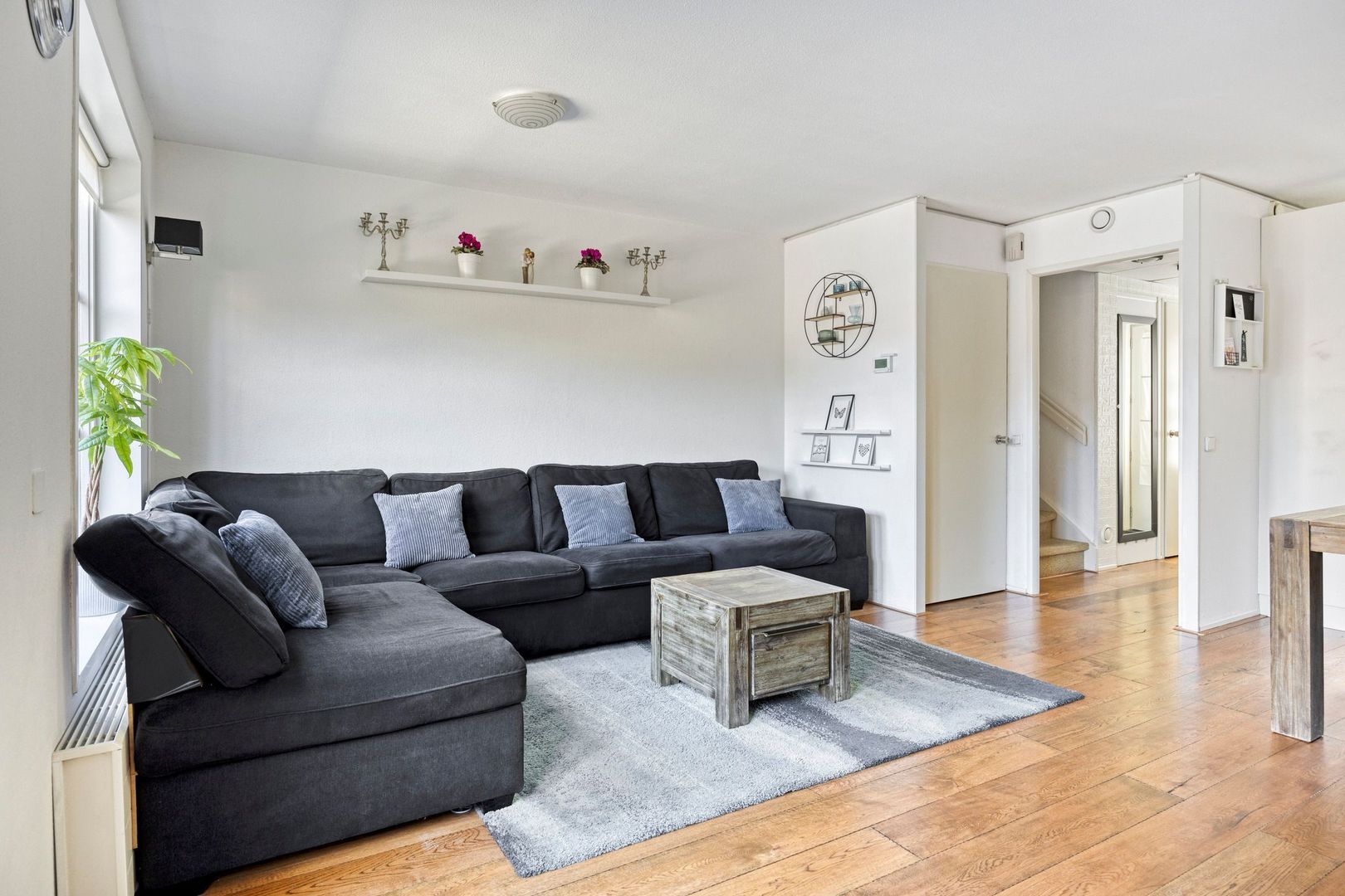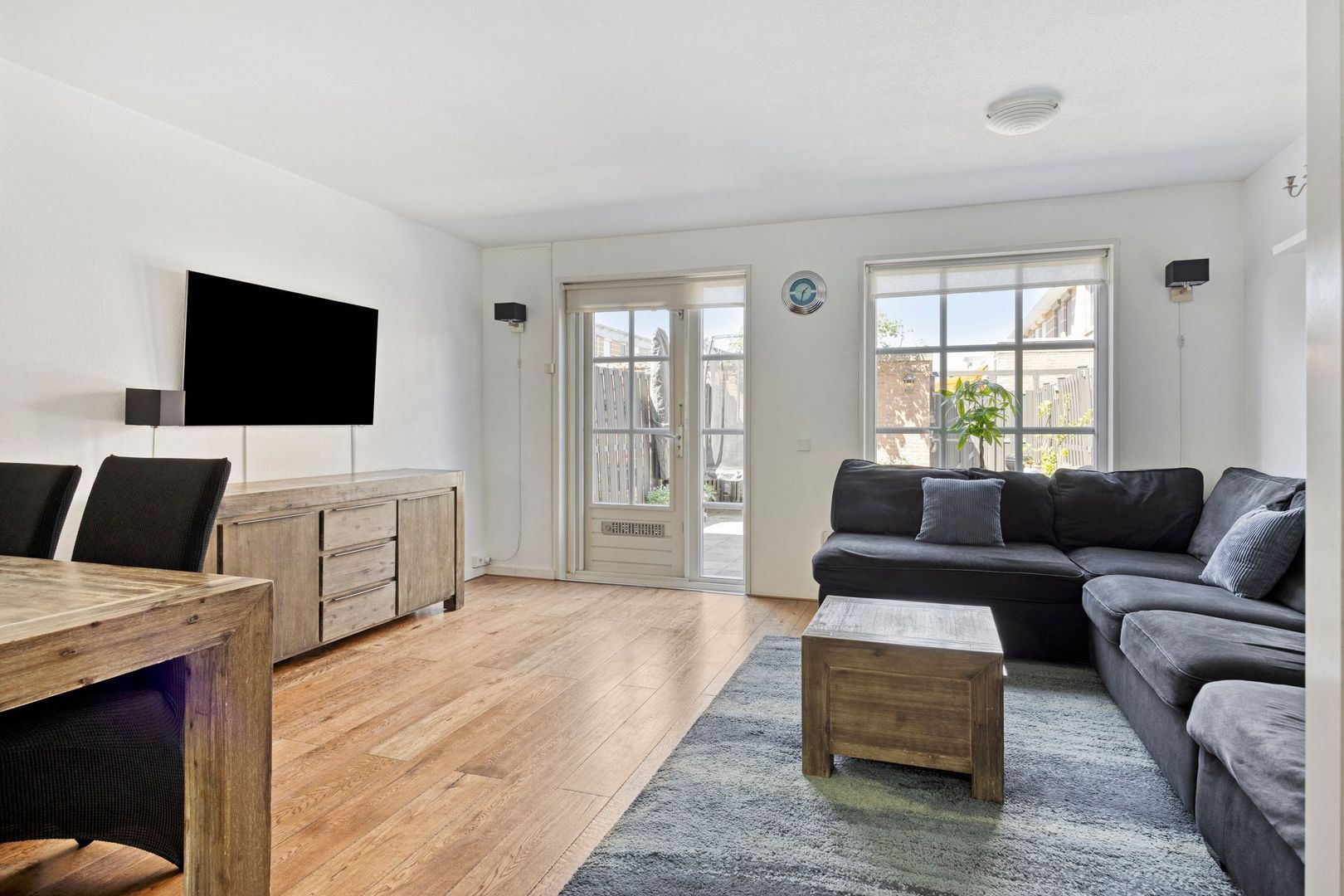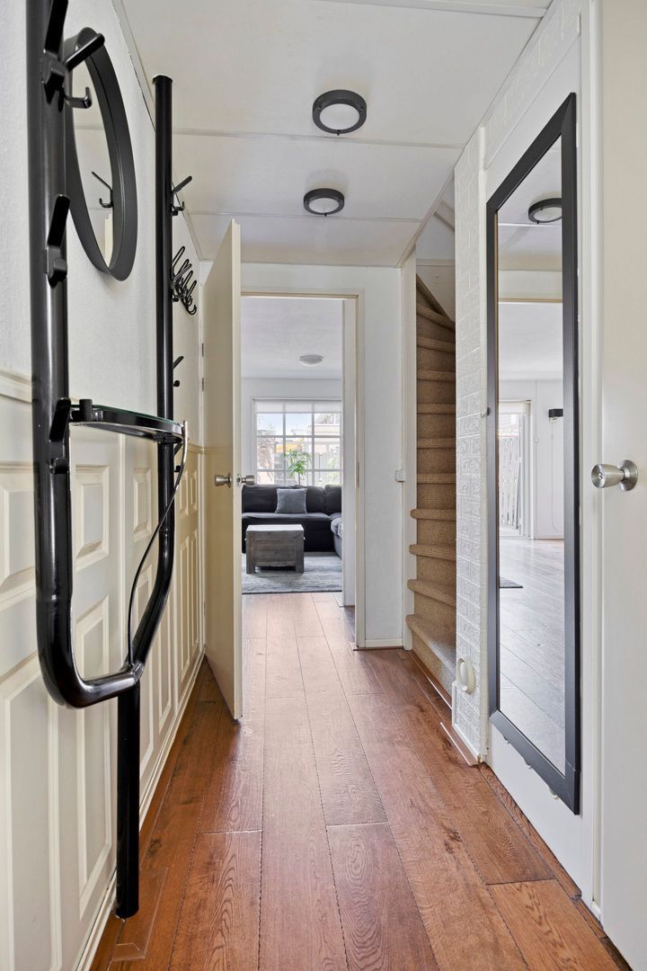 De lichte, tuingerichte woonkamer is heerlijk ruim en voorzien van een houten vloer en praktische trapkast. Via de openslaande deuren bereik je de zonnige achtertuin met berging en achterom. De tuin is gelegen op het westen en beschikt over een elektrisch zonnescherm