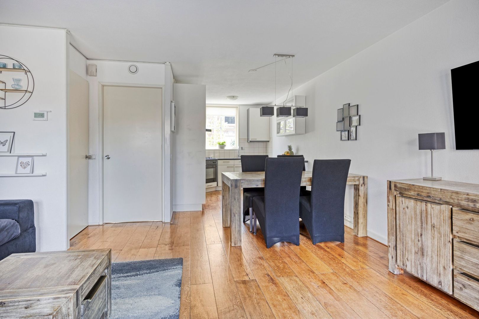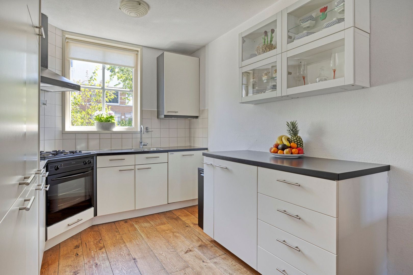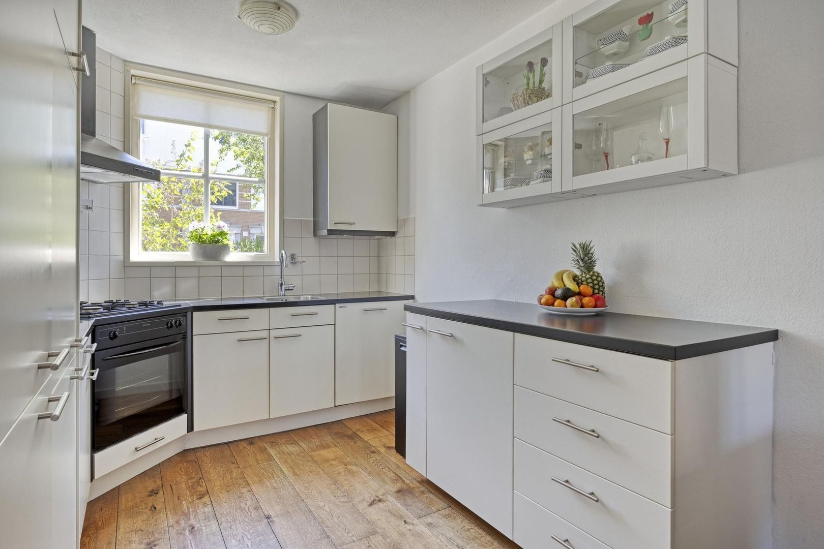 De lichte, tuingerichte woonkamer is heerlijk ruim en voorzien van een houten vloer en praktische trapkast. Via de openslaande deuren bereik je de zonnige achtertuin met berging en achterom. De tuin is gelegen op het westen en beschikt over een elektrisch zonnescherm