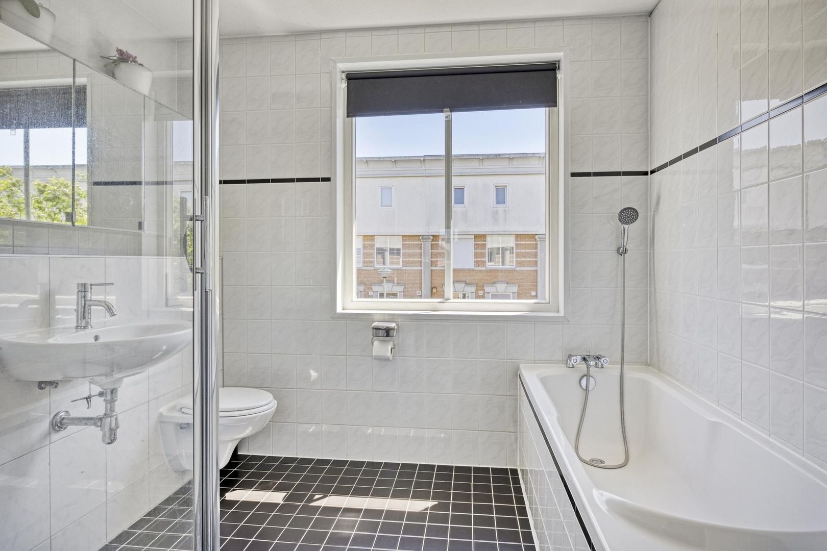 De nette badkamer beschikt over een ligbad, douche, toilet en wastafel.