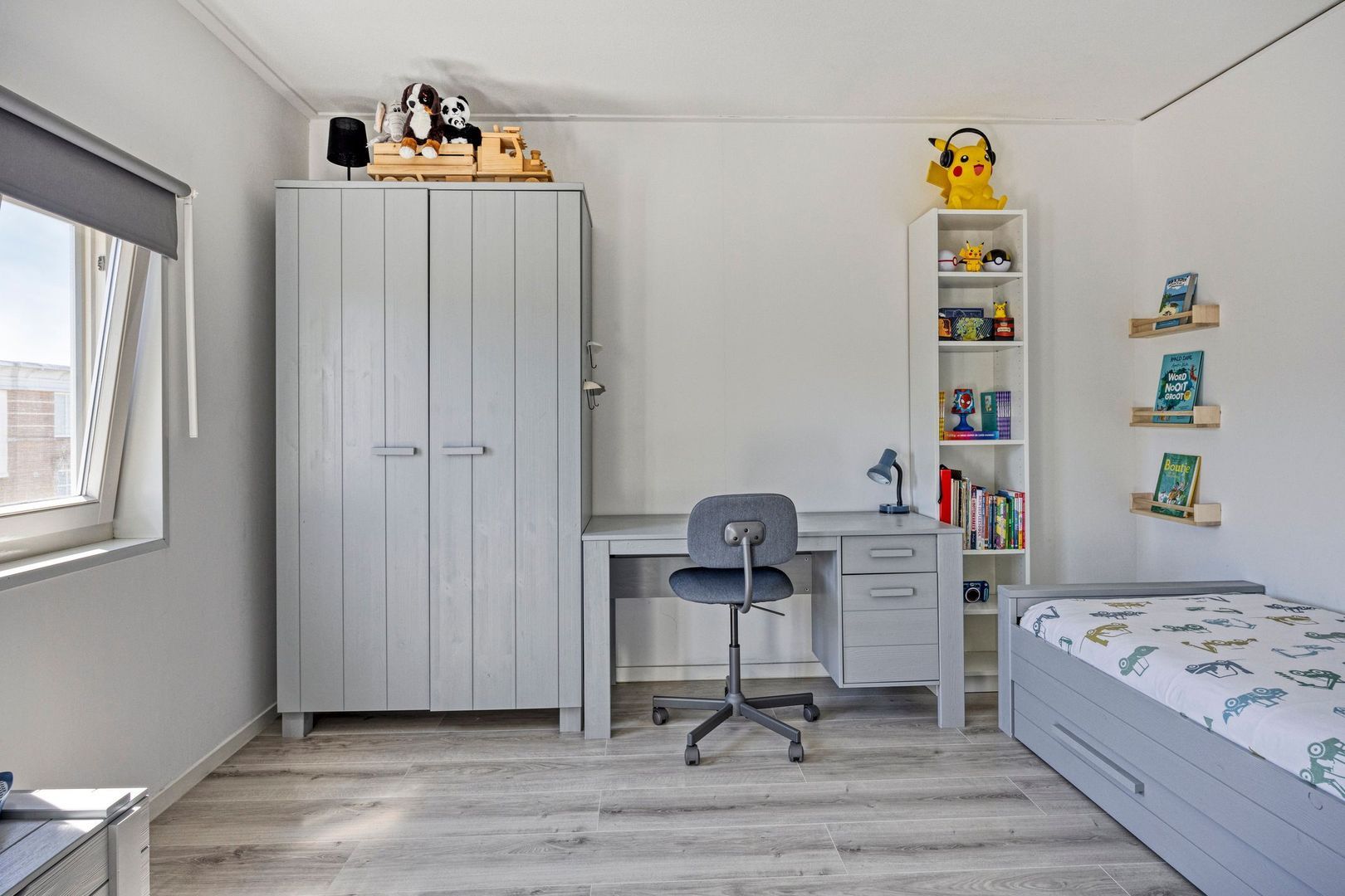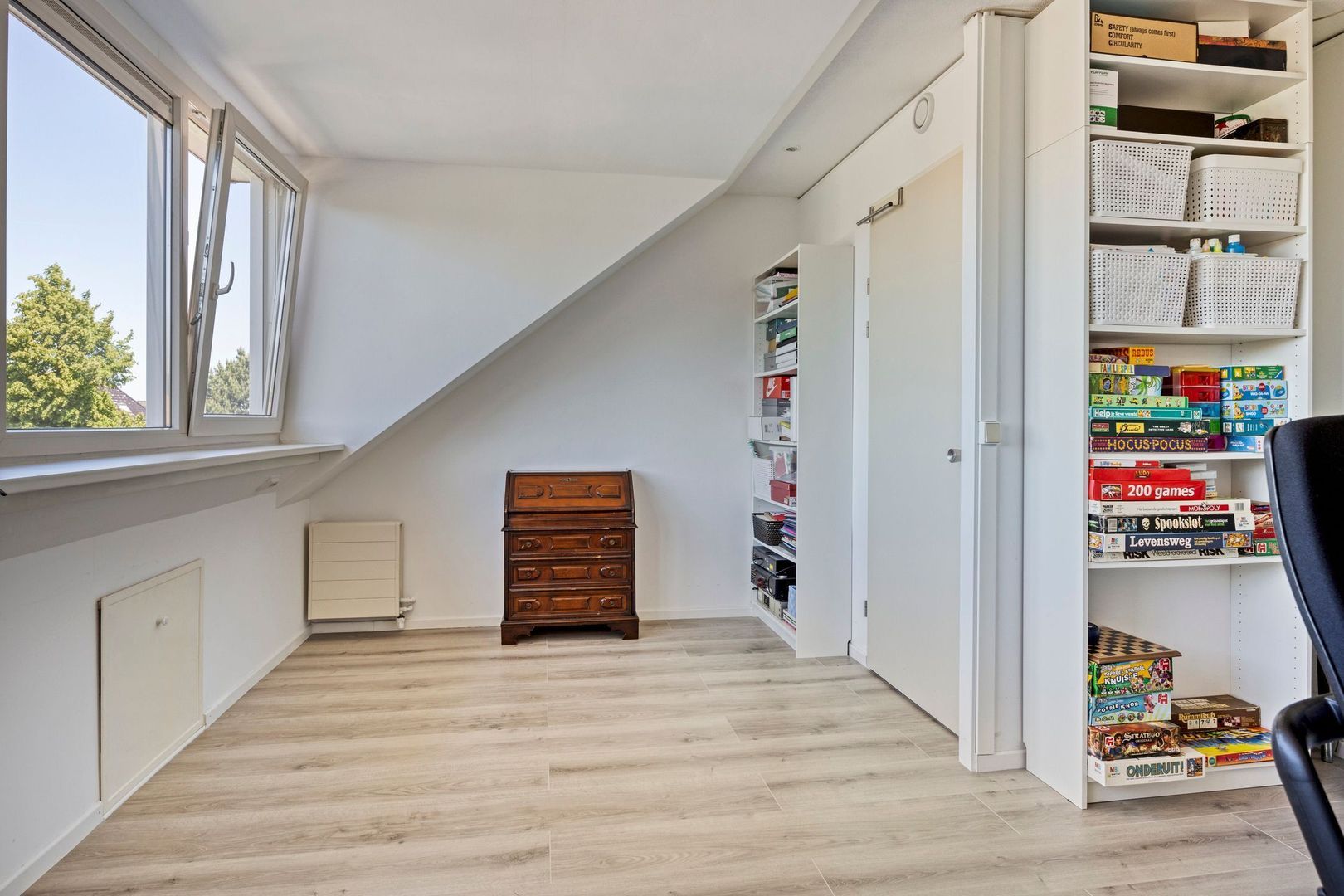 Slaapkamer 3 ligt aan de achterzijde, is voorzien van kunststofkozijnen, elektrisch rolluik en handige knieschotten voor extra opbergruimte.