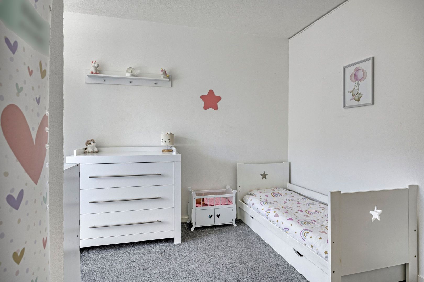 Overloop met toegang tot twee ruime slaapkamers en de badkamer.
