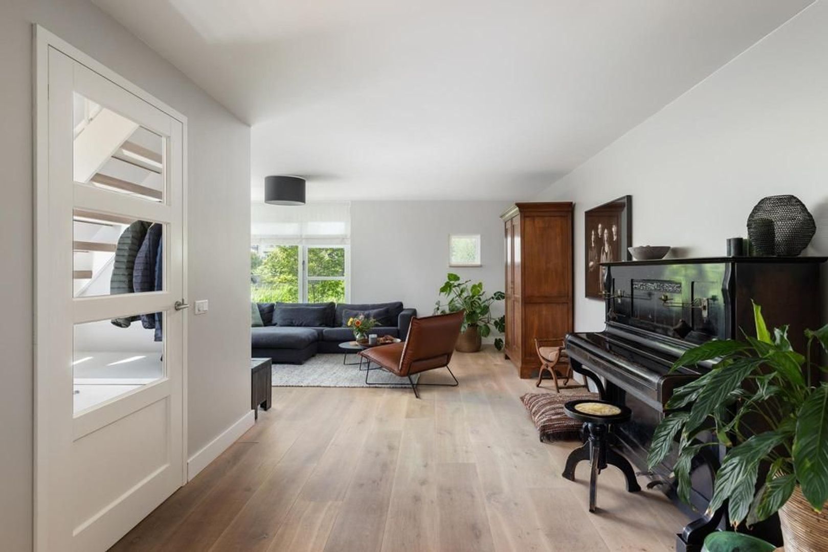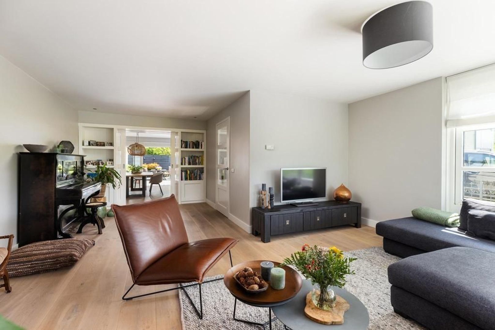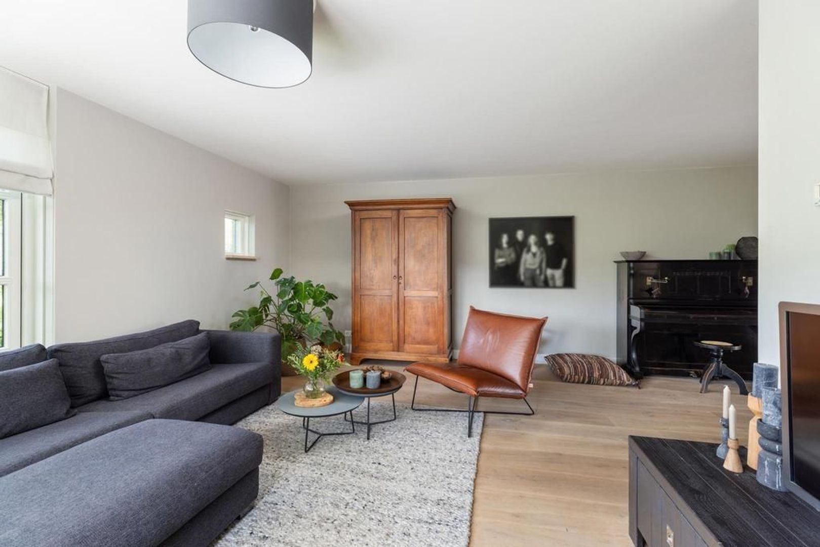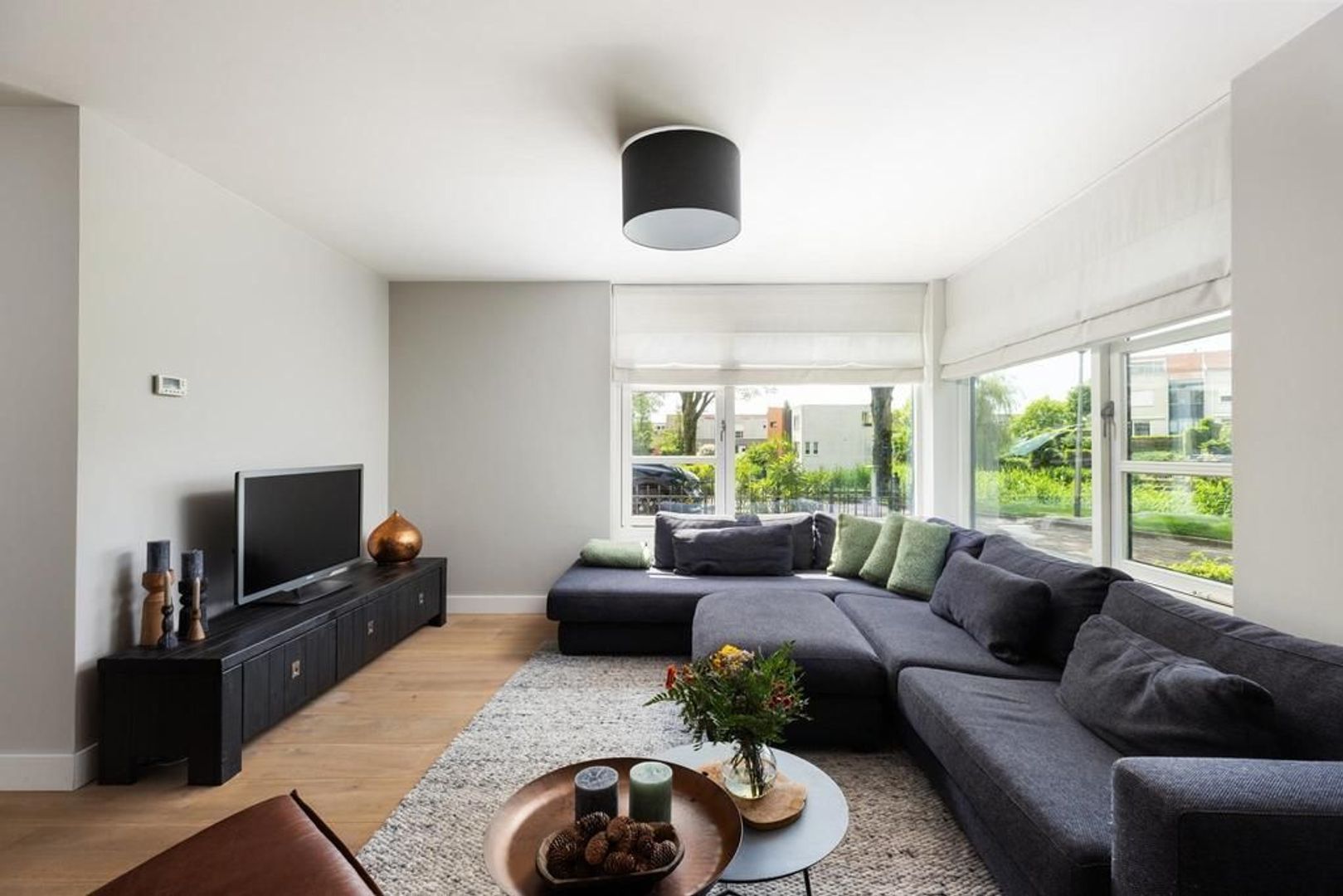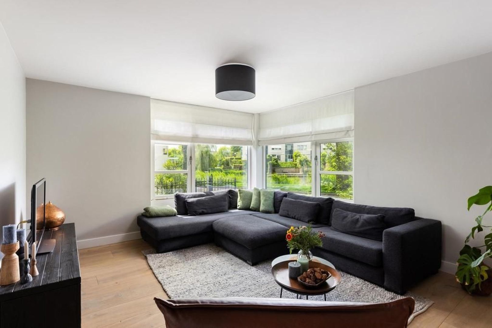 De lichte living bevindt zich aan de voorzijde van de woning, waar vandaan je een vrij uitzicht hebt over het groen en de waterpartij.