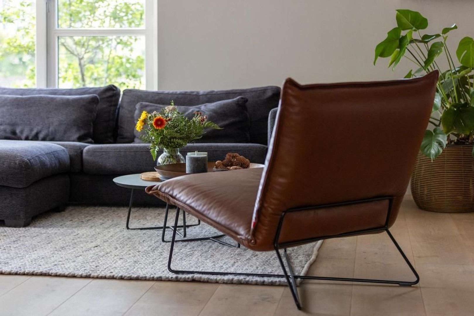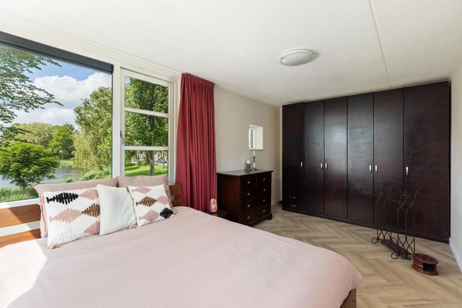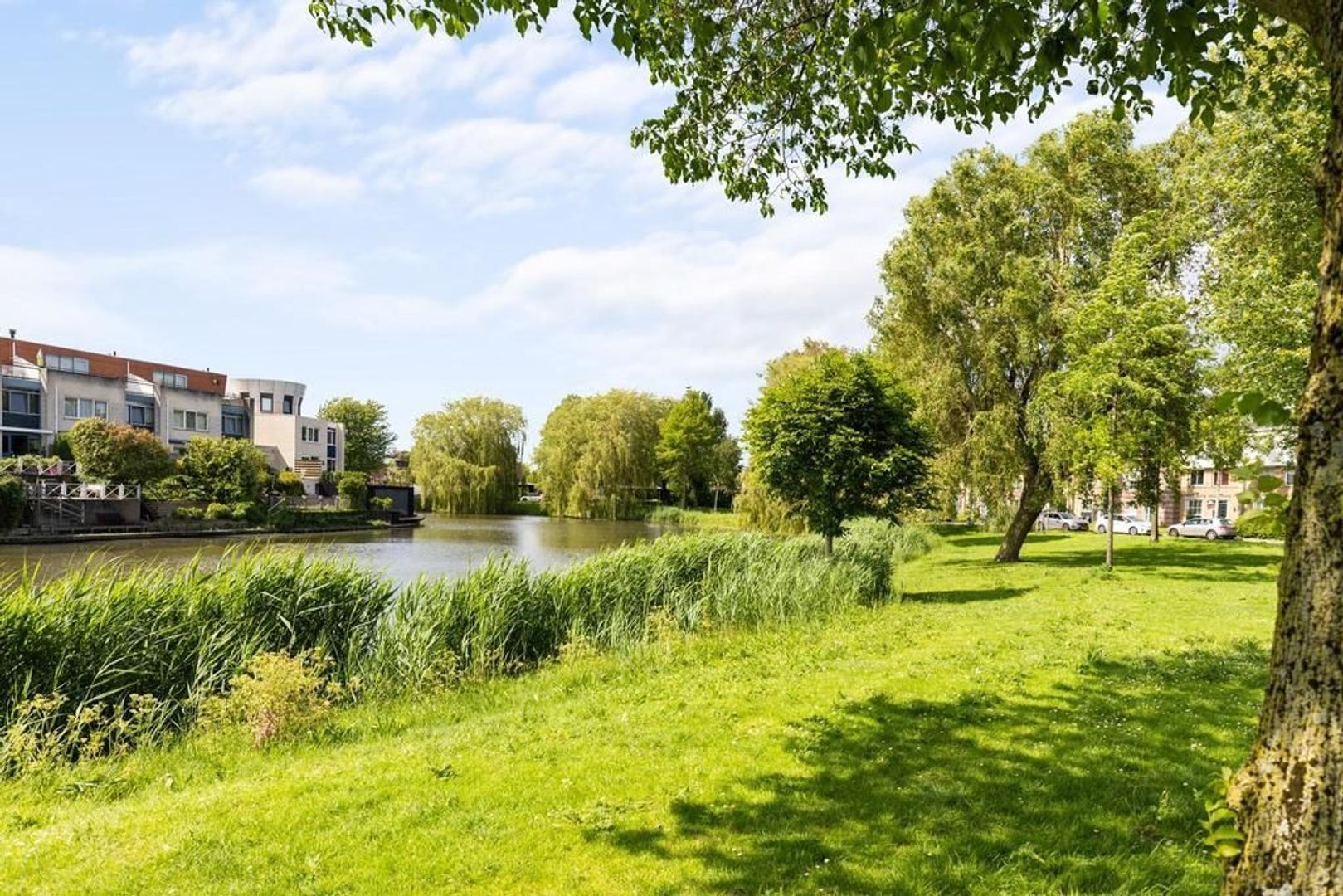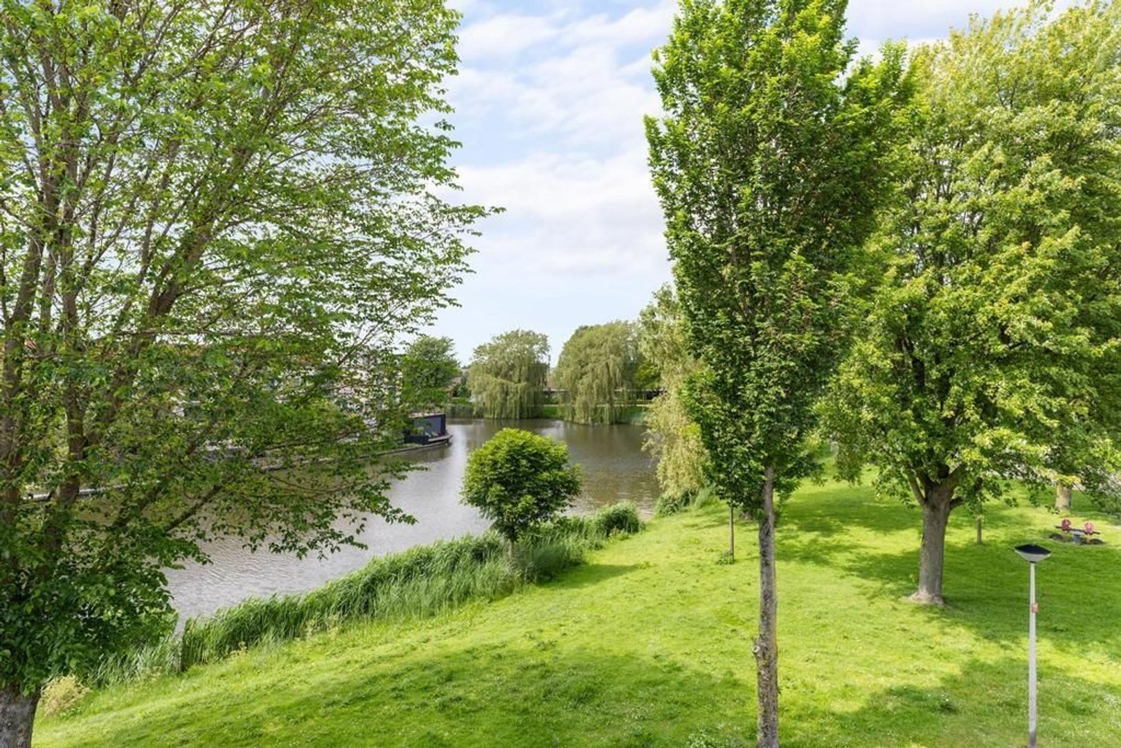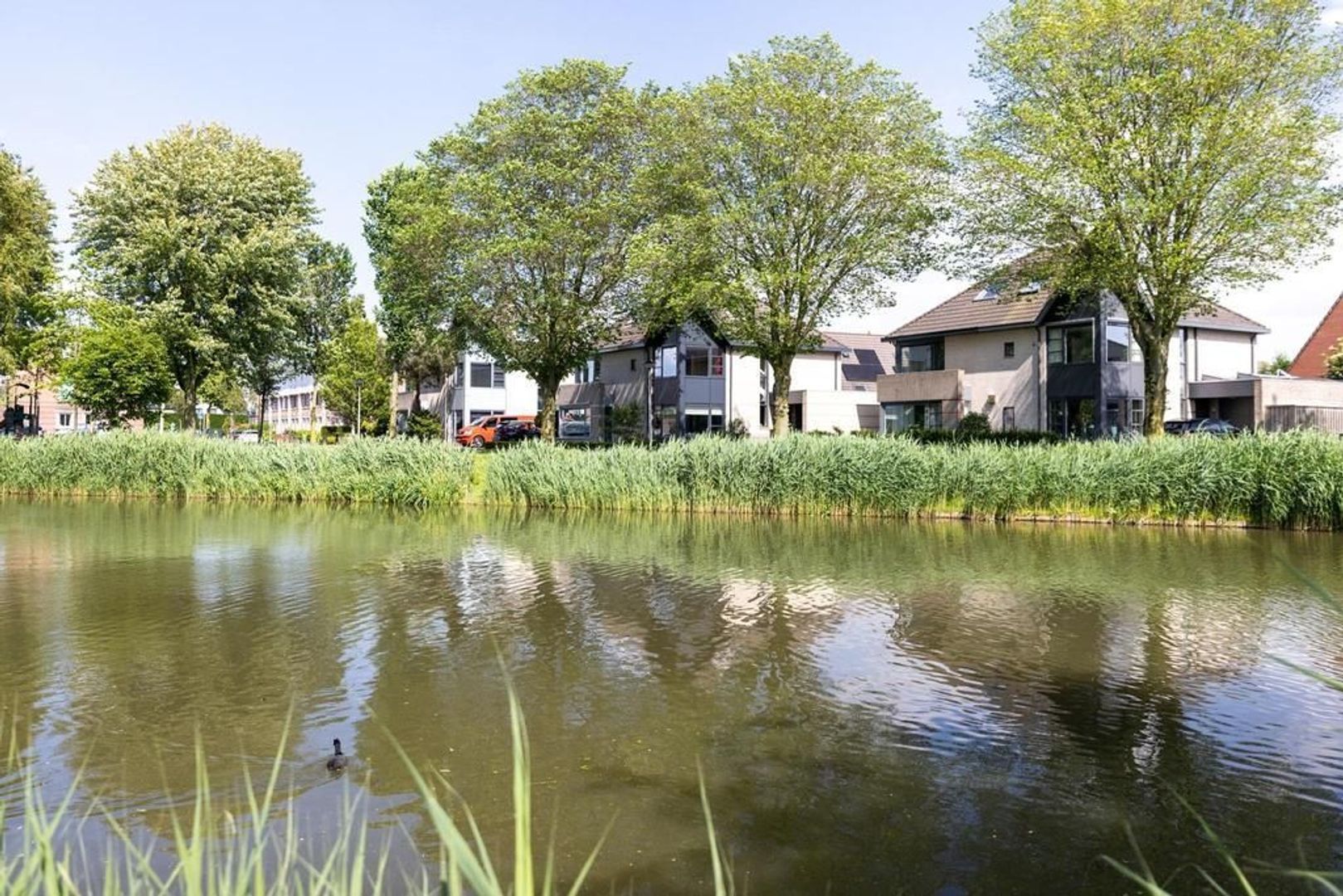 De lichte living bevindt zich aan de voorzijde van de woning, waar vandaan je een vrij uitzicht hebt over het groen en de waterpartij.