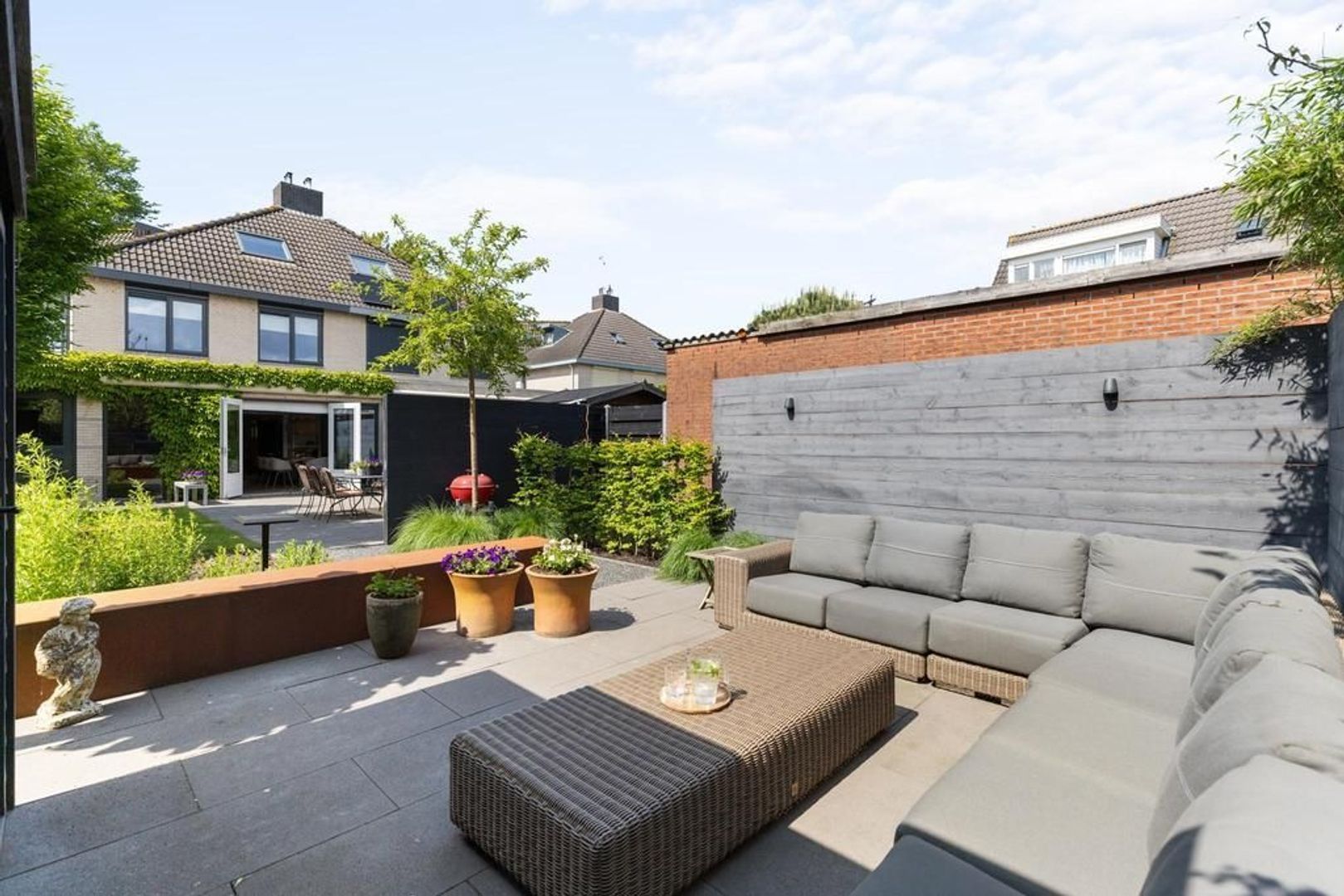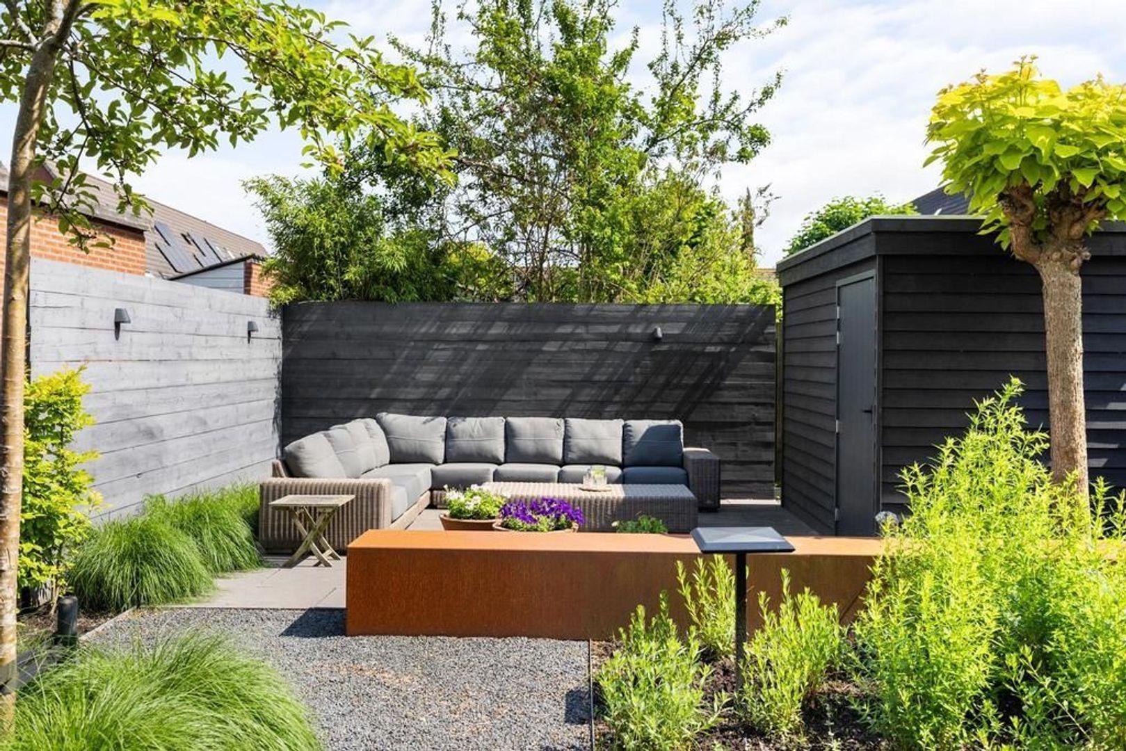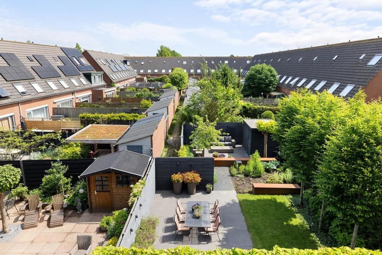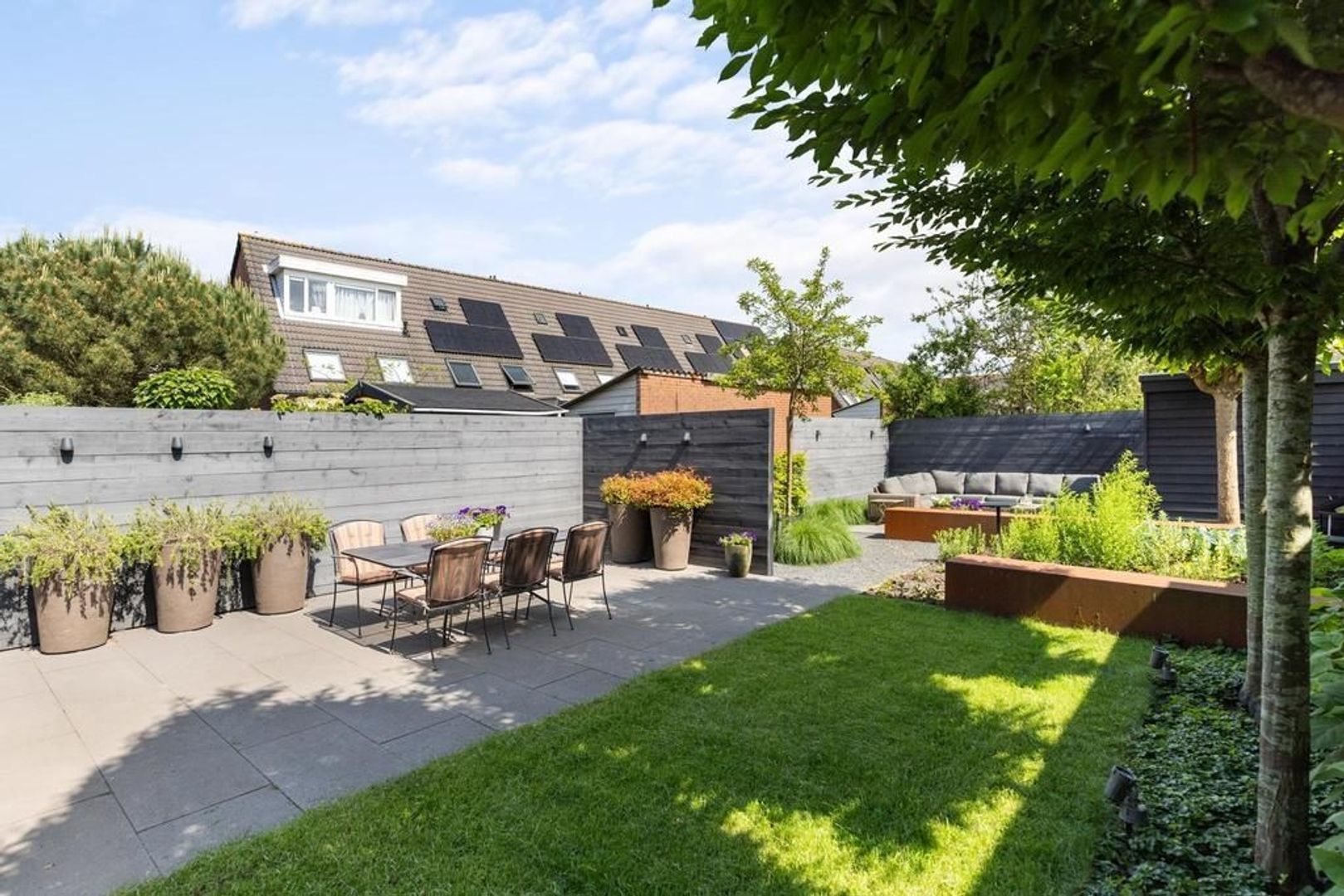 Via de openslaande deuren, kom je in de achtertuin. Deze is onder architectuur aangelegd en beschikt over meerdere terrassen, planten perken met volwassen aanplant, gazon, tuinverlichting, elektrisch zonnescherm, poort naar het achterpad. De vrijstaande houten berging is uitgerust met 220 elektra aansluiting en de tuinverlichting heeft een sensor en tijdschakelaar.
