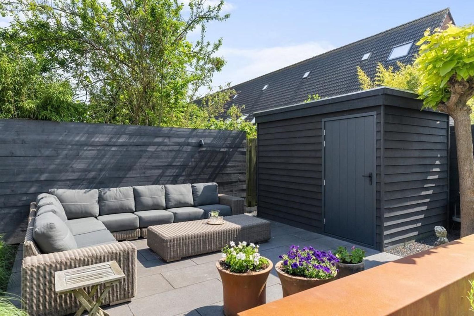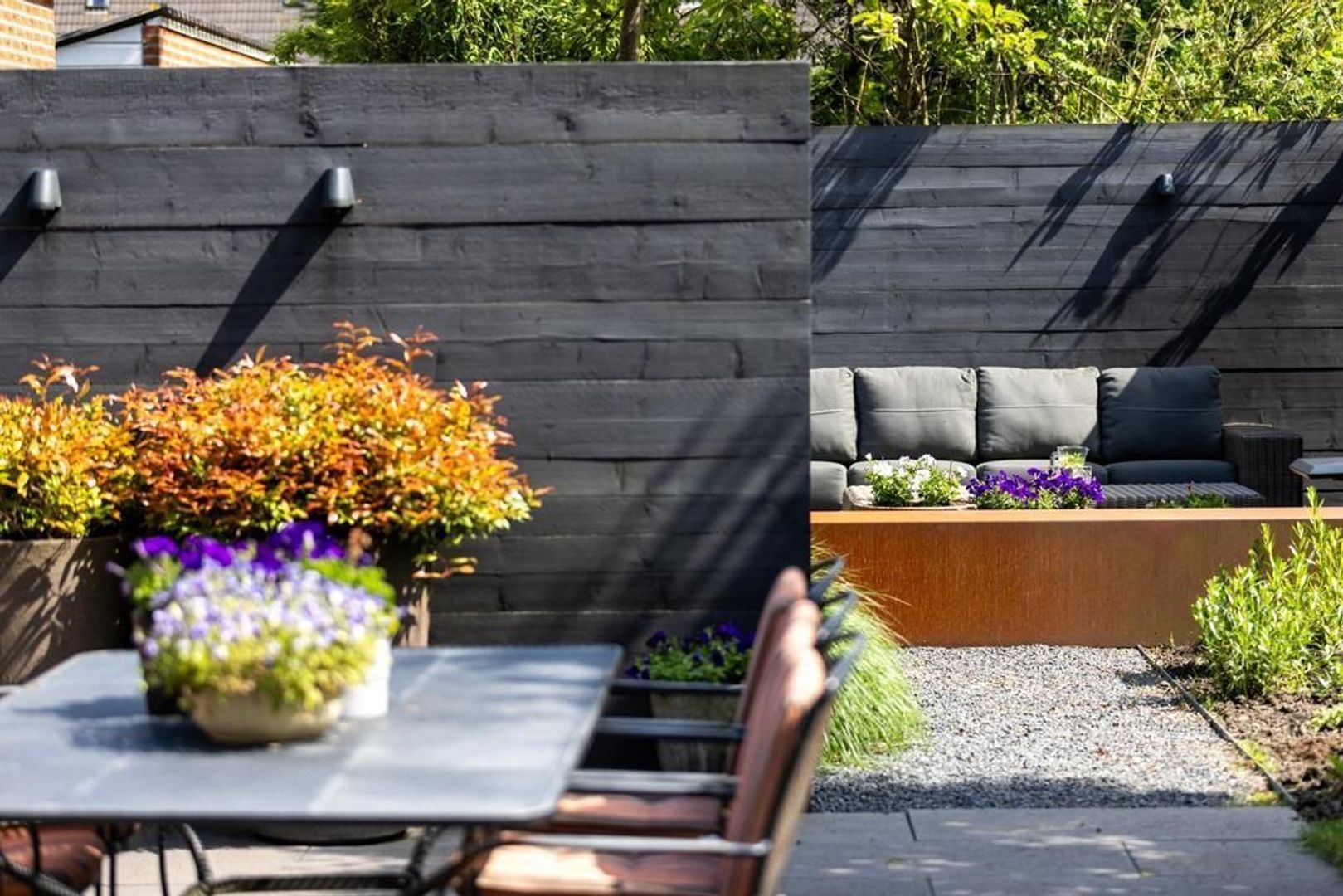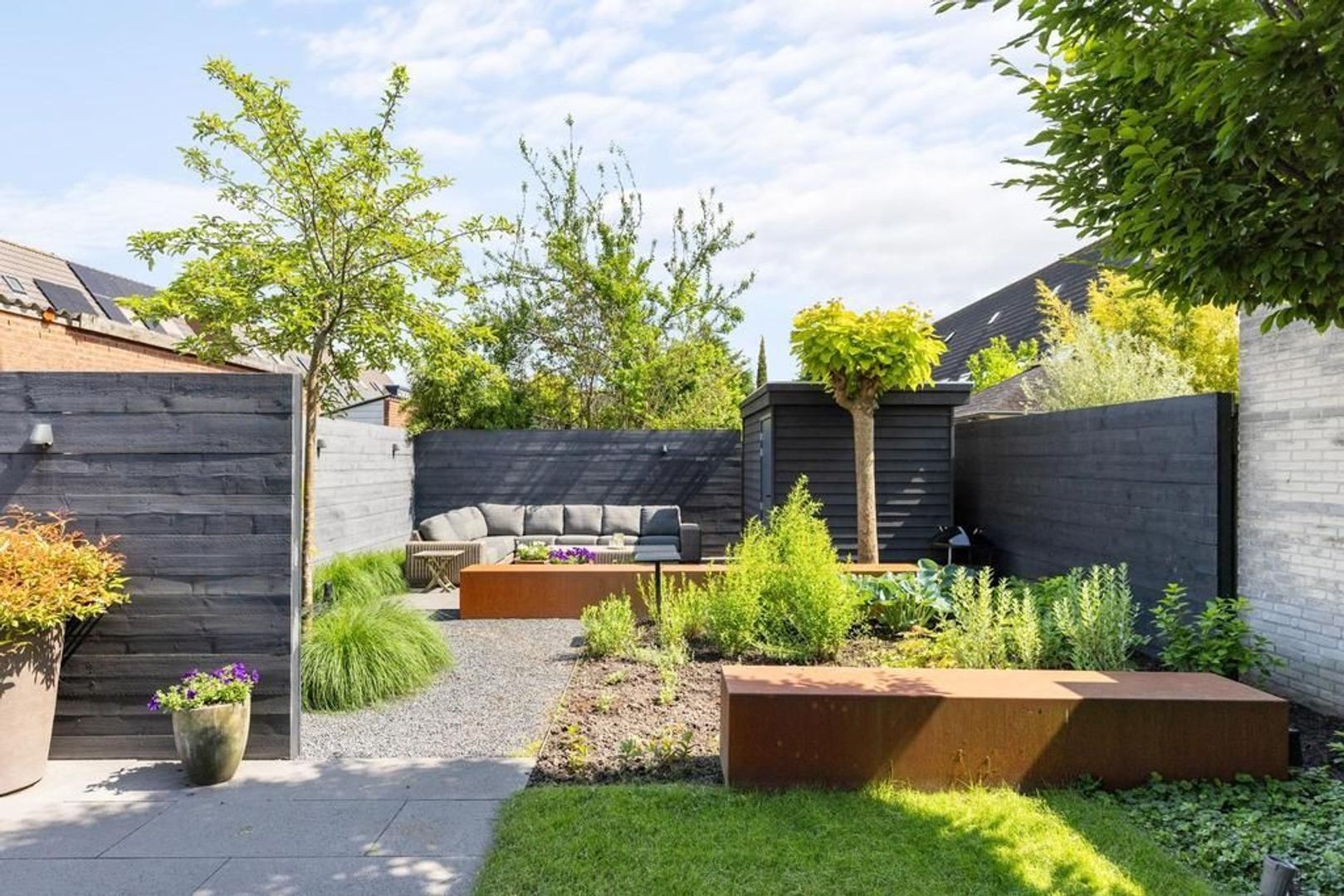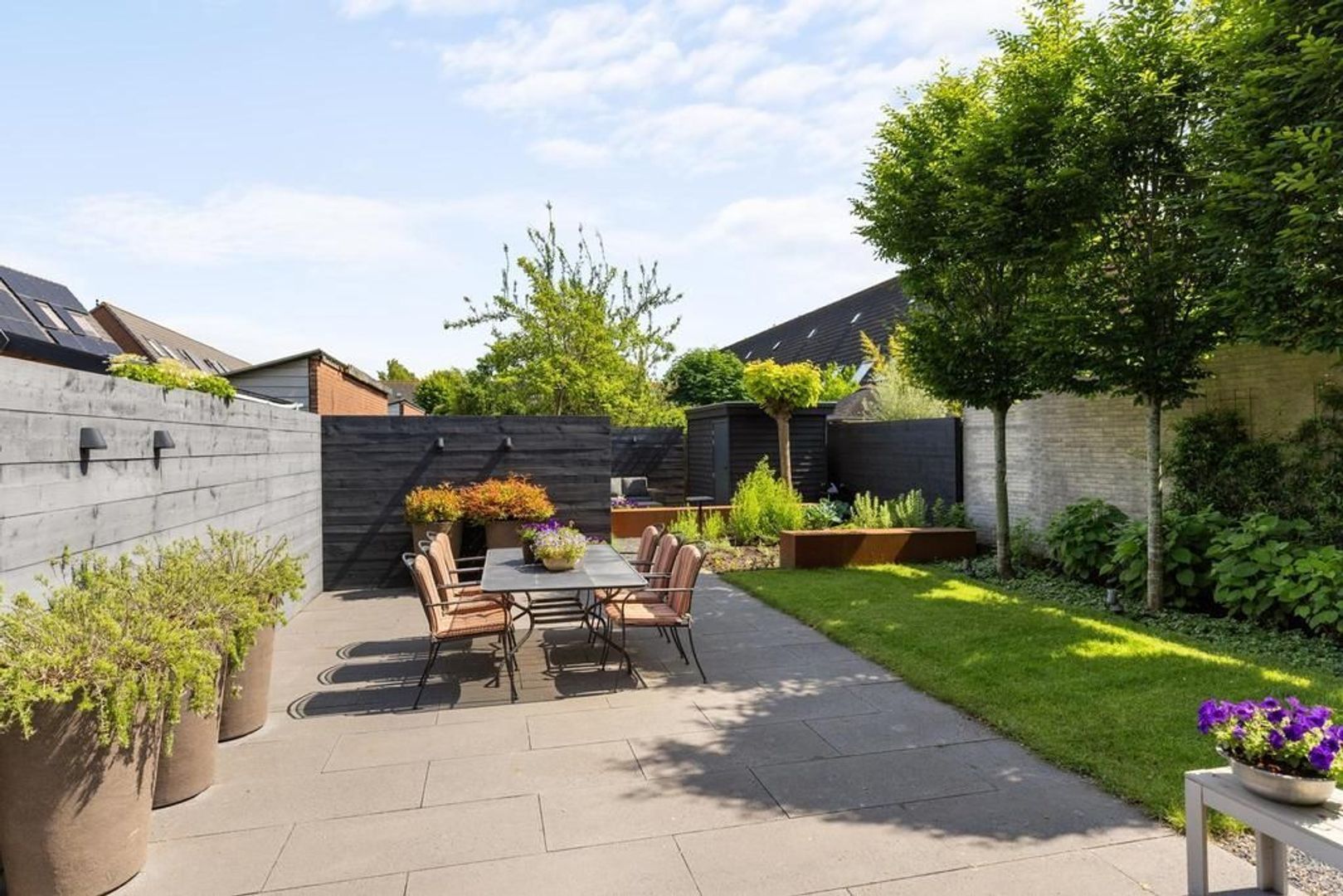Via de openslaande deuren, kom je in de achtertuin. Deze is onder architectuur aangelegd en beschikt over meerdere terrassen, planten perken met volwassen aanplant, gazon, tuinverlichting, elektrisch zonnescherm, poort naar het achterpad. De vrijstaande houten berging is uitgerust met 220 elektra aansluiting en de tuinverlichting heeft een sensor en tijdschakelaar.