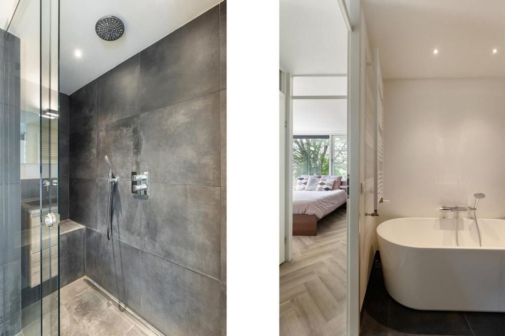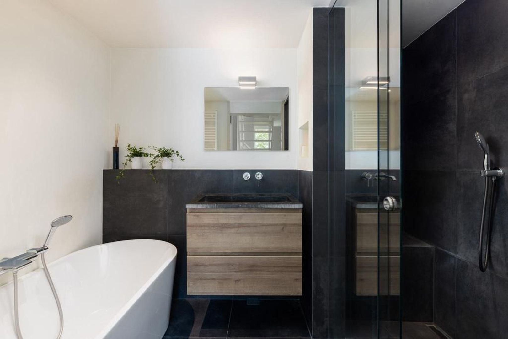 De moderne badkamer is voorzien van een brede wastafel, ligbad, inloopdouche met glazen schuifwand, inbouwspots en handdoekradiator.