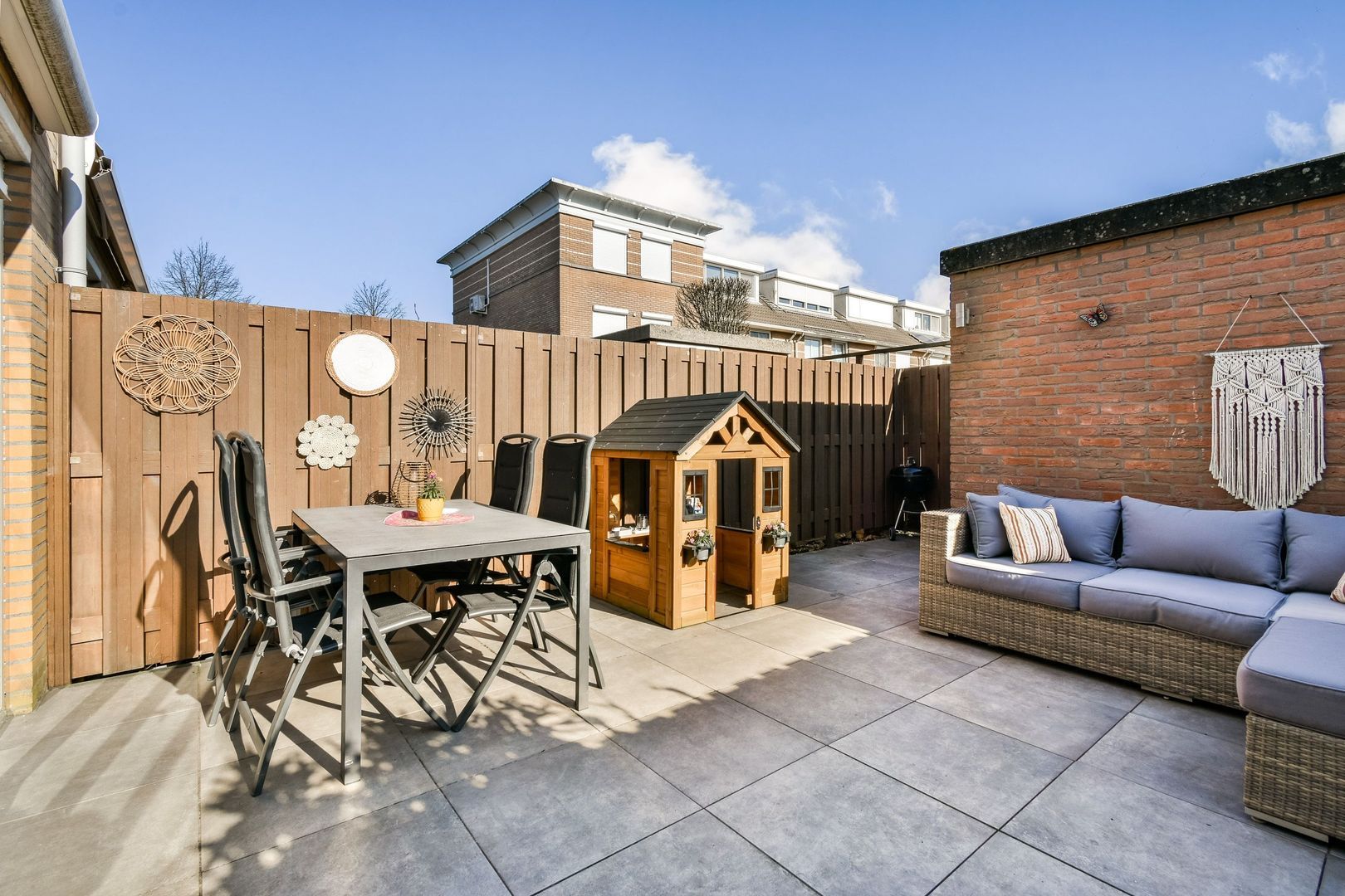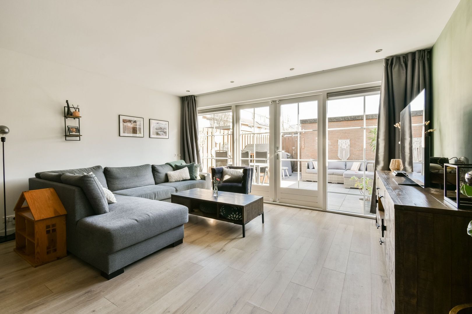 De lichte, tuingerichte woonkamer bevindt zich aan de achterzijde van de woning en is voorzien van een laminaatvloer met vloerverwarming en een praktische trapkast. Via openslaande deuren bereik je de zonnige achtertuin met berging en achterom. De tuin is gelegen op het zuidoosten en beschikt over een zonnescherm.