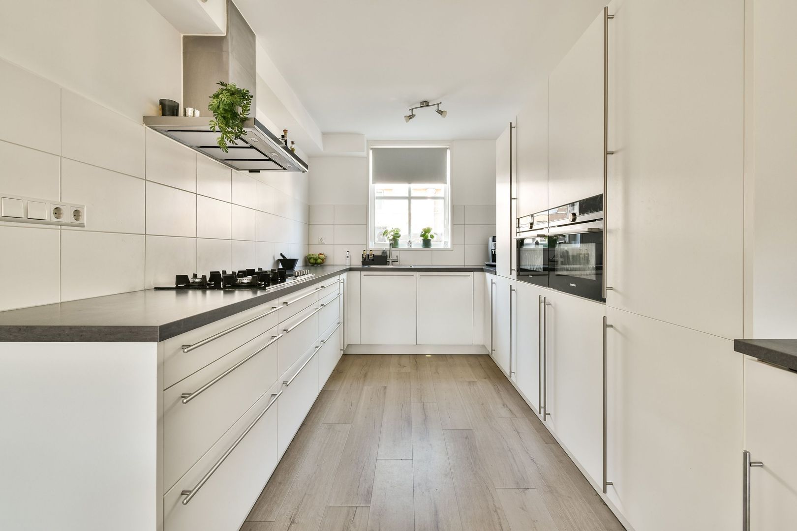 Aan de voorzijde bevindt zich de open keuken, voorzien van diverse inbouwapparatuur zoals een gasfornuis, afzuigkap, combi-oven, koel-/vriescombinatie en een vaatwasser.