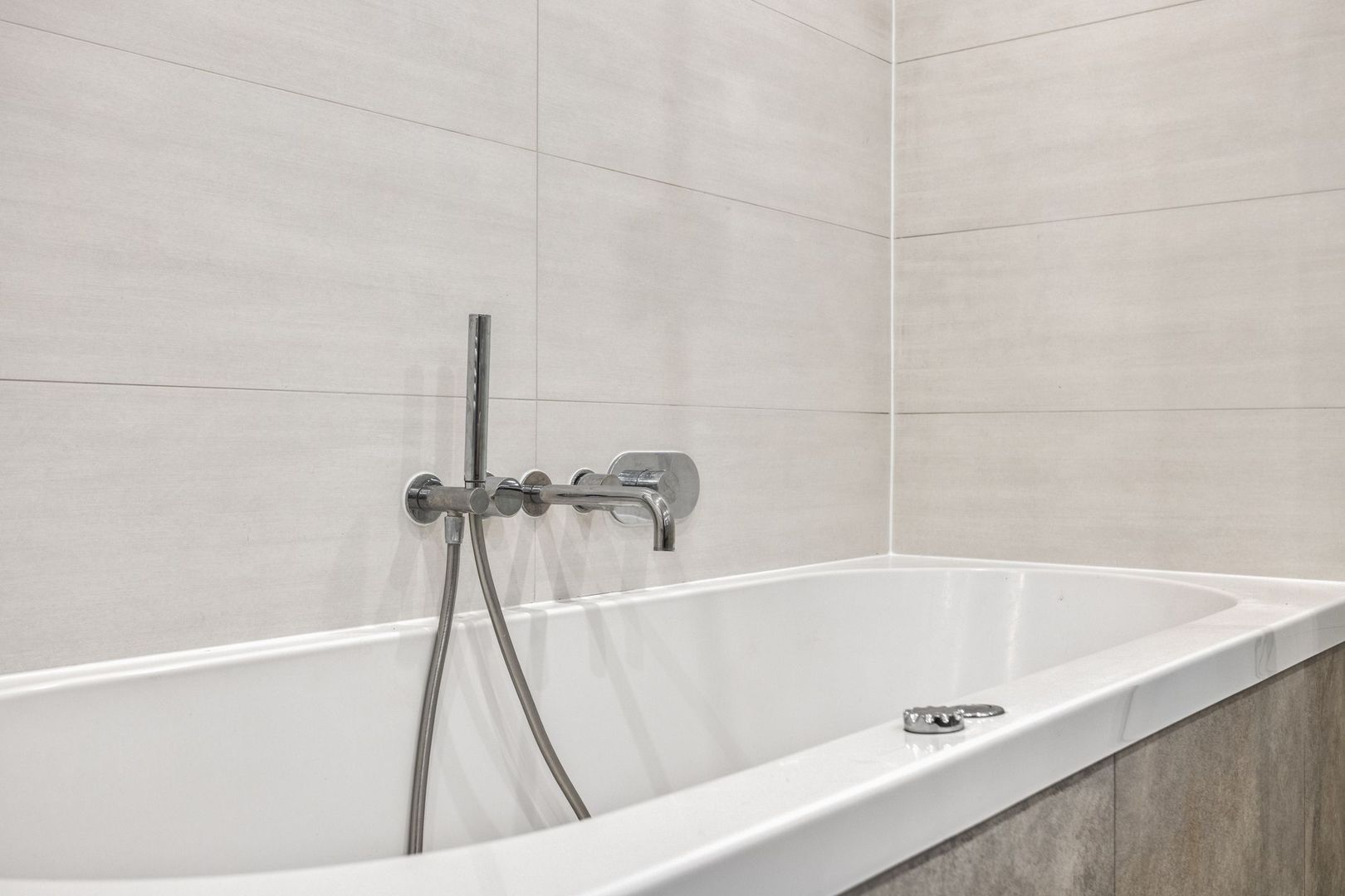 De moderne badkamer is uitgerust met een ligbad, douche, toilet en dubbele wastafel met meubel.