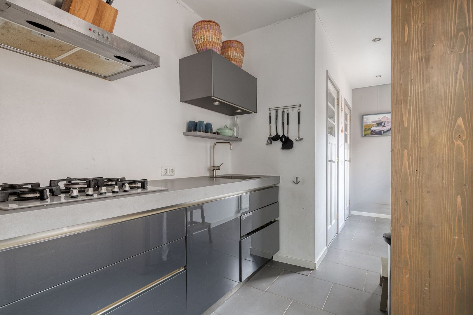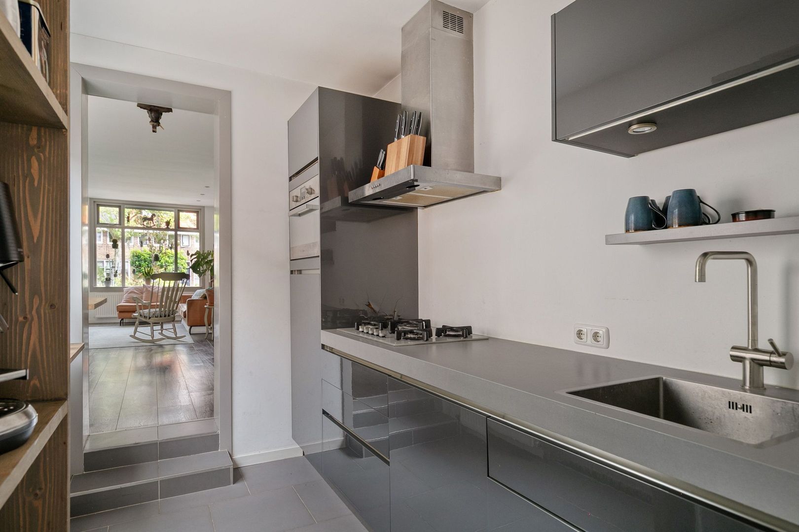 De keuken is uitgerust met een gasfornuis, afzuigkap, vaatwasser, koelkast en combi-oven. Vanuit hier loop je de achtertuin in.