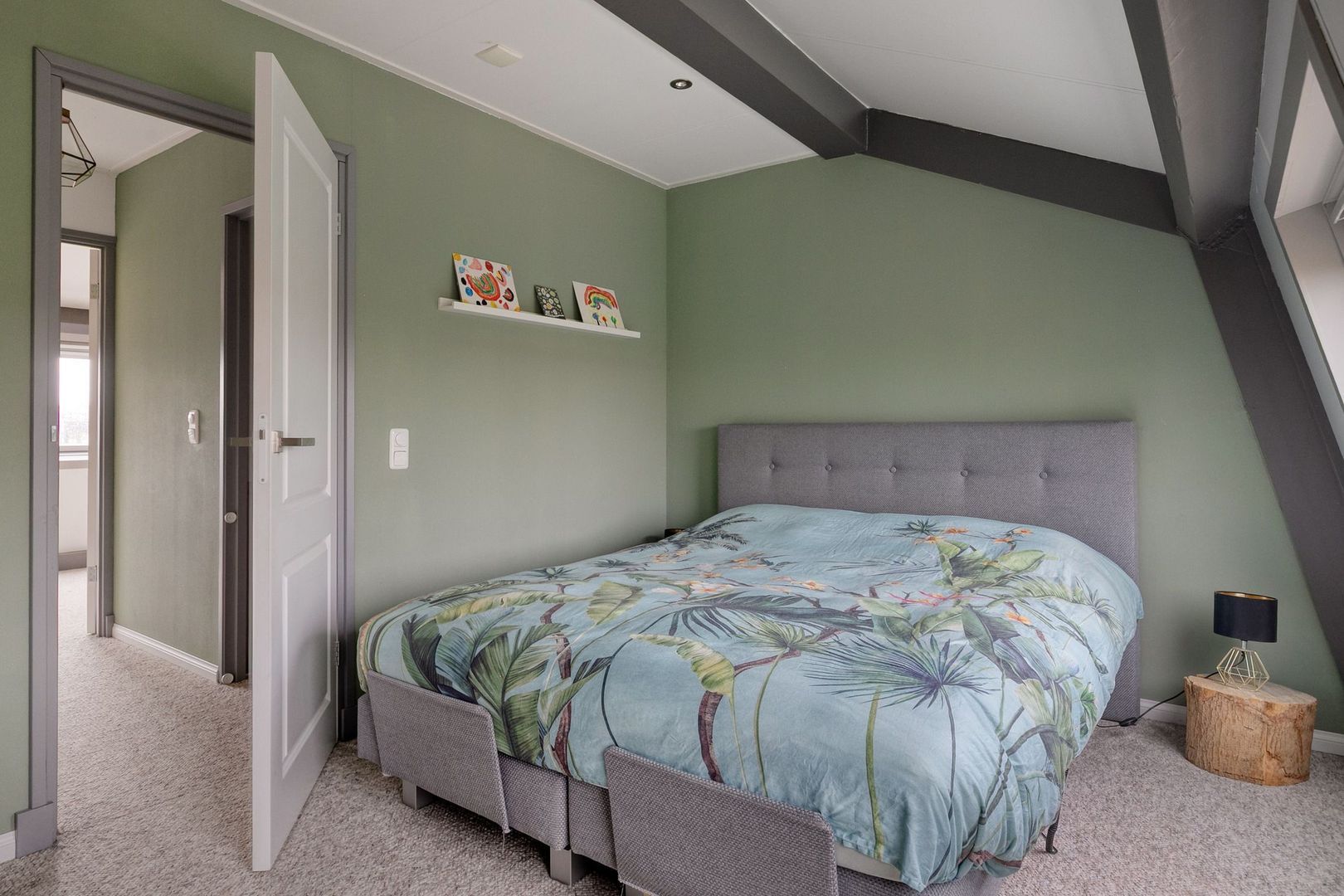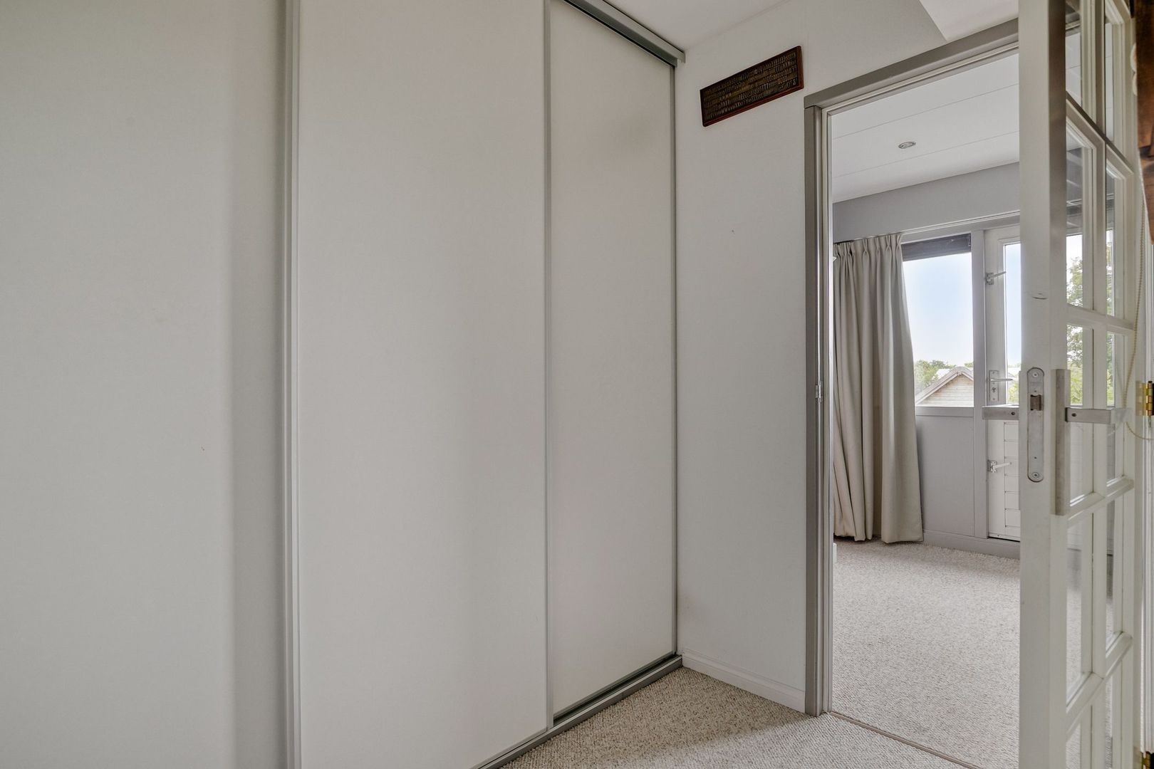 Overloop met vaste kasten, toegang tot de slaapkamer en de badkamer.