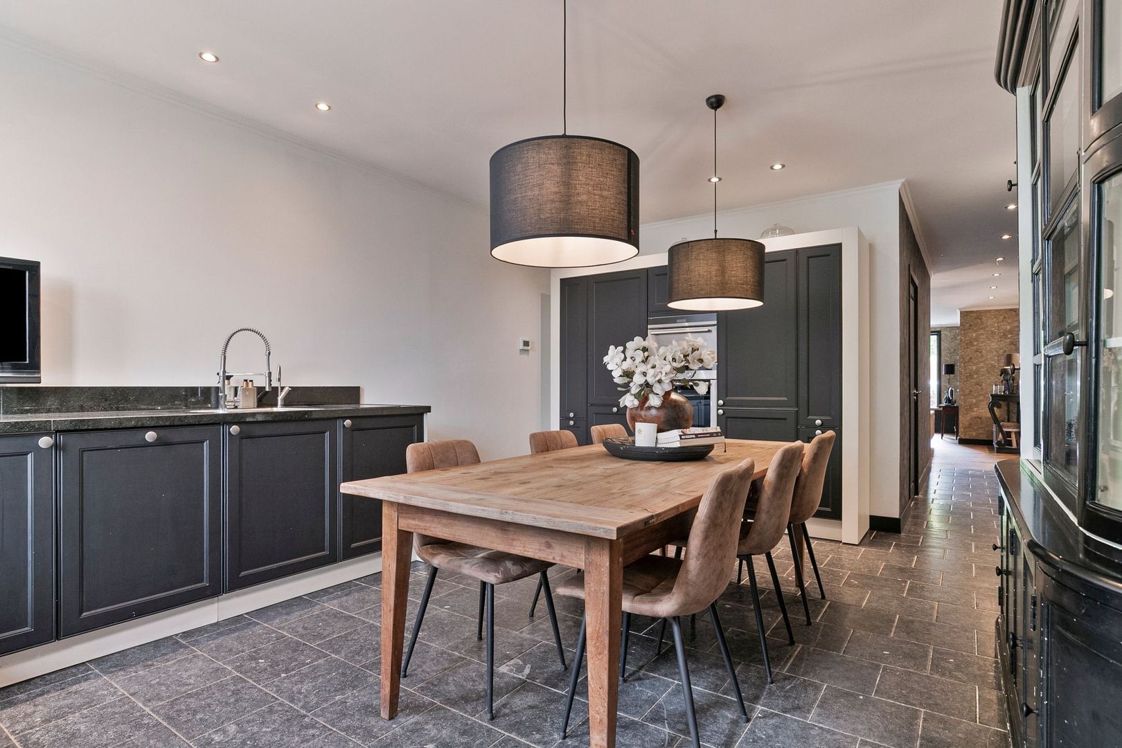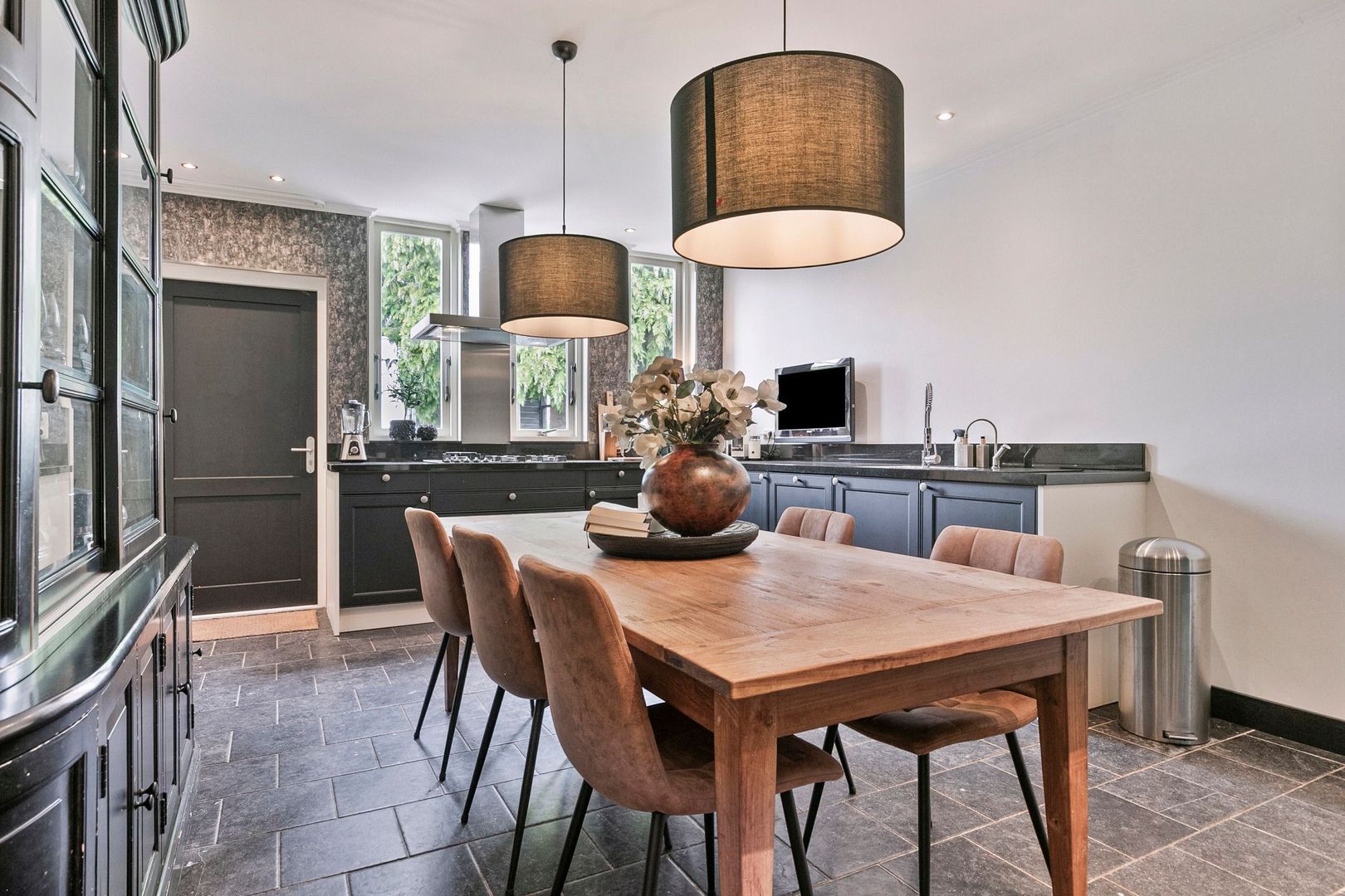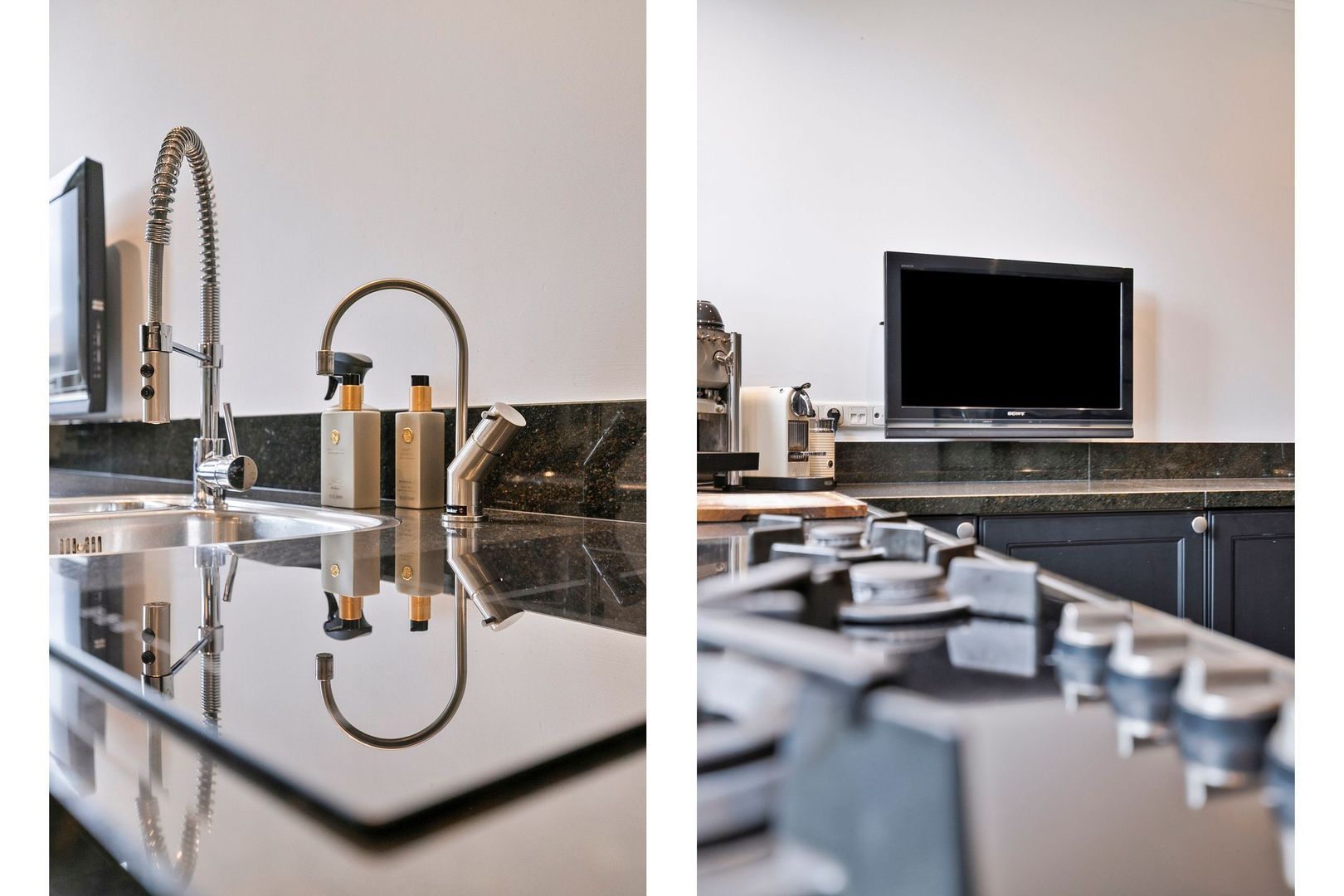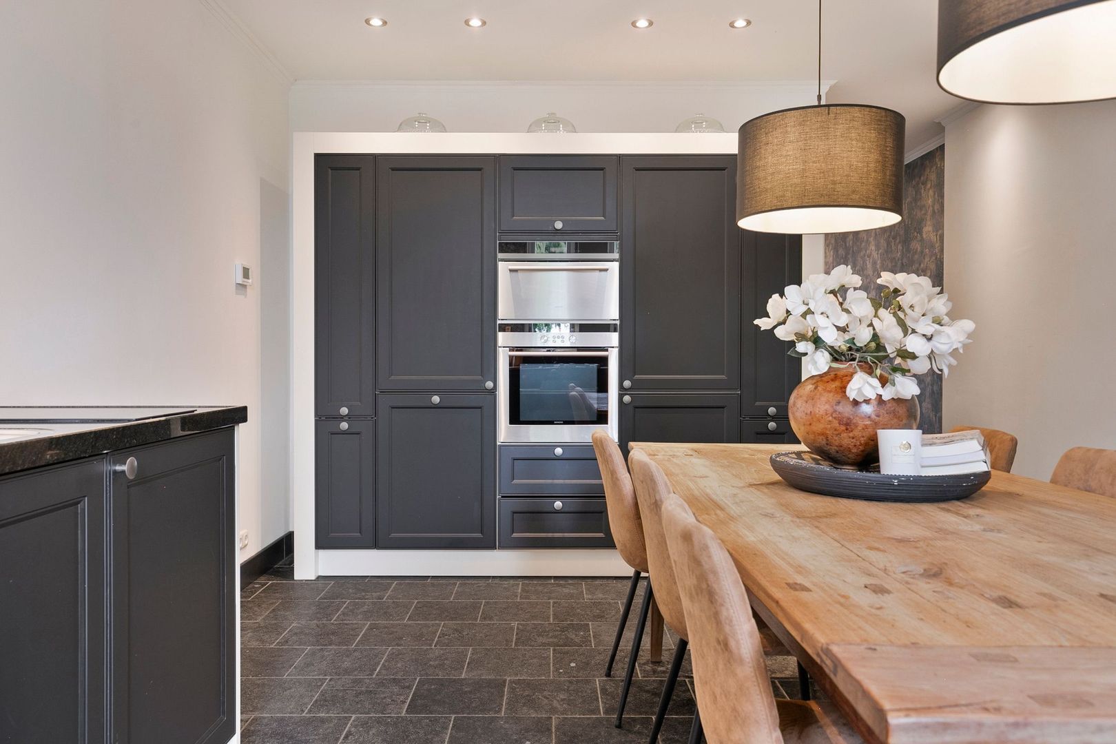 Aan de achterzijde bevindt zich de ruime keuken, uitgerust met een 5-pits gasfornuis, afzuigkap, oven, stoomoven, koelkast met flessenlade, koelkast met vriesvak, apothekerskast, inductiekookplaat, vaatwasser en een Quooker.