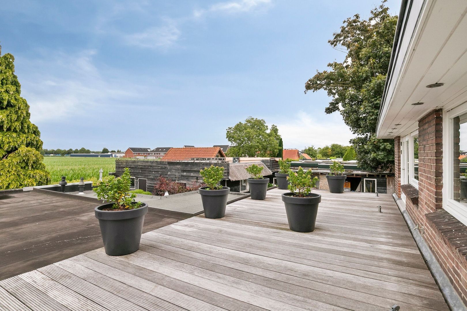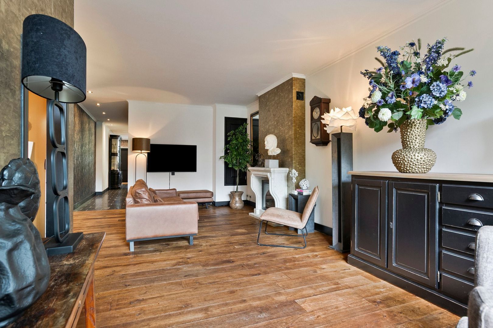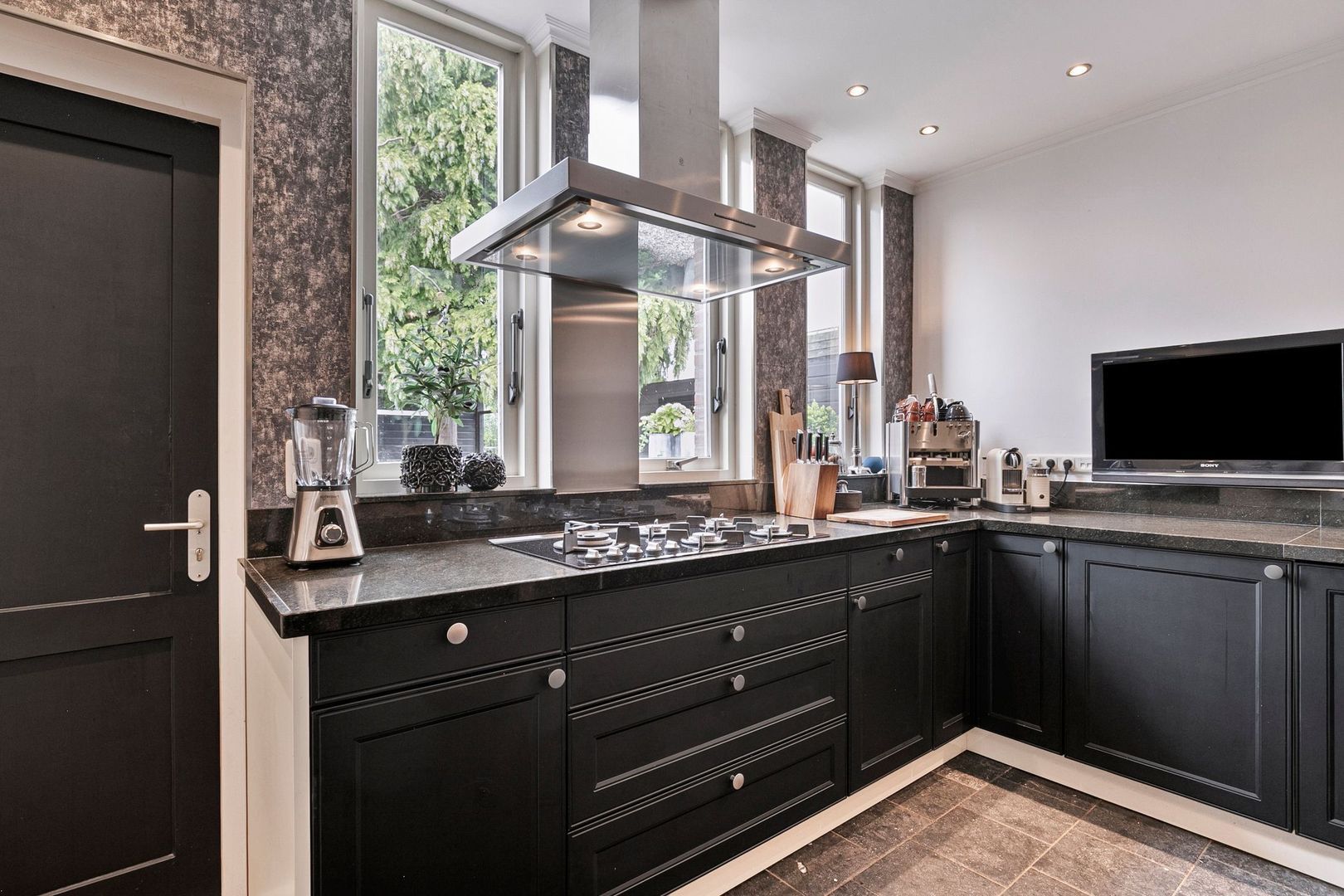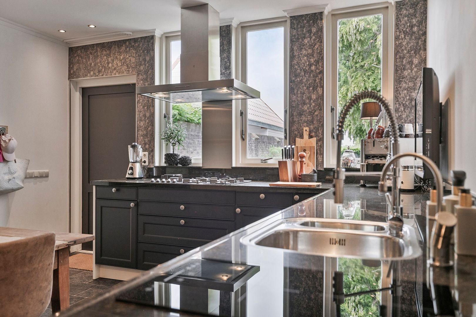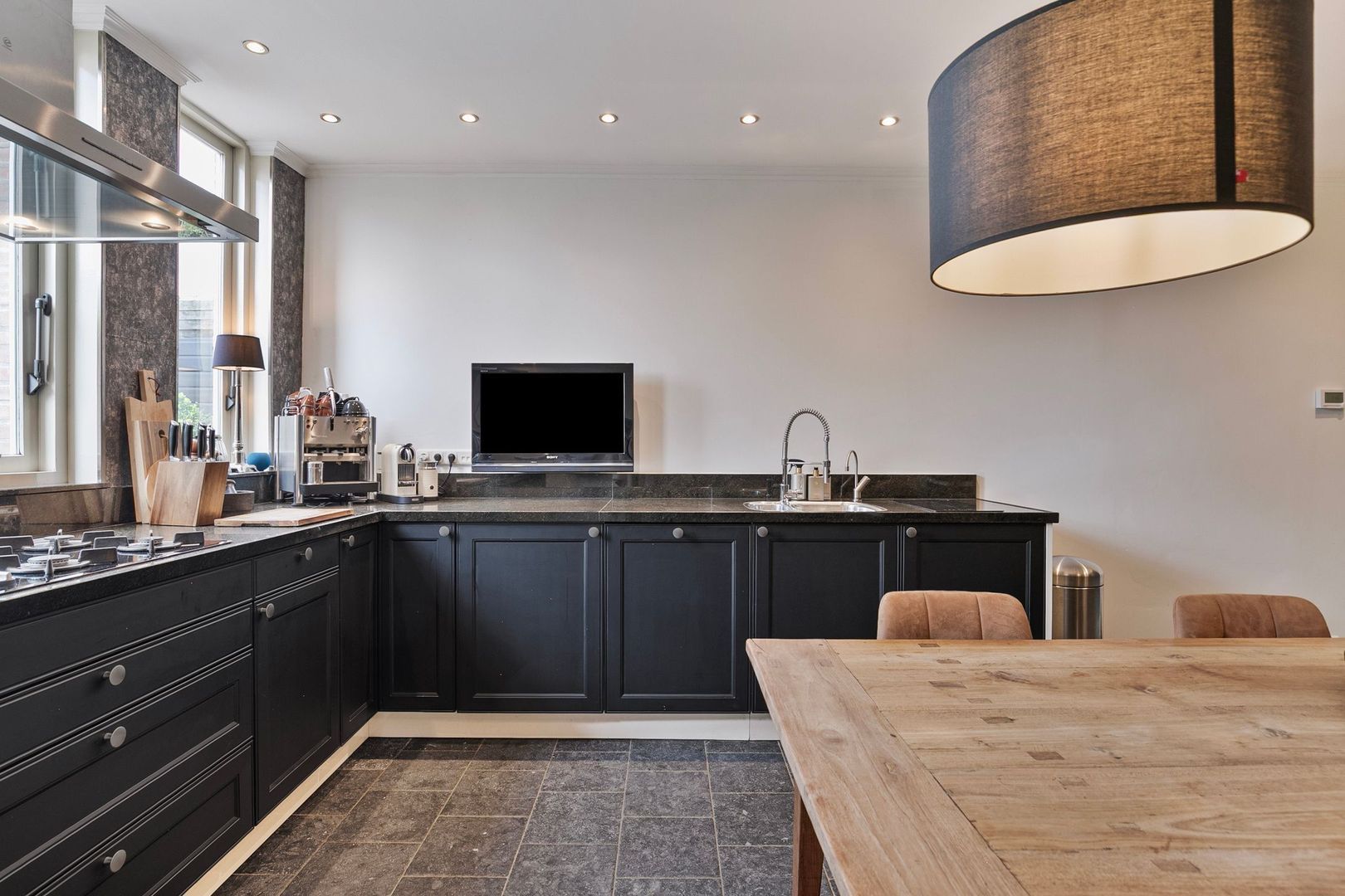 Aan de achterzijde bevindt zich de ruime keuken, uitgerust met een 5-pits gasfornuis, afzuigkap, oven, stoomoven, koelkast met flessenlade, koelkast met vriesvak, apothekerskast, inductiekookplaat, vaatwasser en een Quooker.