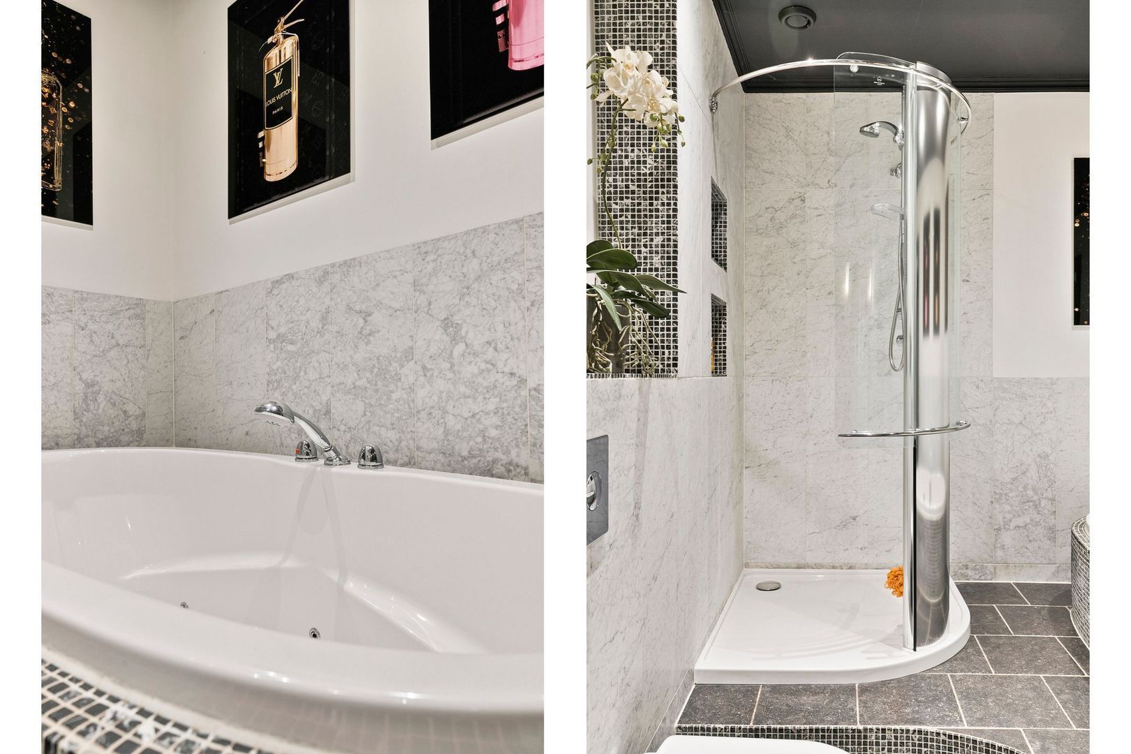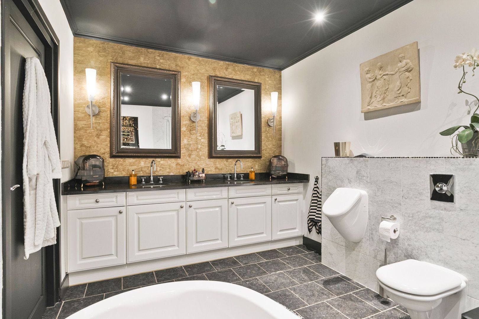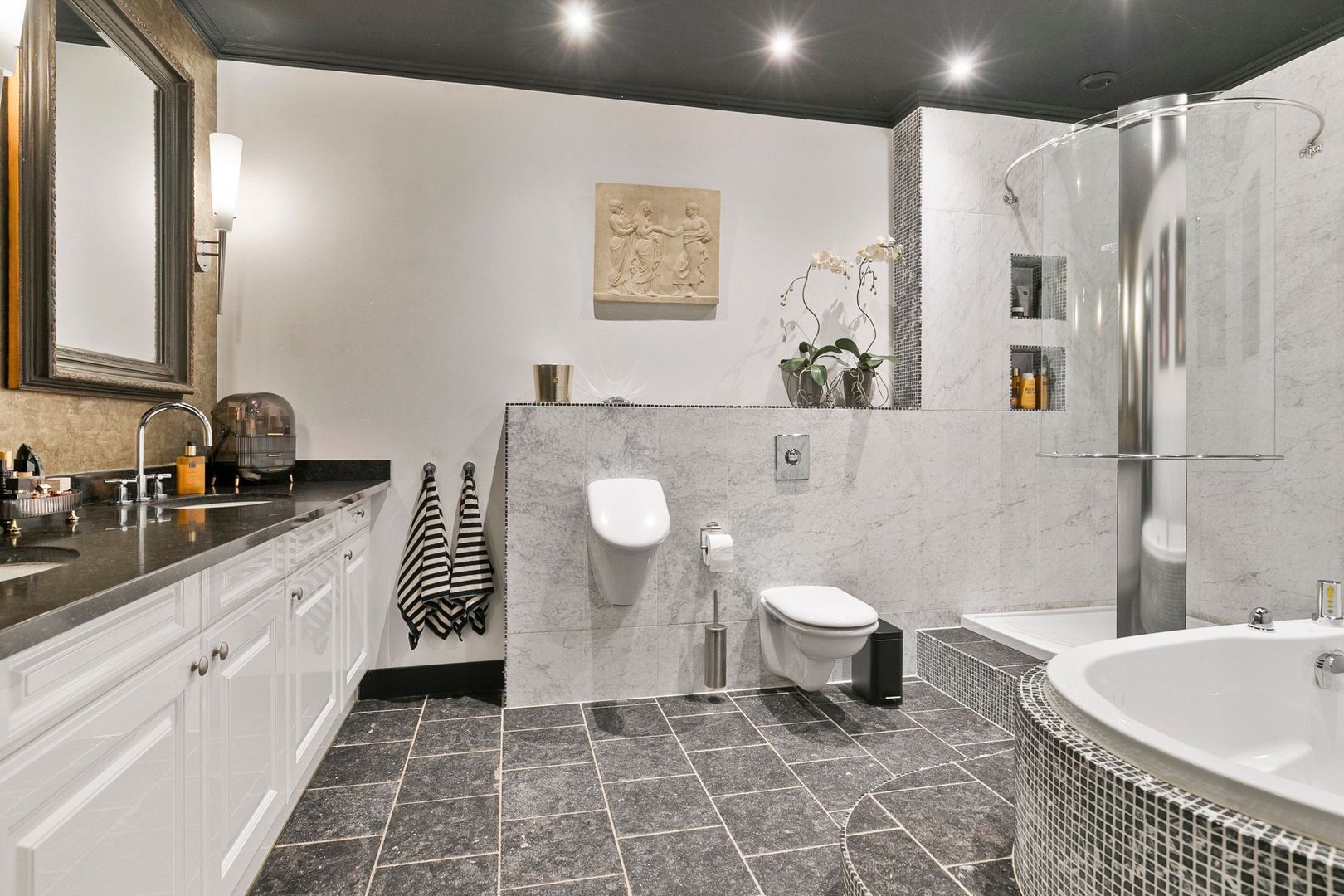 De nette badkamer is voorzien van een douche, ligbad, breed wastafelmeubel met wastafel, toilet, urinoir en comfortabele vloerverwarming.