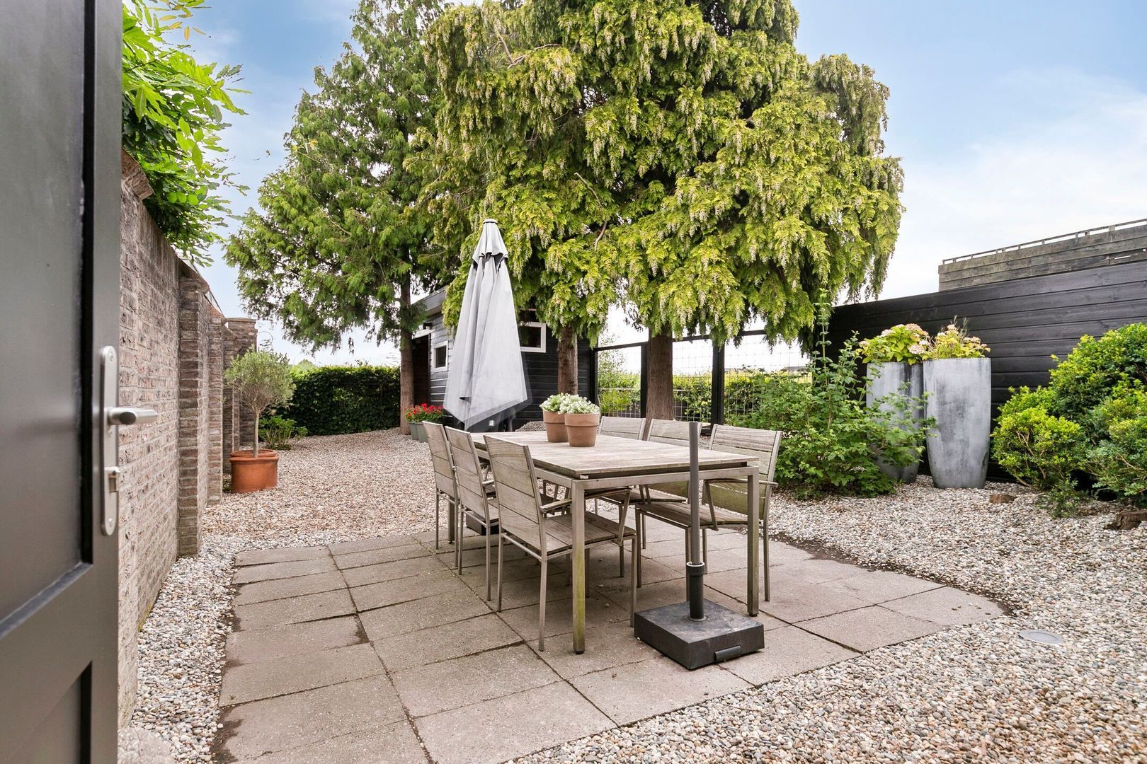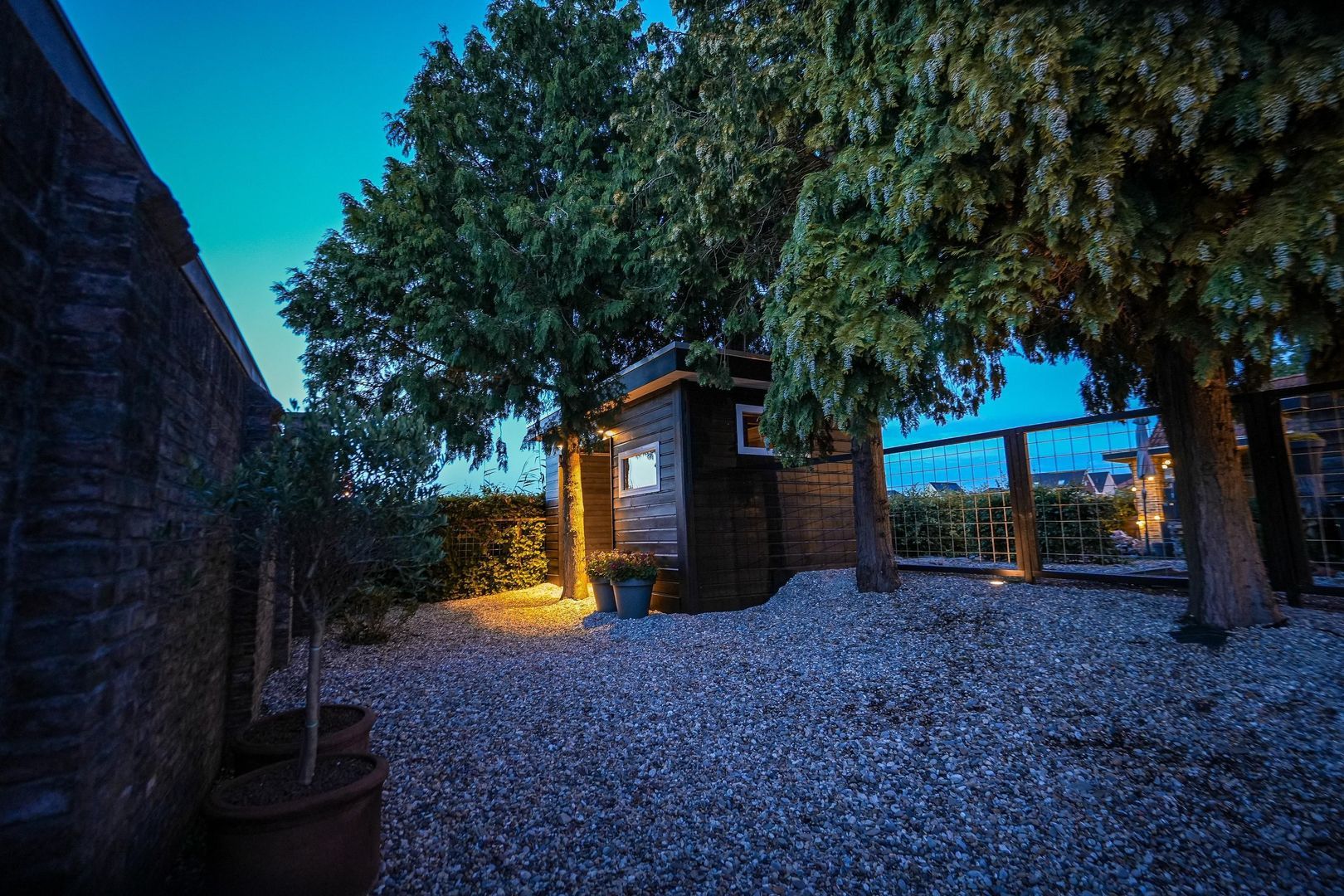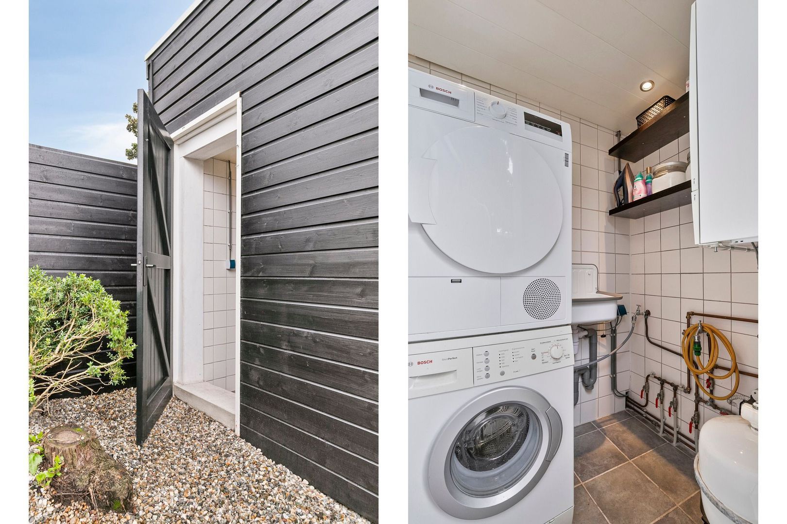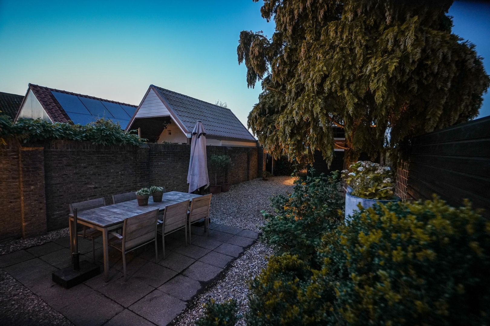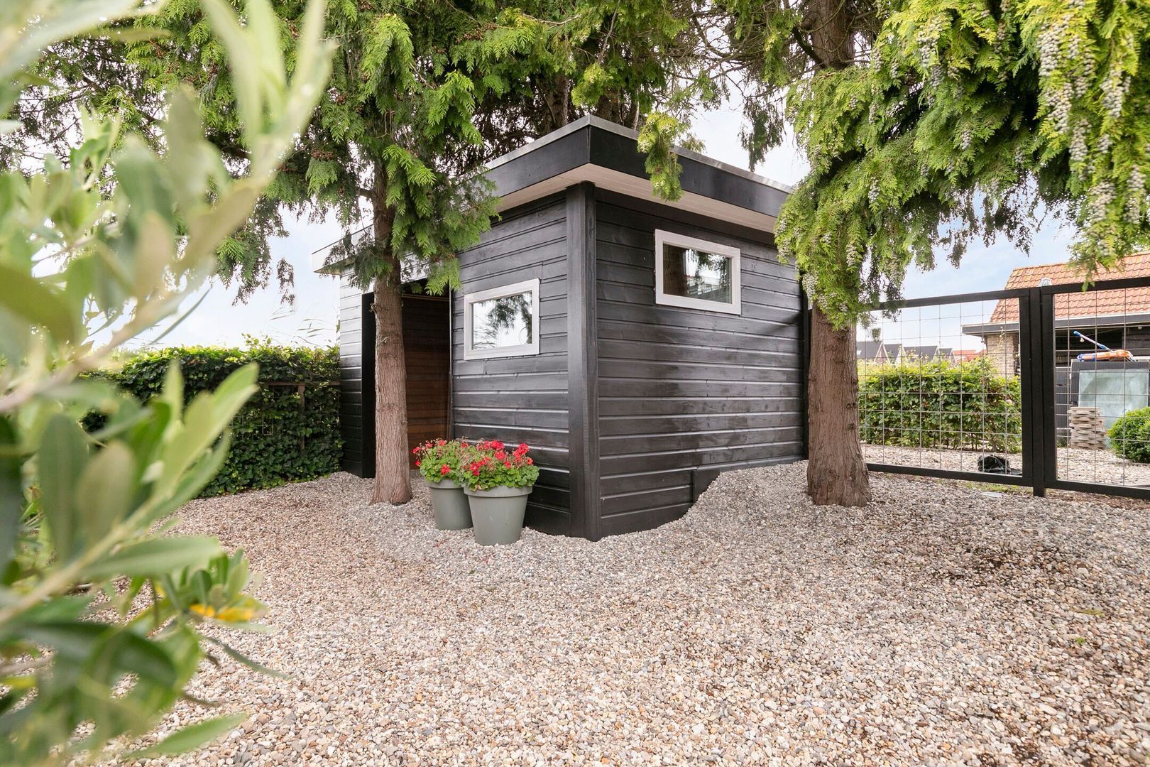 De zonnige achtertuin ligt op het noordoosten en is fraai aangelegd met diverse beplanting, struiken en bomen. Achterin de tuin staat een houten berging. Direct grenzend aan de woning bevindt zich een tweede berging met aansluitingen voor de wasmachine en droger, en de opstelplaats van de cv-ketel.