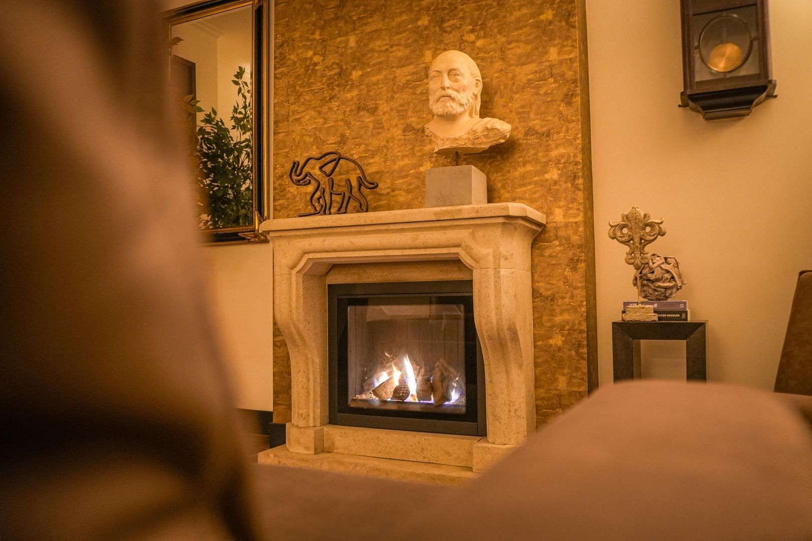 De sfeervolle woonkamer is voorzien van een houten vloer en een gezellige gashaard. Vanuit de woonkamer is er toegang tot de keuken en de badkamer.