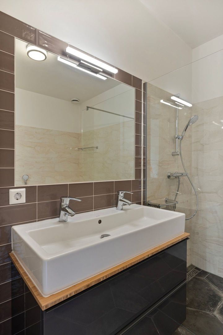 Moderne badkamer en is voorzien van een inloopdouche, wastafel met meubel en een ligbad.