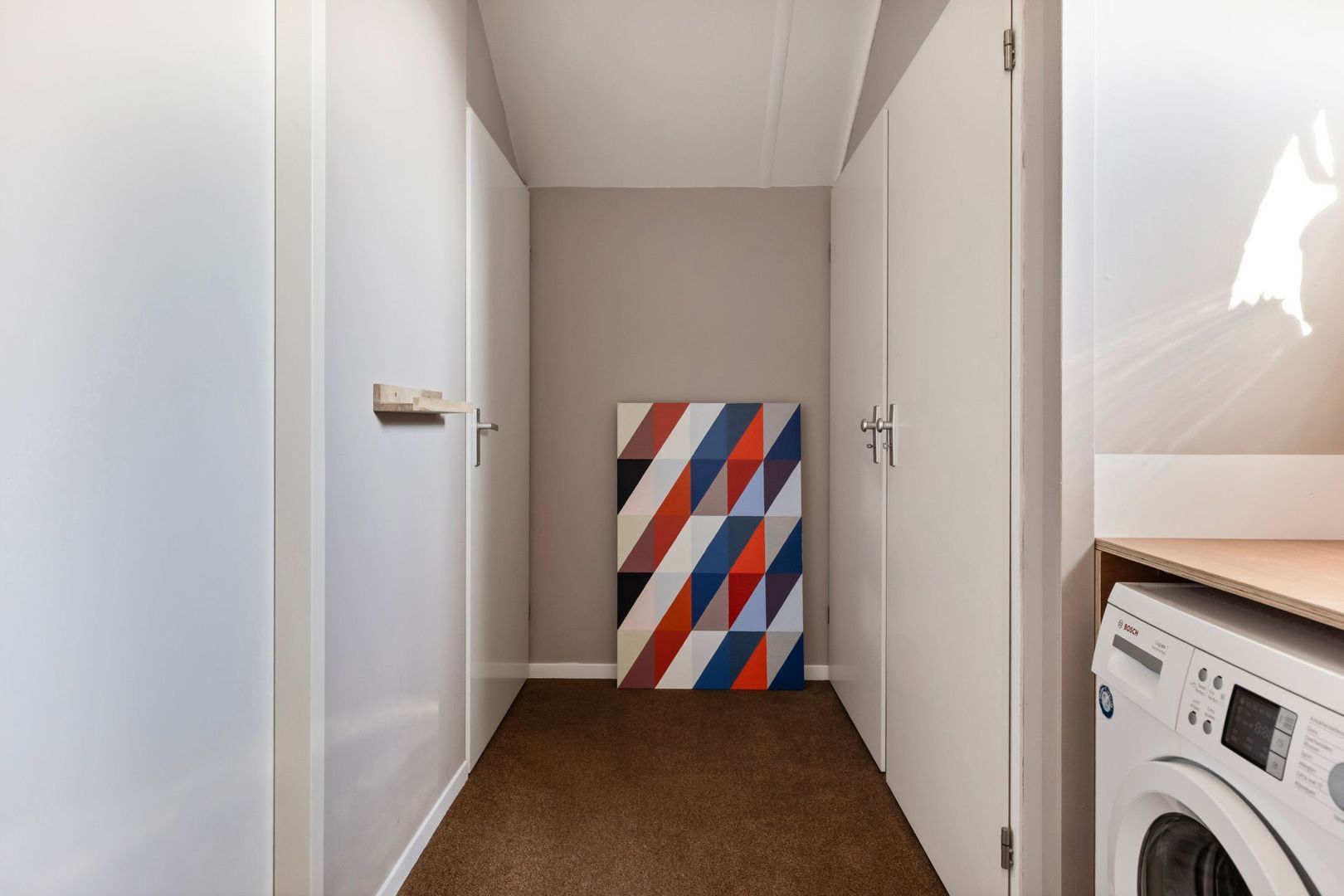 Op de overloop bevinden zich de aansluitingen voor de wasmachine en droger.