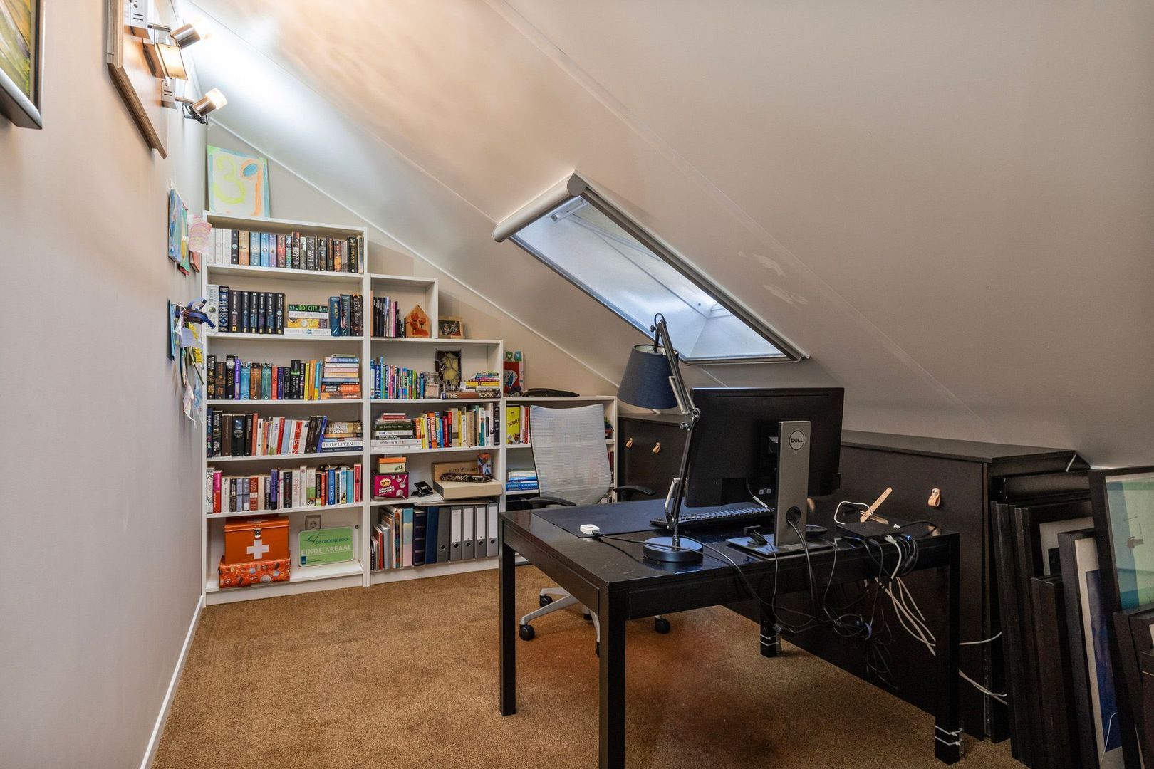 Slaapkamer 3 is aan de voorzijde gelegen, voorzien van twee Velux dakramen en een vaste kast met opstelplaats voor de cv-ketel. Deze kamer beschikt tevens over een eigen badkamer met inloopdouche en wastafelmeubel.