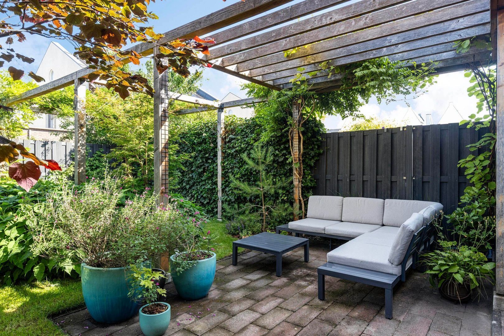 De fraai aangelegde achtertuin is gelegen op het noordwesten, ideaal voor middag- en avondzon.
