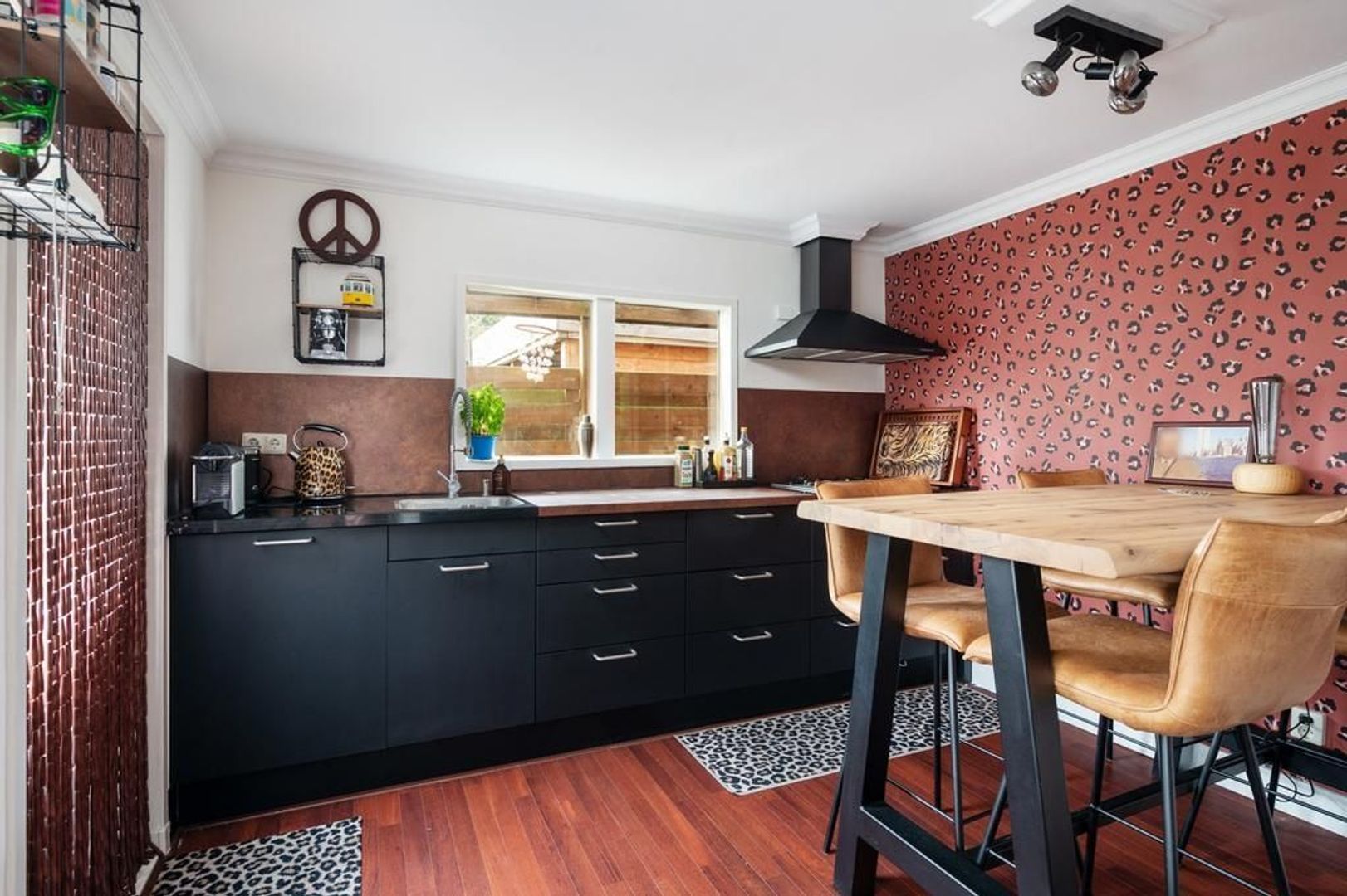 Doorgang naar de in de uitbouw gesitueerde woonkeuken. De keuken is in 2024 nog gemoderniseerd en is uitgevoerd met een recht aanrecht met diverse apparatuur zoals gaskookplaat met afzuigkap, kraan met spoelbak en vaatwasser. Vanuit de keuken heb je toegang tot de achtertuin en kan je naar de zijkant van het huis waar de berging staat.