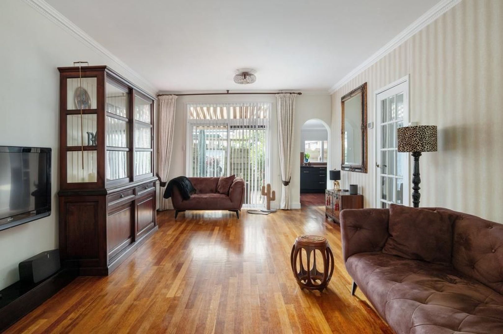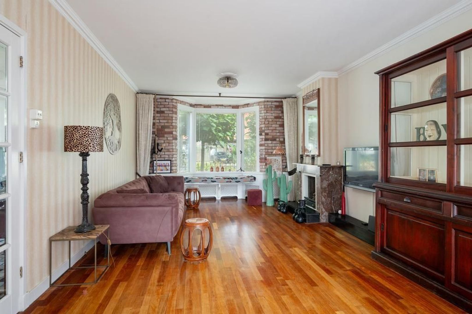 De grote woonkamer heeft aan de voorzijde een erker met een leuk zitje, een sierlijke gashaard met marmeren schouw en op de vloer ligt een mooie parketvloer. Via de aluminium schuifpui aan de achterzijde stap je zo de achtertuin in.