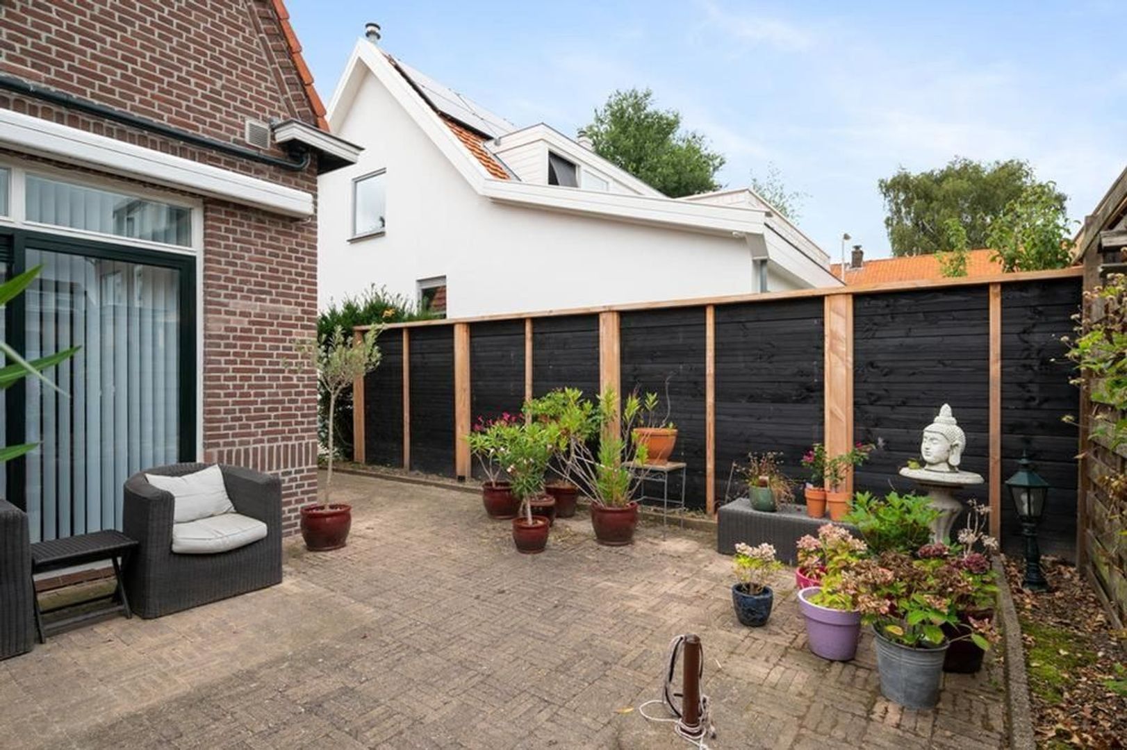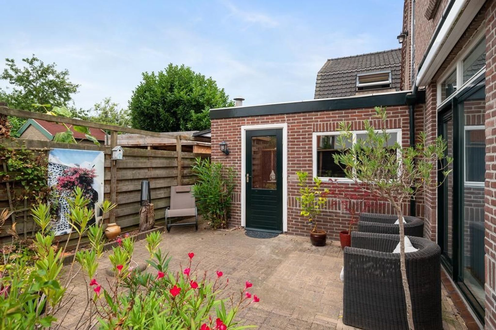 De zonnige achtertuin, gelegen op het zuidwesten, is grotendeels betegeld en biedt veel privacy. Aan de uitbouw is een overkapt gedeelte waar bijvoorbeeld de barbecue opgeborgen kan worden. Ook is er een elektrisch zonnescherm op de achtergevel.
