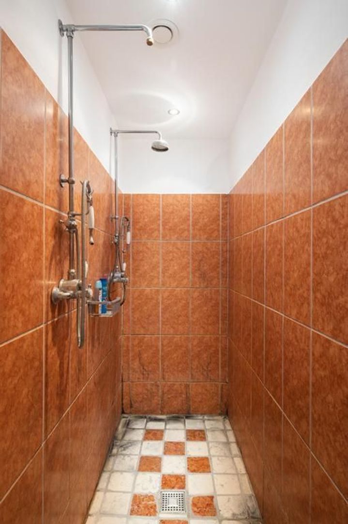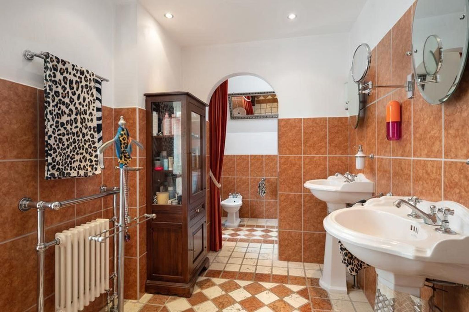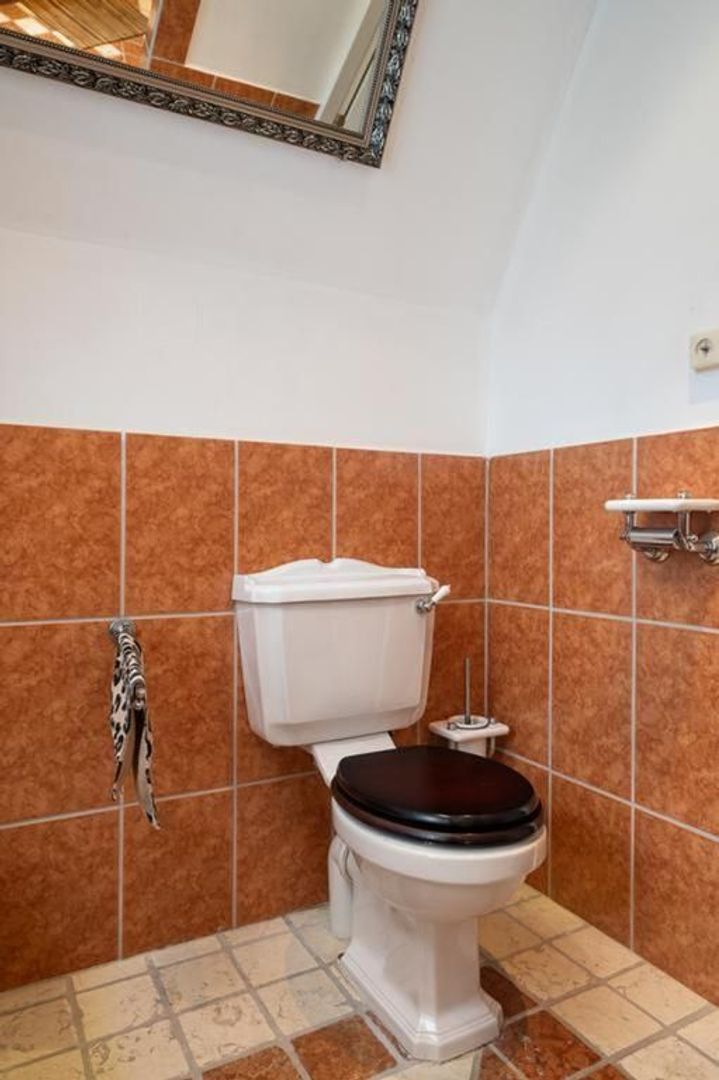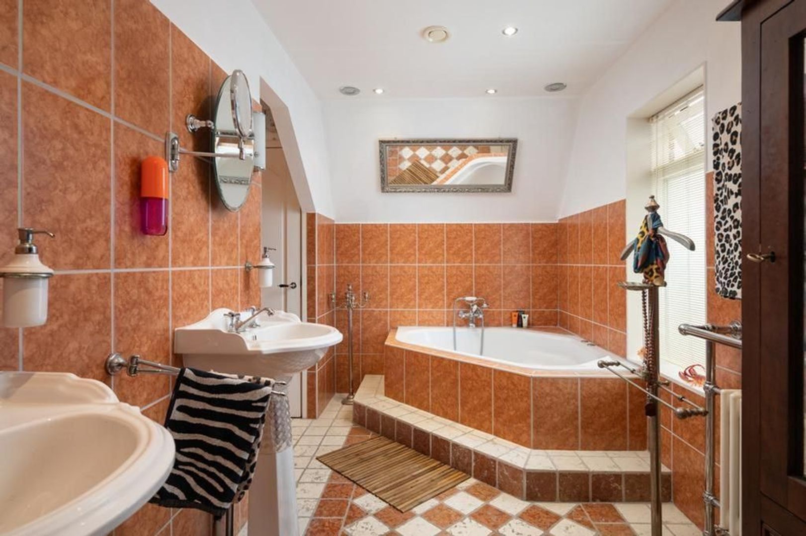 Badkamer aan de achterzijde met toilet, bidet, 2 wastafels, hoekbad, vaste inbouwkast en diepe inloopdouche.