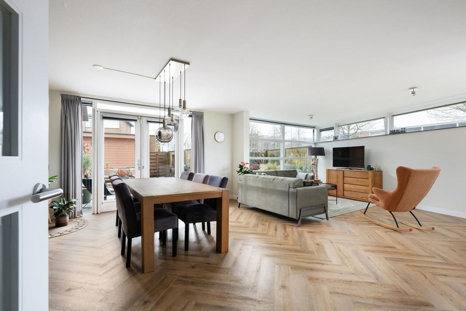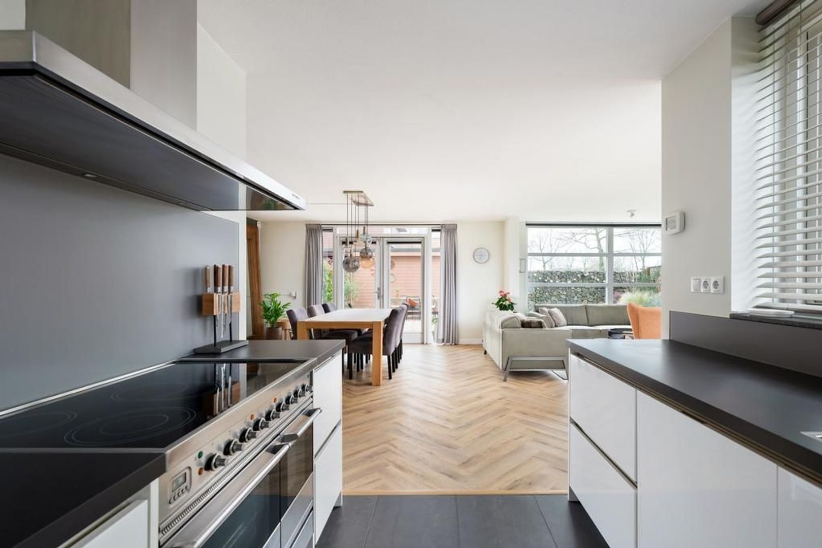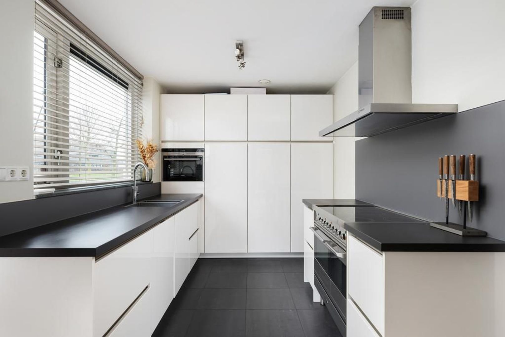 Vanuit de hal is er toegang tot de ruime lichte woonkamer, onder de trap bevindt zich een diepe opbergkast. De moderne open keuken is voorzien van een vaatwasser, keramische kookplaat, magnetron, dubbele oven, koel-vries combinatie en spoelbak met mengkraan.