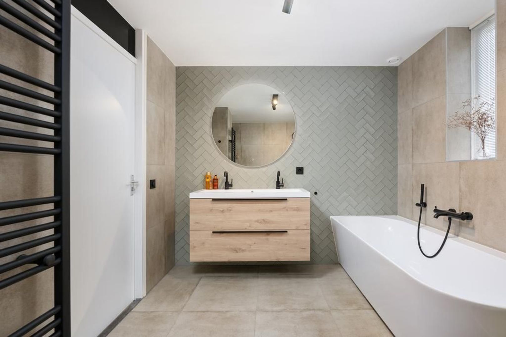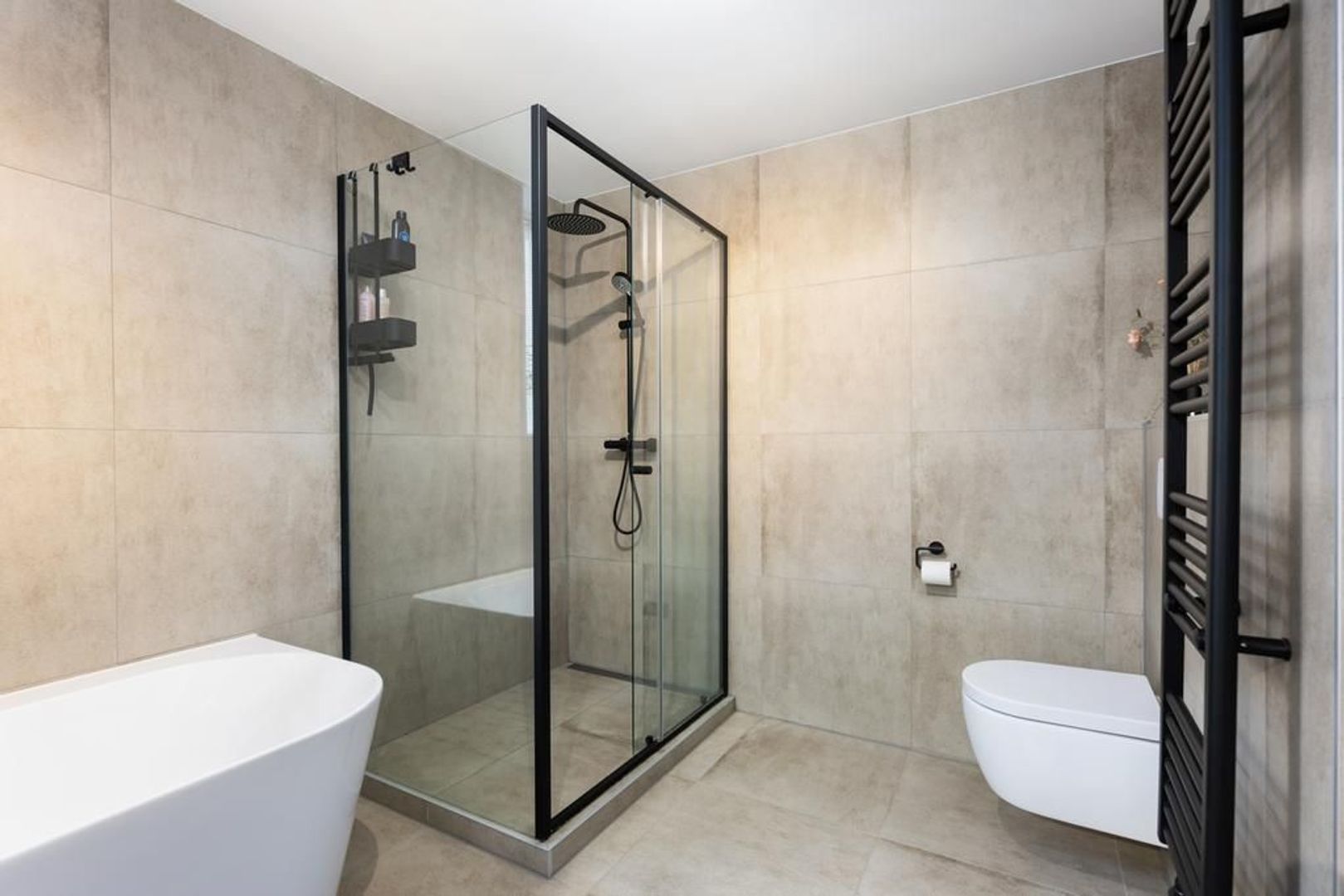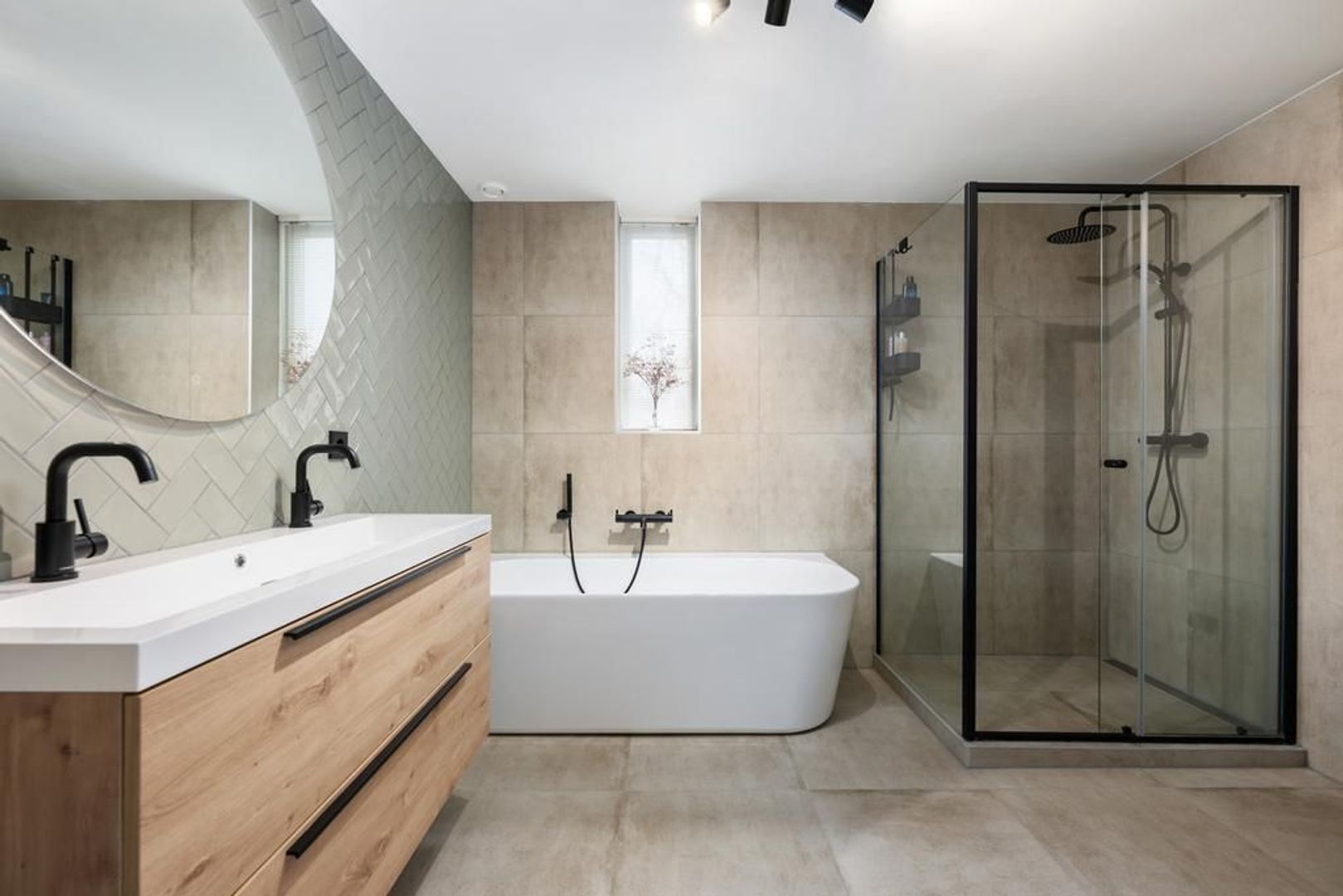 De moderne ruime badkamer is voorzien van een douche, ligbad, dubbele wastafel met meubel, spiegel met verwarming en verlichting, toilet en handdoekradiator.