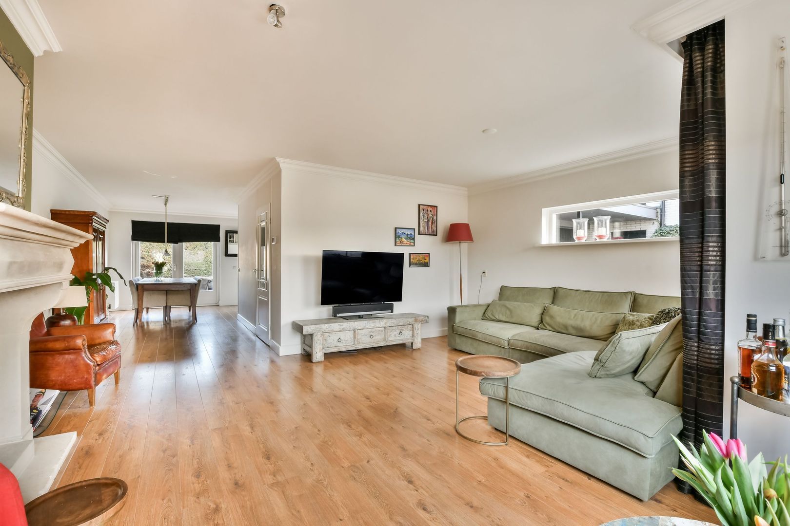 De ruime woonkamer aan de voorzijde is voorzien van een gezellige gashaard, een erker en een fraaie laminaatvloer.