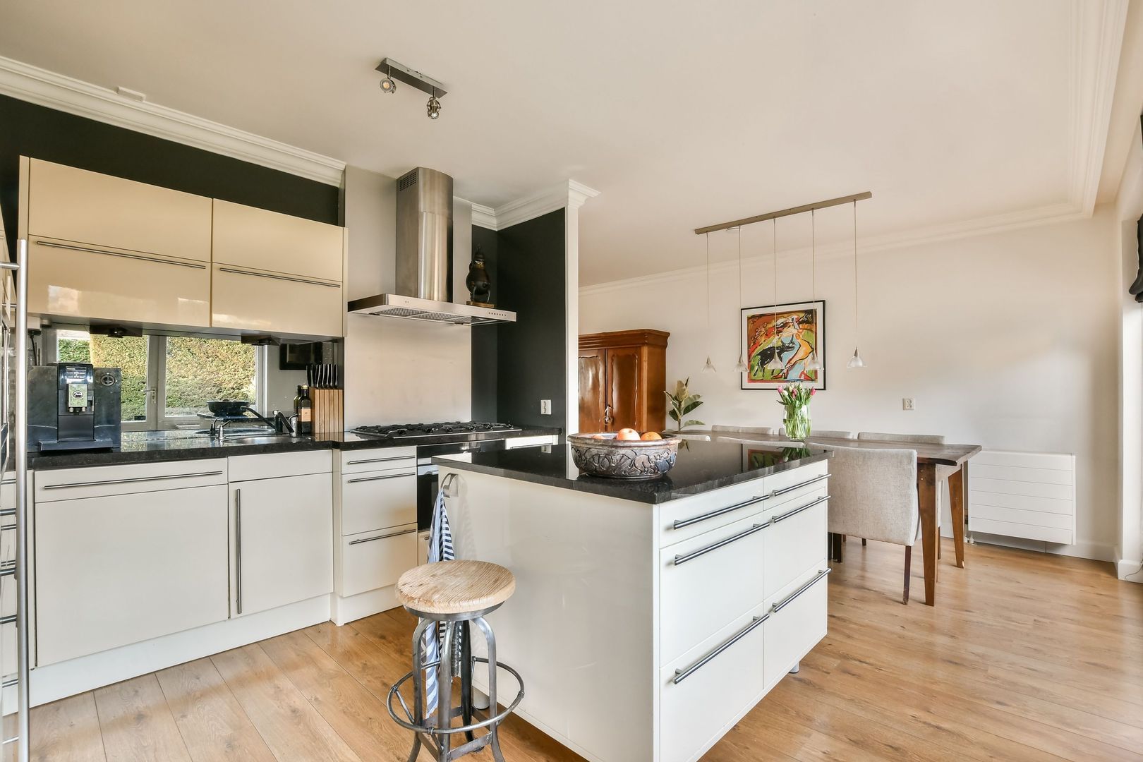 De open leefkeuken bevindt zich aan de achterzijde en is uitgerust met diverse inbouwapparatuur, waaronder een gasfornuis, afzuigkap, magnetron, oven, vaatwasser en koelkast.