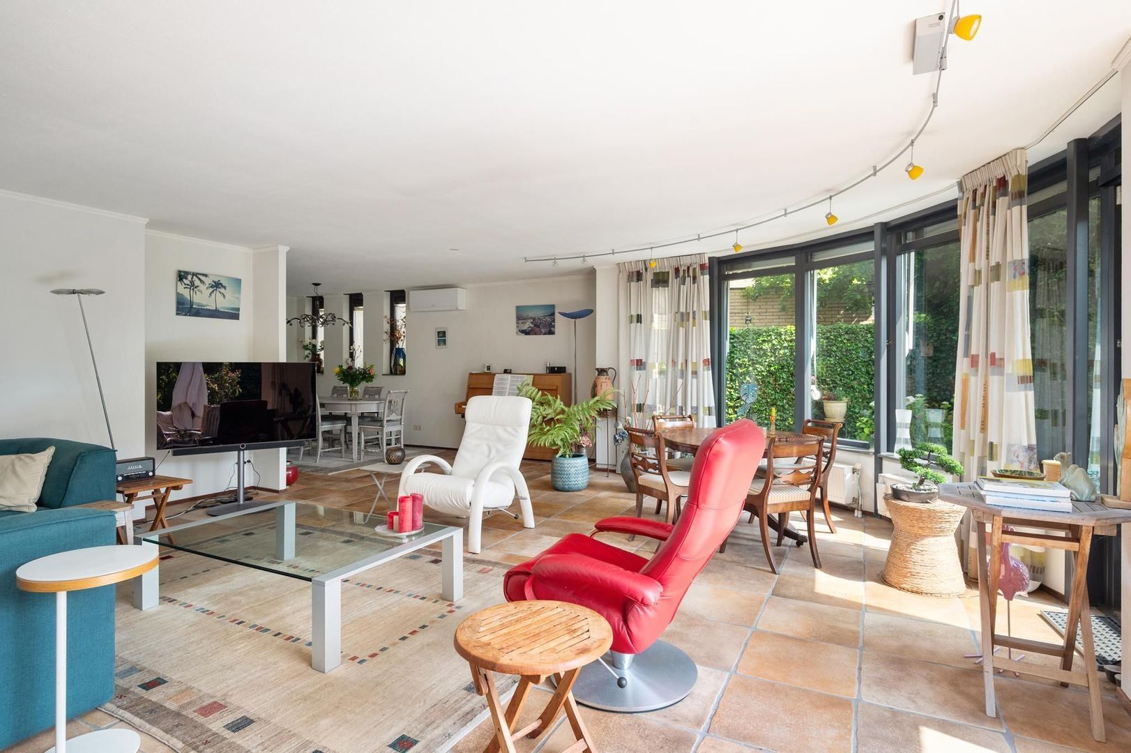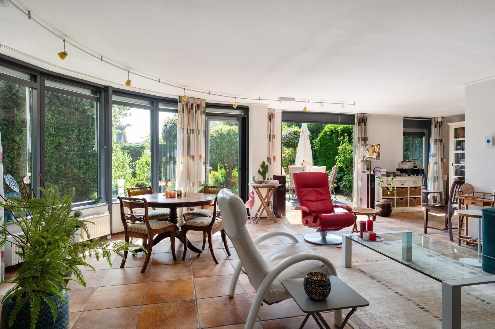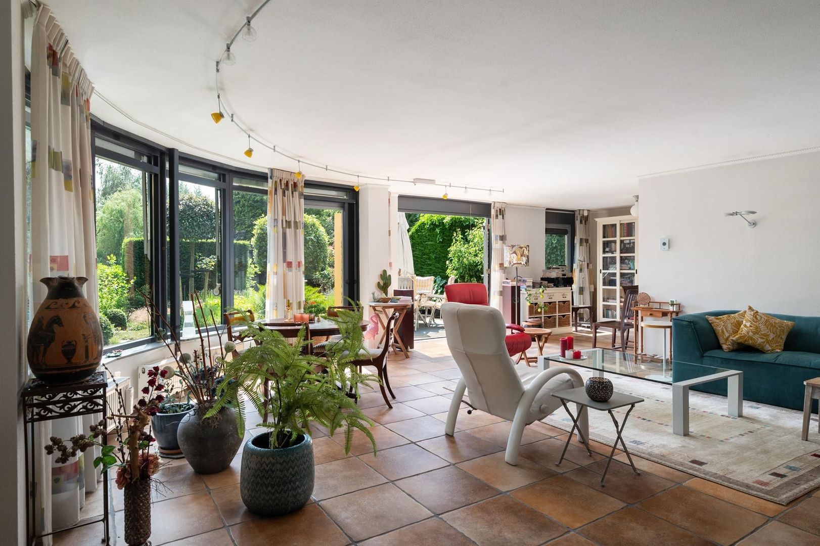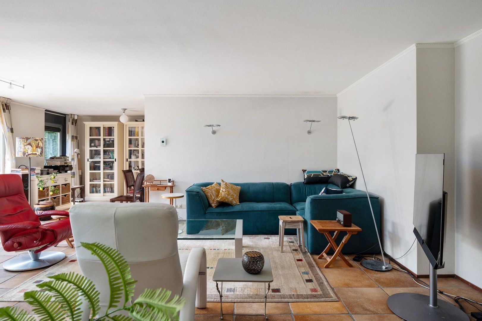 Ruime woonkamer met veel lichtinval door de grote raampartij. De openslaande deuren geven toegang tot de goed onderhouden tuin.