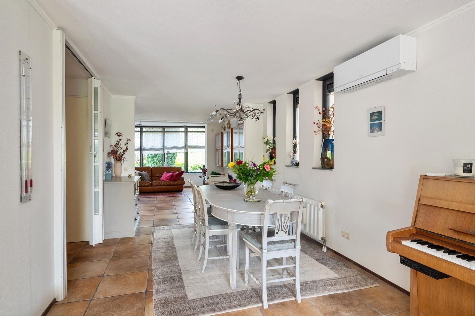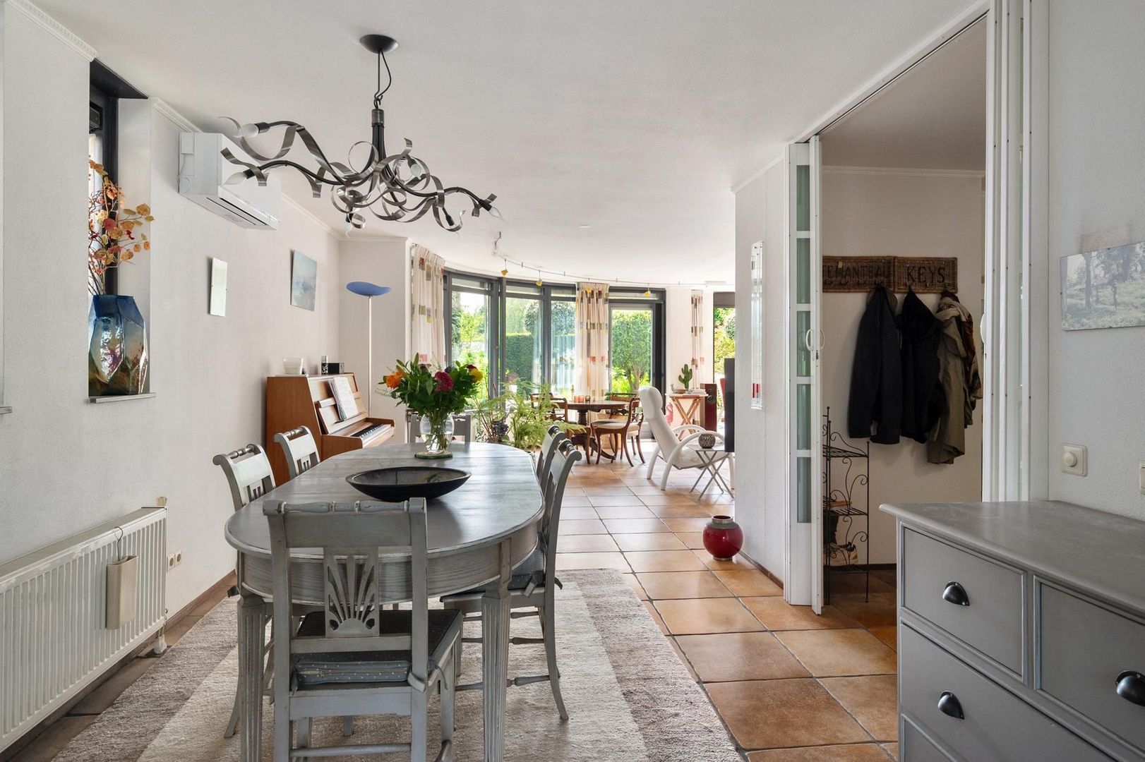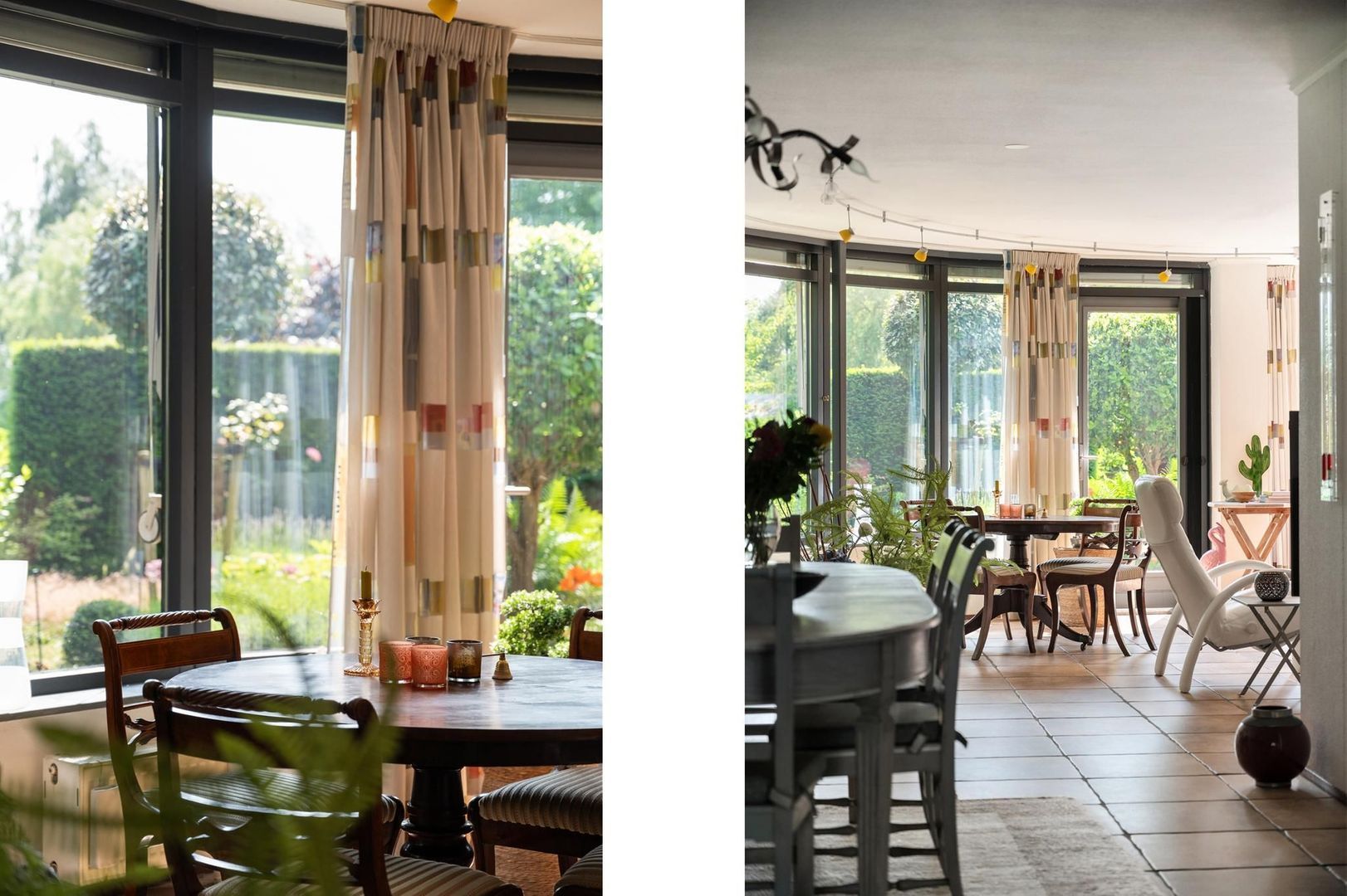 Ruime woonkamer met veel lichtinval door de grote raampartij. De openslaande deuren geven toegang tot de goed onderhouden tuin.