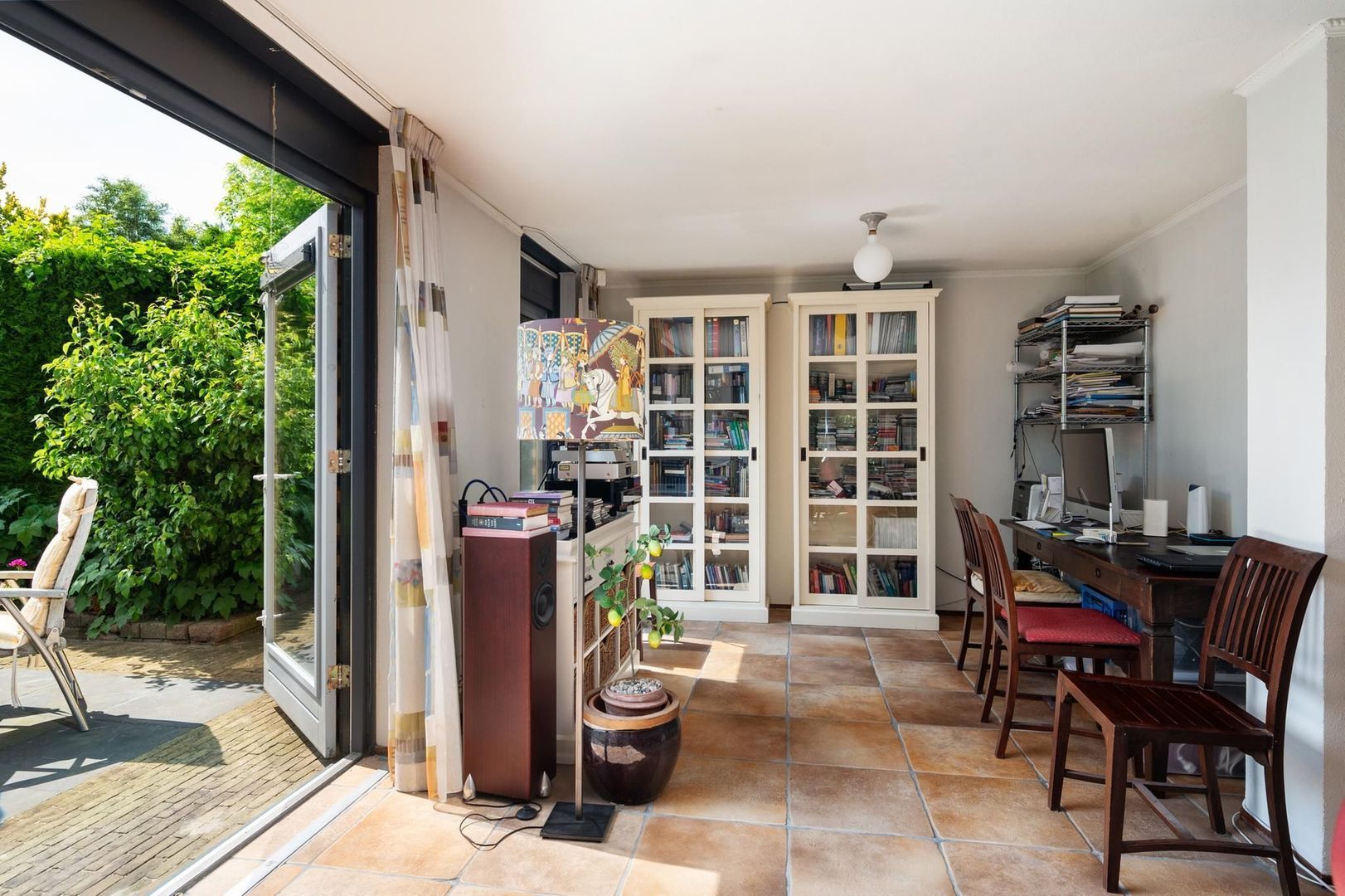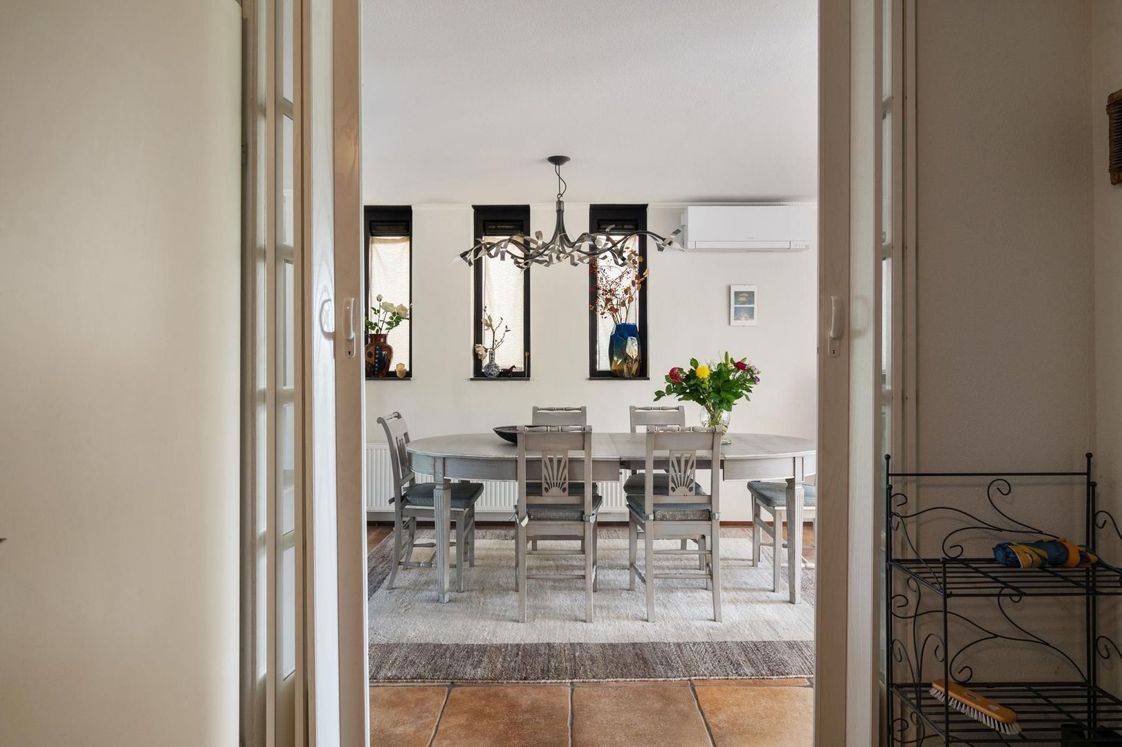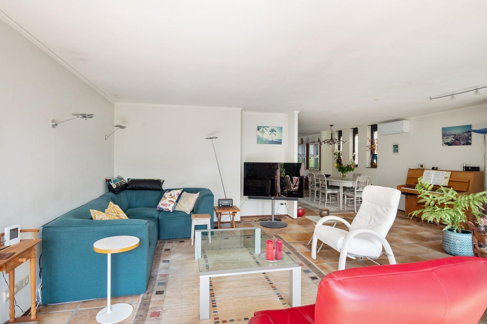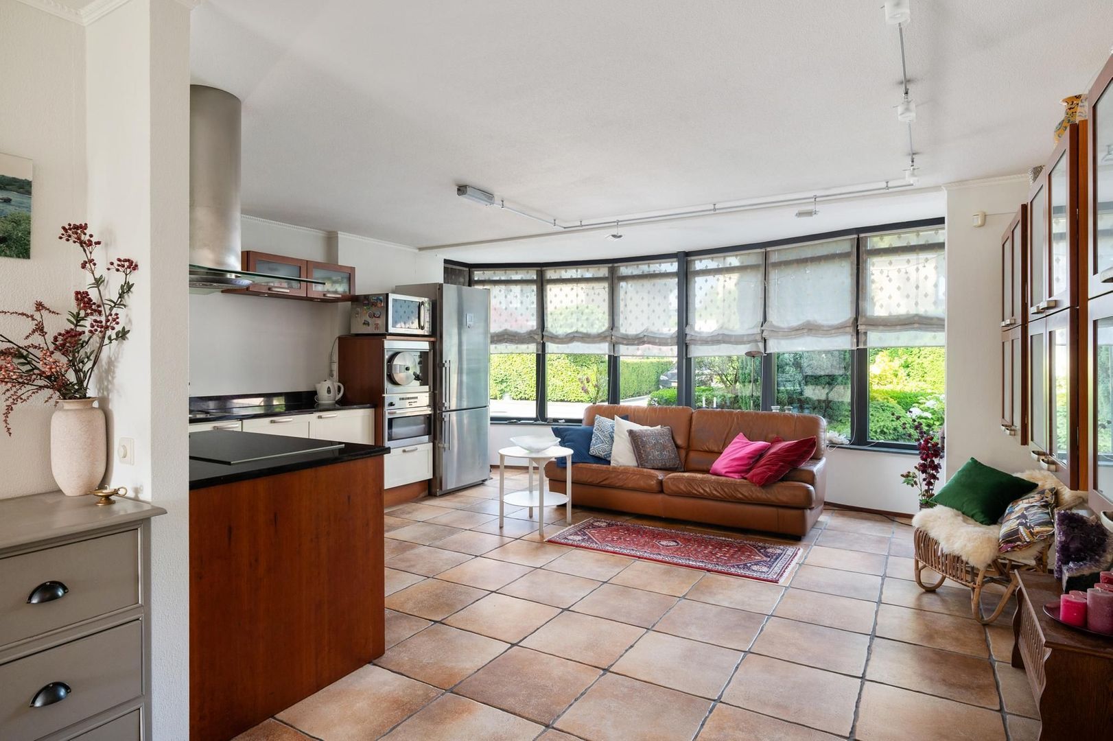 Ruime woonkamer met veel lichtinval door de grote raampartij. De openslaande deuren geven toegang tot de goed onderhouden tuin.