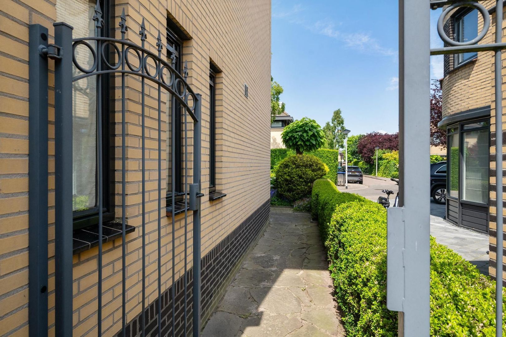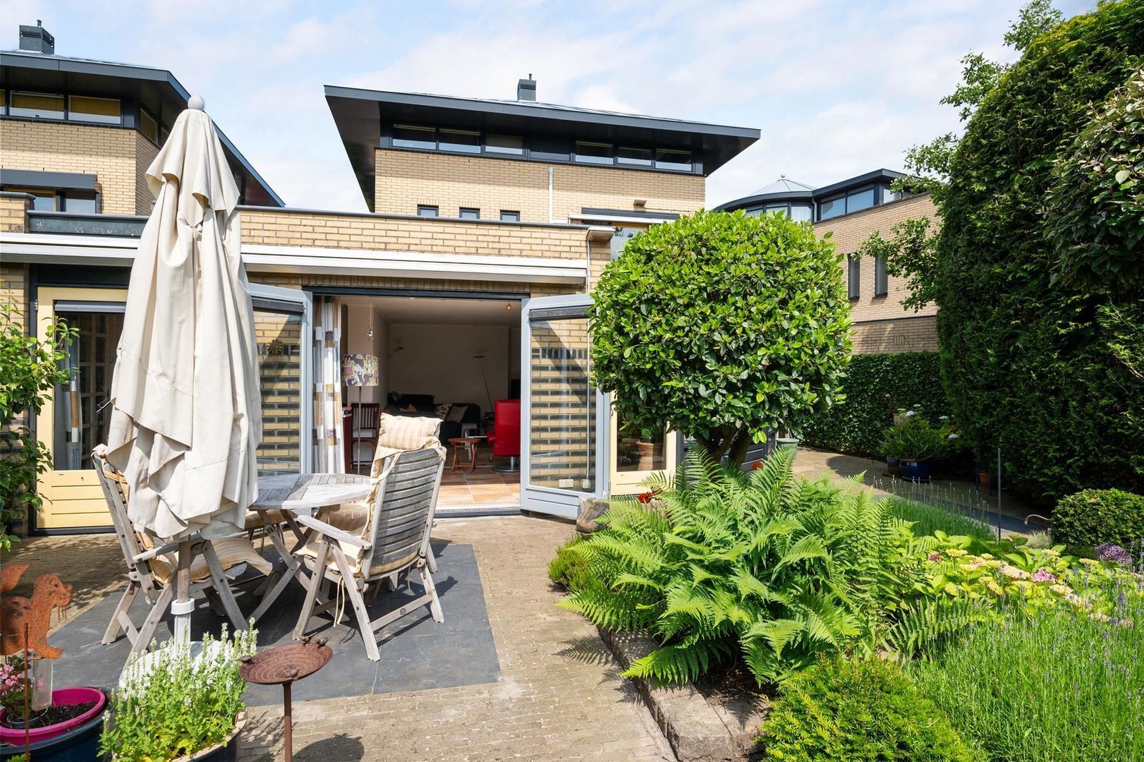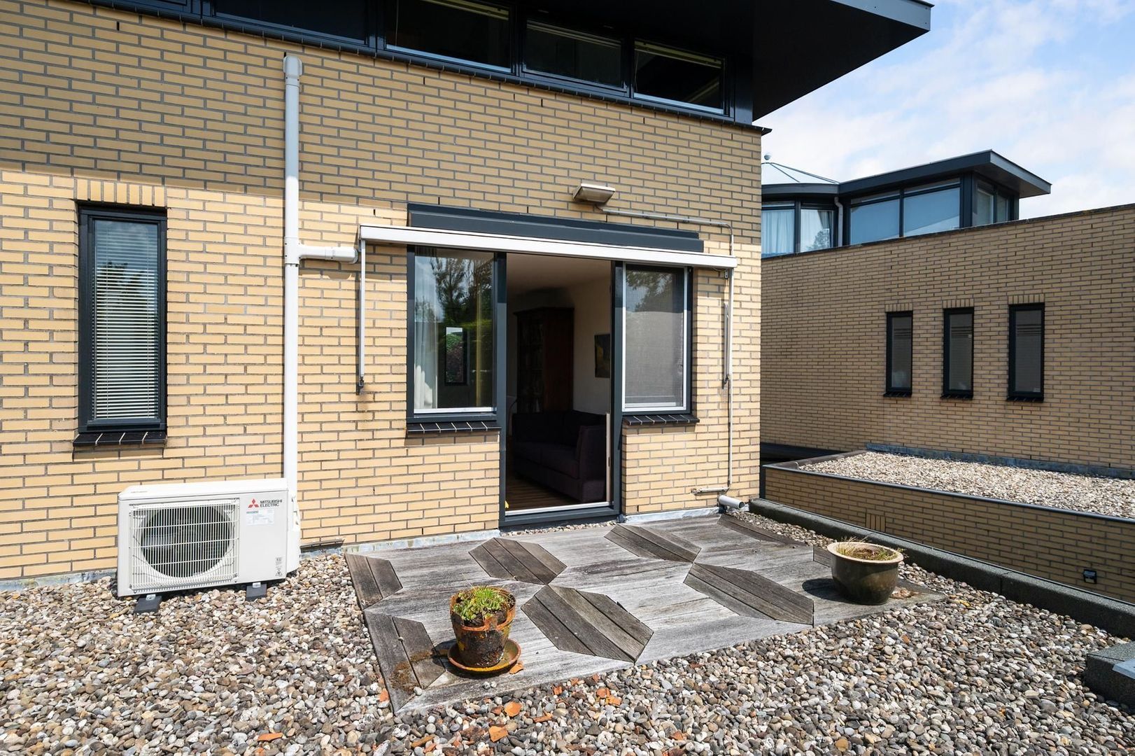 Ruime voortuin met plek om twee auto's te parkeren, met laadpunt voor elektrische auto en toegang tot de garage. De garage, met aansluiting voor de wasmachine en droger, beschikt over airco/warmte pomp en mechanische ventilatie en is af te sluiten met massief houten deuren met driesterrenbeslag.