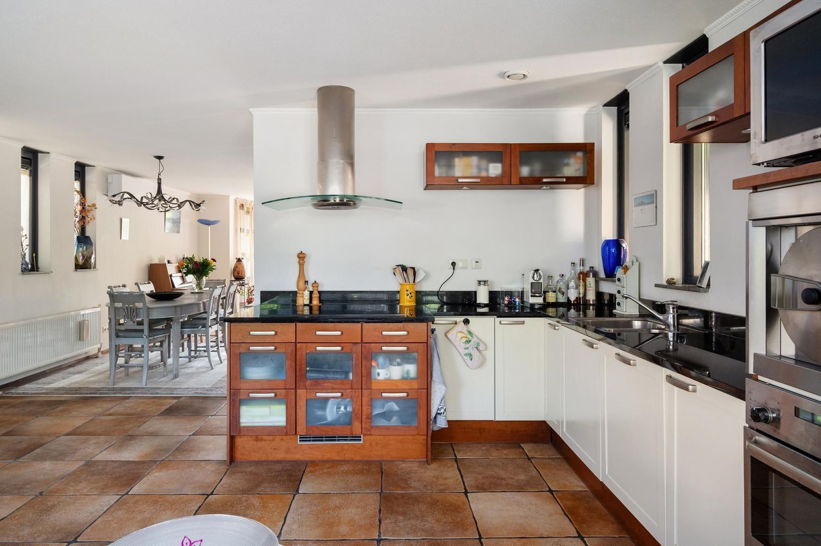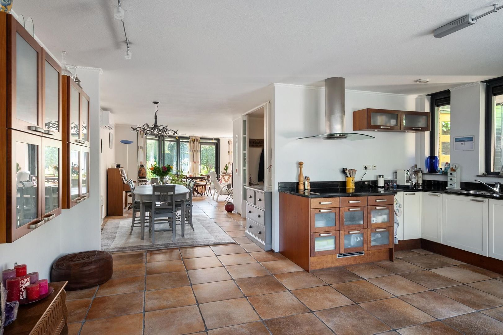 De zeer royale open woonkeuken is aan de voorkant van het huis gelegen en is voorzien van granieten aanrechtbladen een vijfpits inductie kookplaat met afzuigschouw, close-in-boiler, vaatwasser, grote koelkast, combimagnetron en stoomoven. In de hal, woonkamer en keuken ligt een Spaanse tegelvloer.