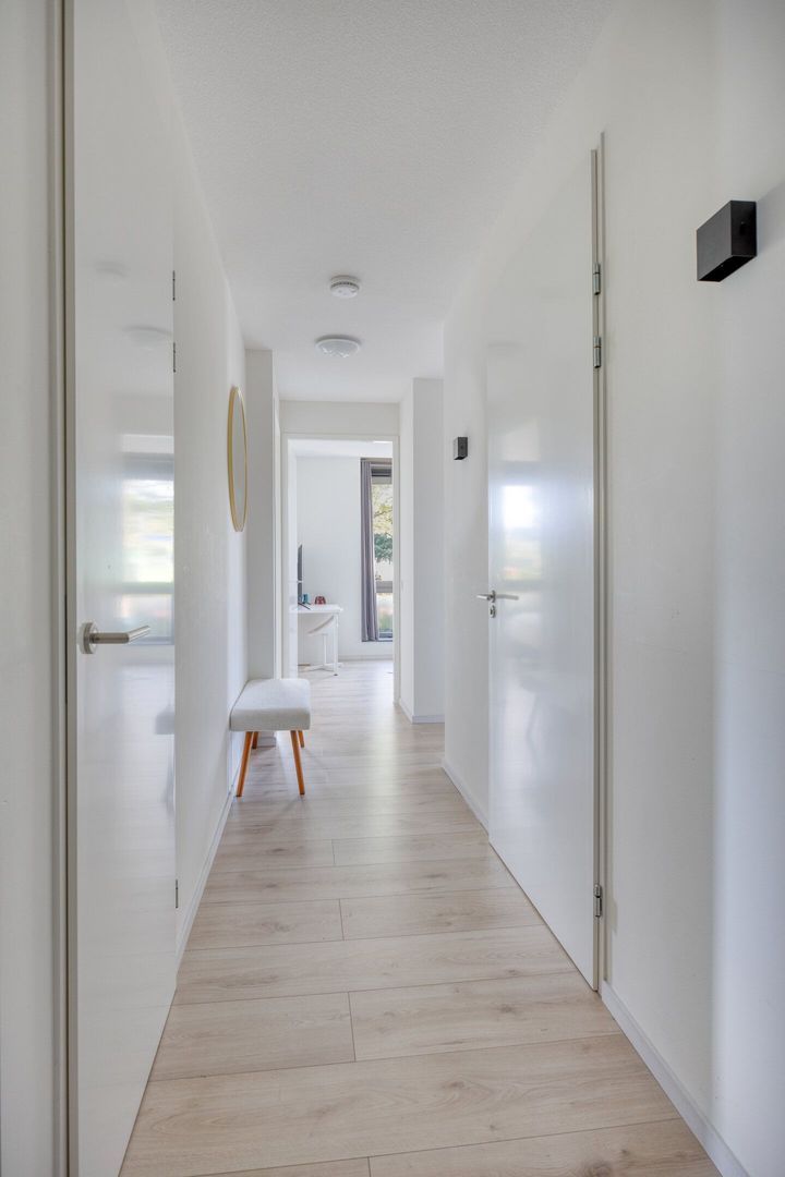 De lichte en ruime woonkamer heeft grote ramen die zorgen voor veel lichtinval en een fijn uitzicht. De moderne open keuken is uitgerust met Siemens inbouwapparatuur, waaronder: inductiekookplaat, afzuigkap, combi-oven, heetwaterkraan, koel-vriescombinatie en vaatwasser.