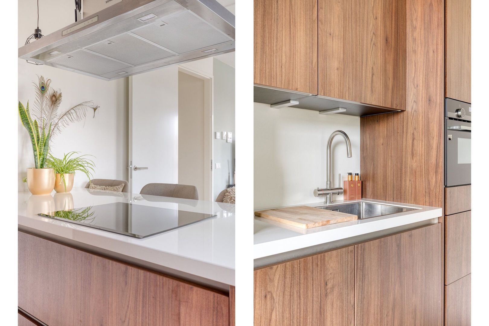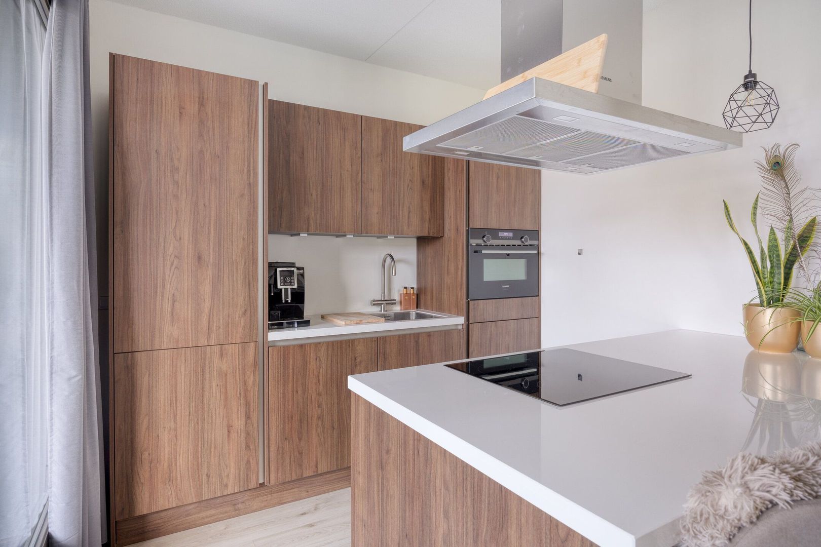 De lichte en ruime woonkamer heeft grote ramen die zorgen voor veel lichtinval en een fijn uitzicht. De moderne open keuken is uitgerust met Siemens inbouwapparatuur, waaronder: inductiekookplaat, afzuigkap, combi-oven, heetwaterkraan, koel-vriescombinatie en vaatwasser.