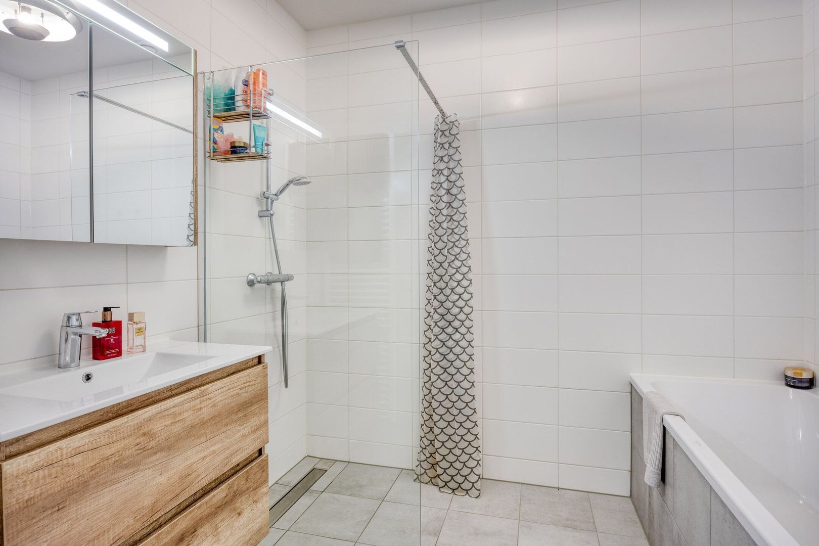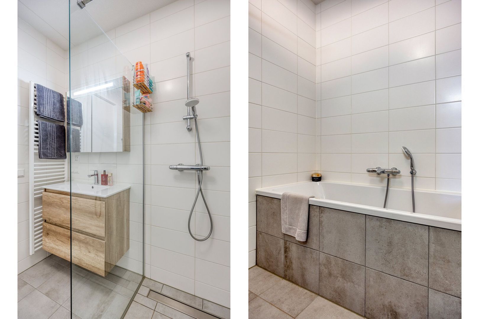 De moderne badkamer is voorzien van een ligbad, douche, wastafel met meubel, spiegel met verlichting en handdoekradiator.