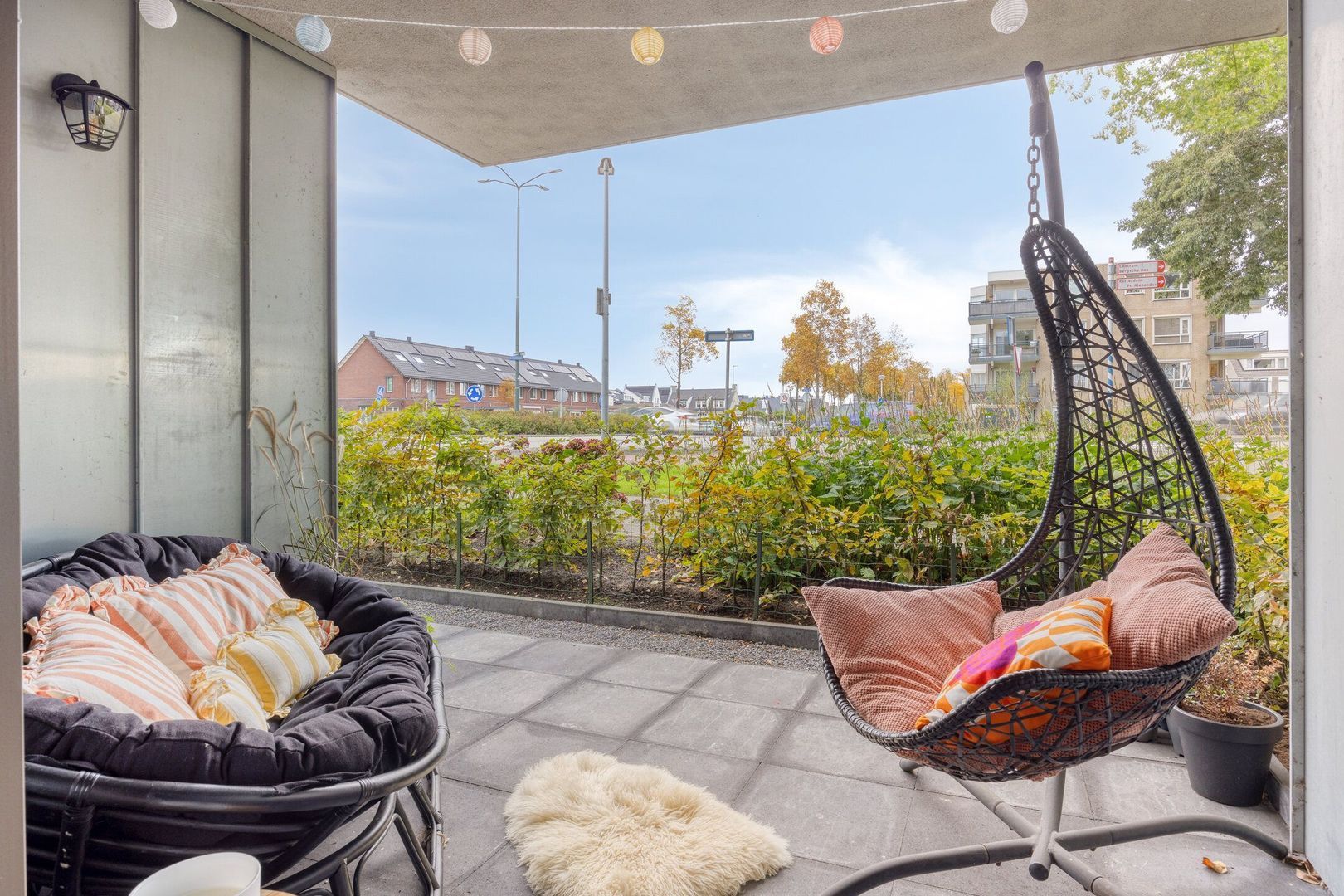 Via de schuifpui bereik je het sfeervolle terras, perfect voor een kopje koffie in de ochtendzon.