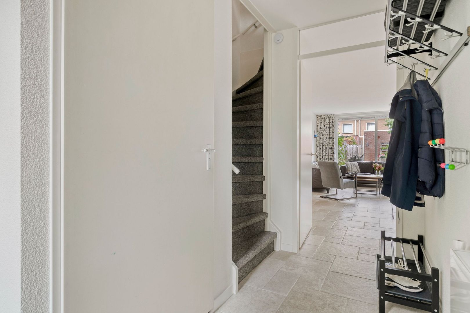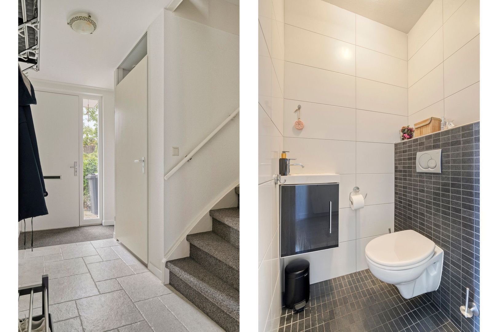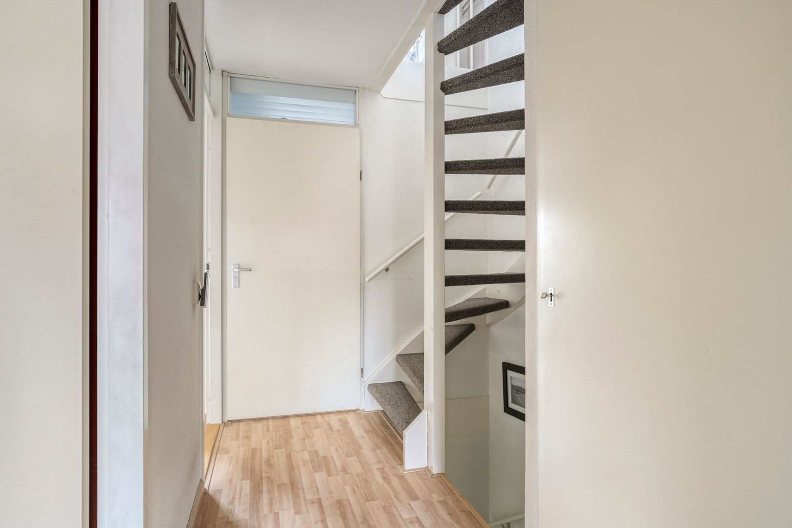 Entree, hal met meterkast, toilet, trapopgang naar de 1e verdieping en toegang tot de woonkamer.