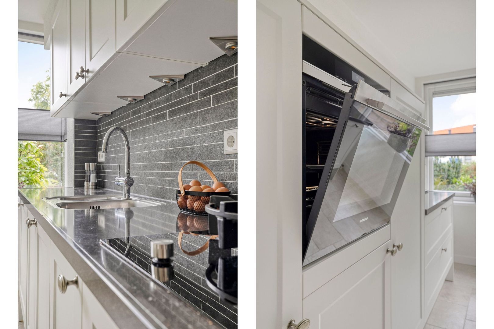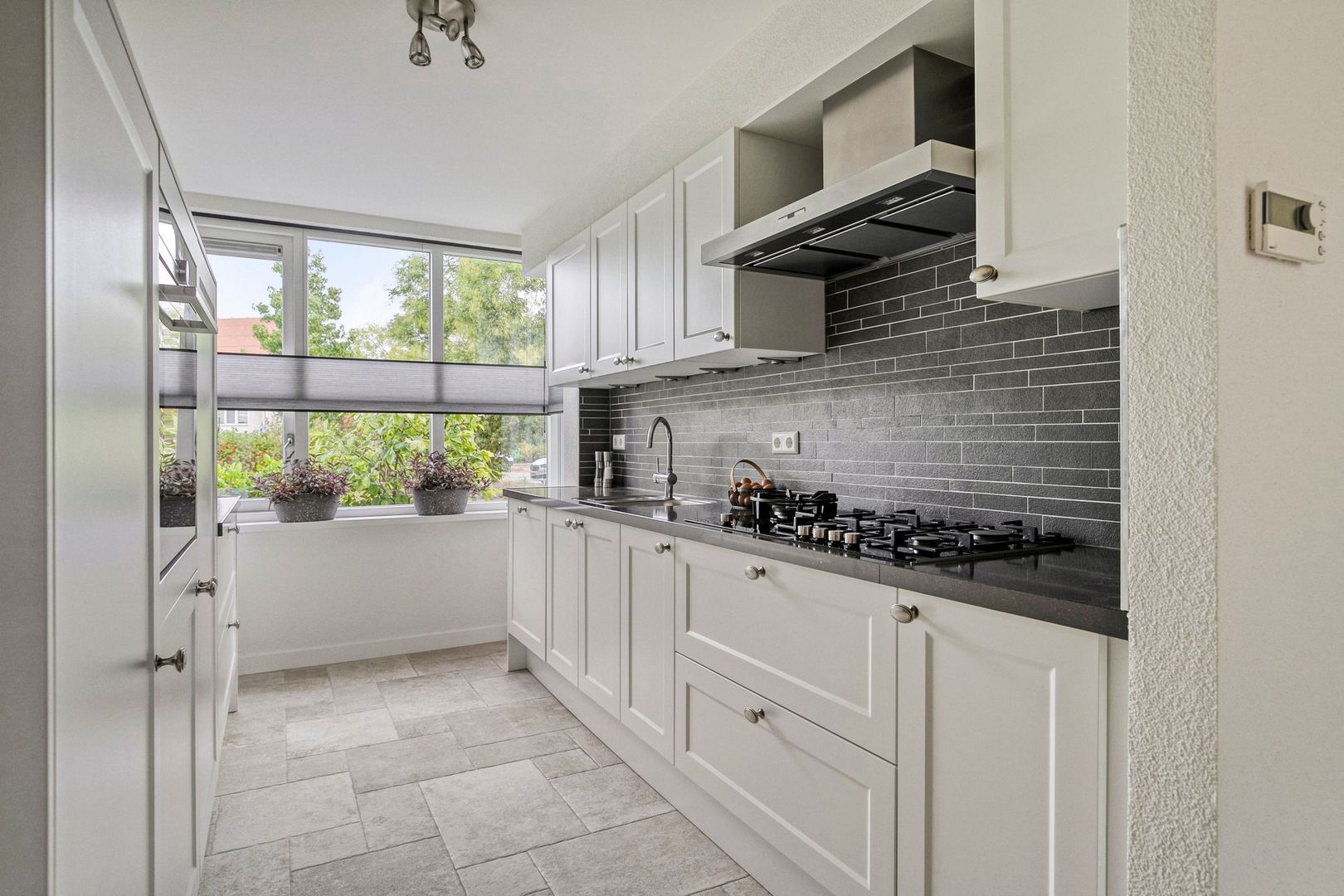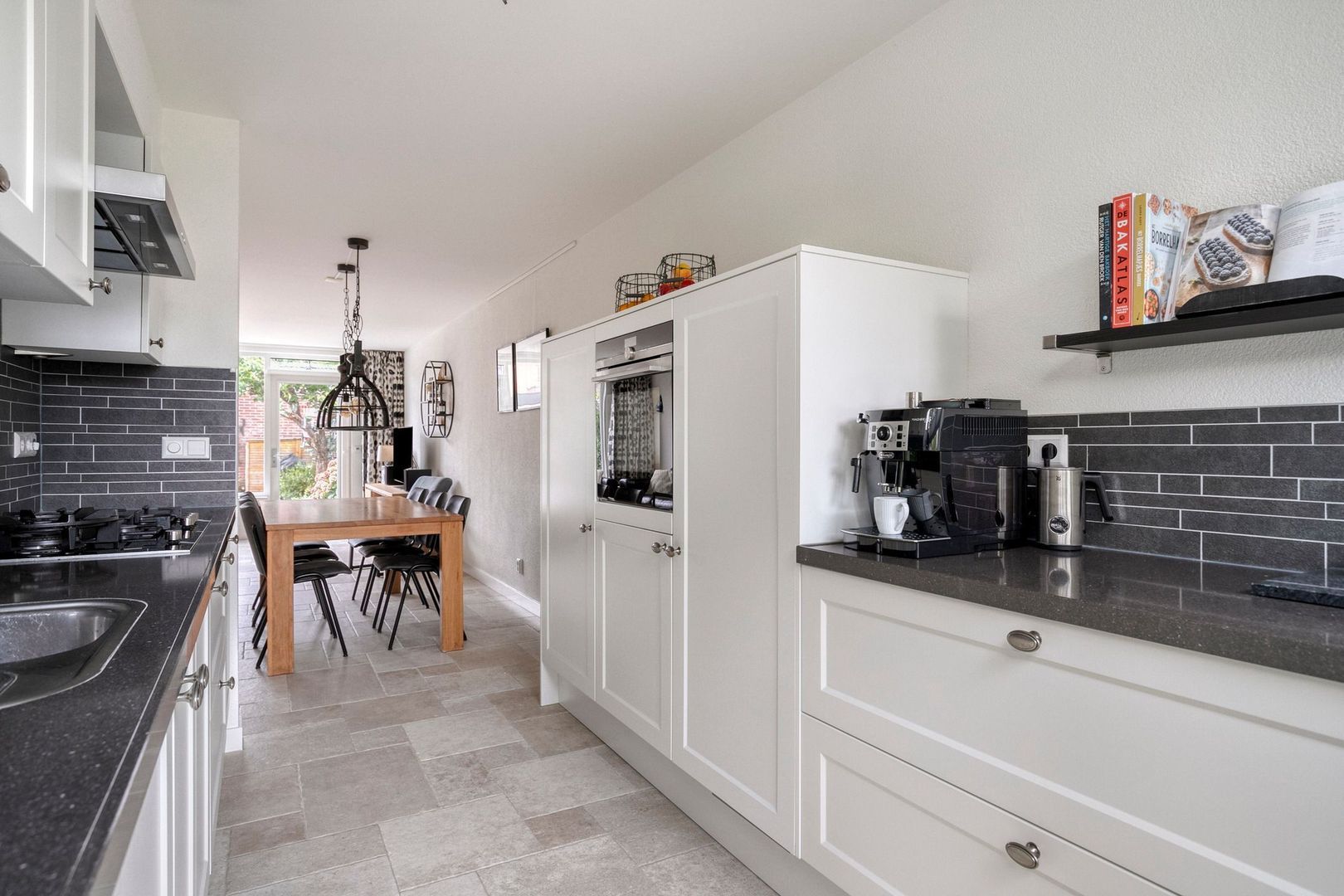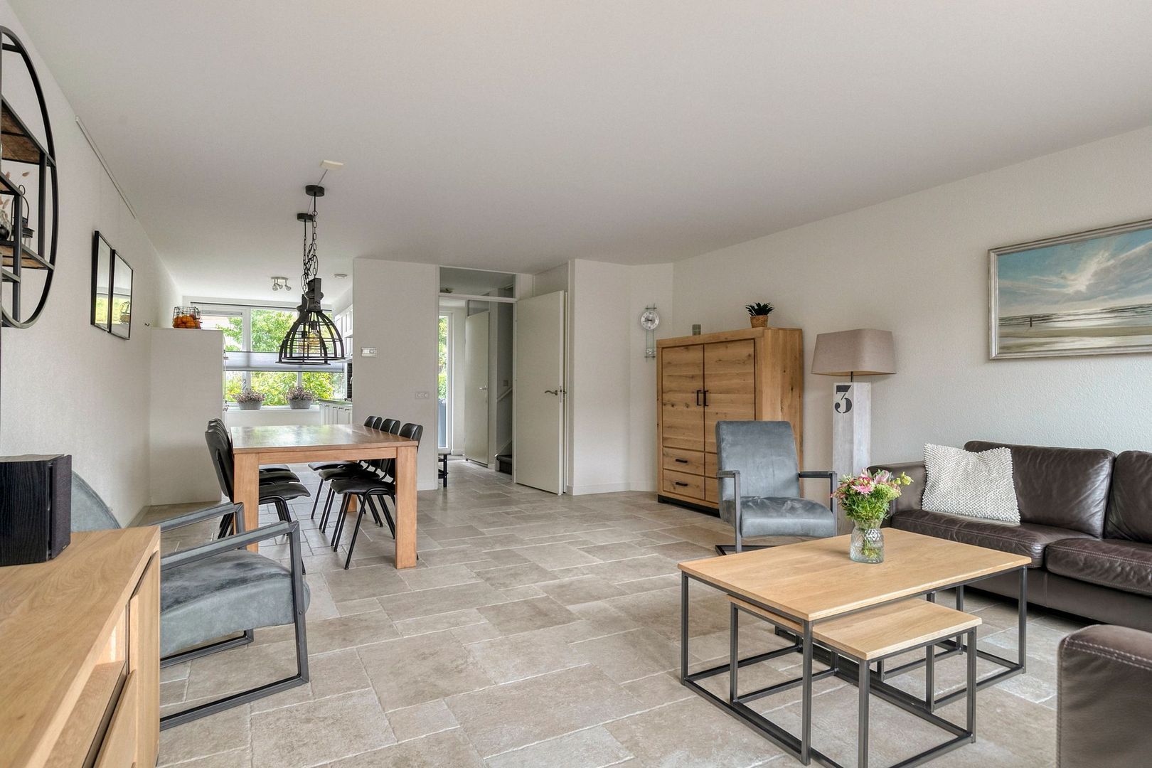 Bij binnenkomst valt direct de ruime woonkamer op. Onder de trap zit een praktische kast, voor het opbergen van spullen. De open keuken is aan de voorzijde gelegen en uitgerust met een gasfornuis, afzuigkap, vaatwasser, combi oven, koelkast en vriezer. De fraaie erker in de keuken biedt vrij uitzicht op het groen.