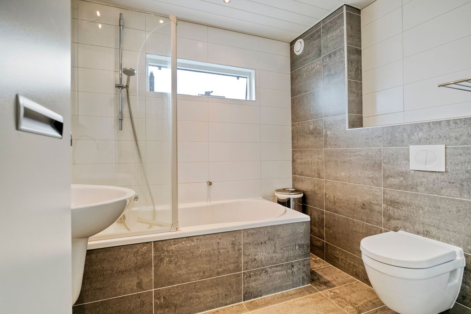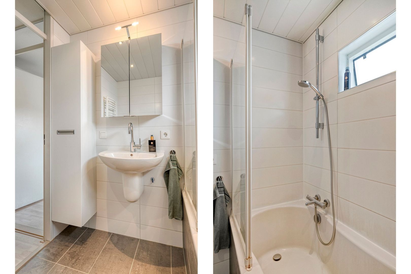 De badkamer is uitgerust met een ligbad, tweede toilet, spiegelkast, handdoekradiator, wastafel en handdoekenkast.